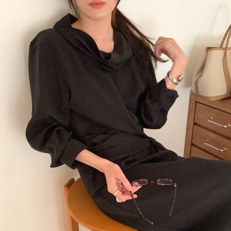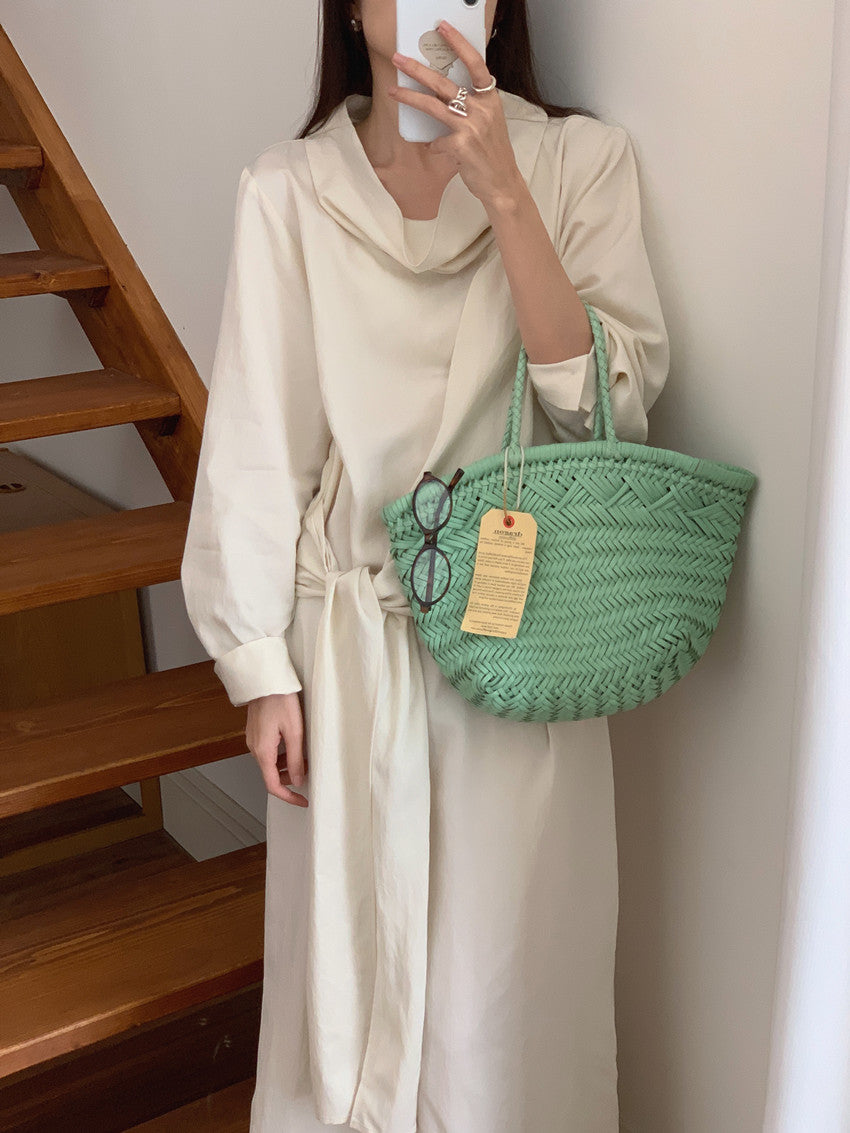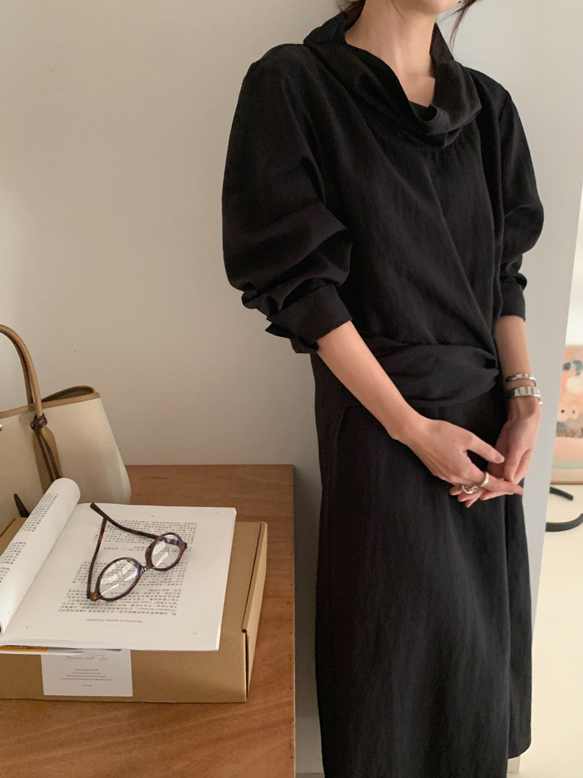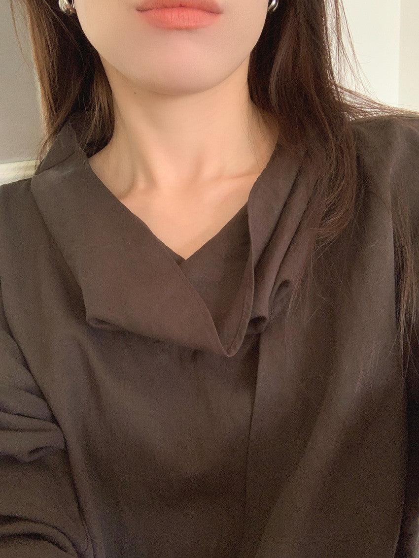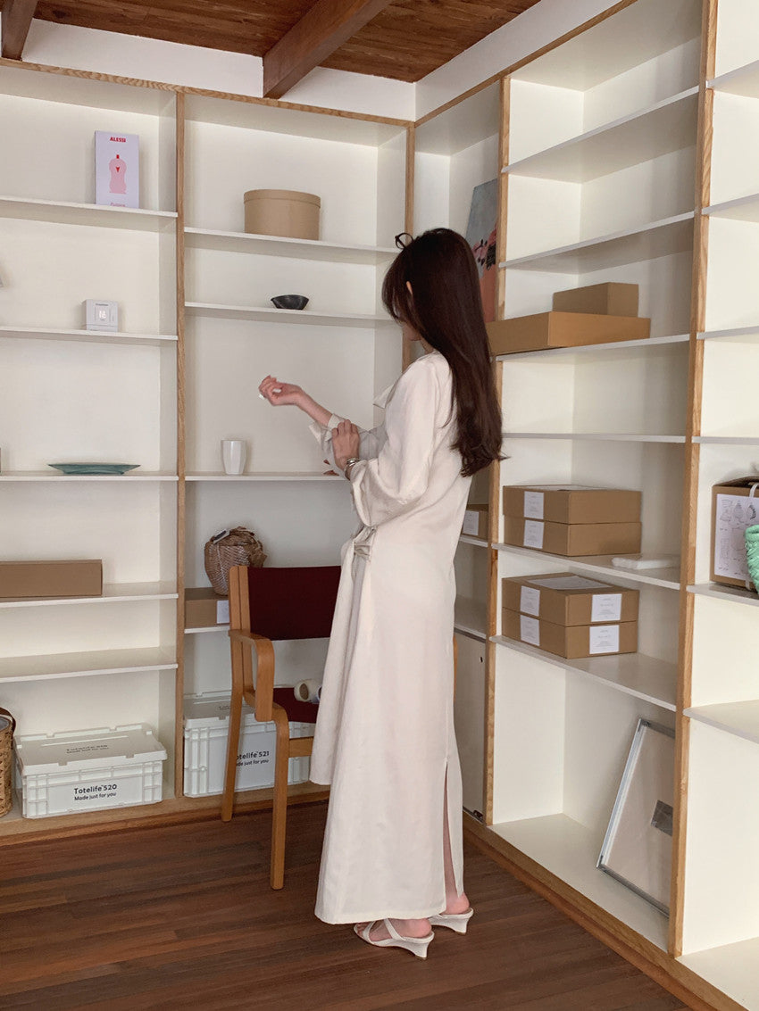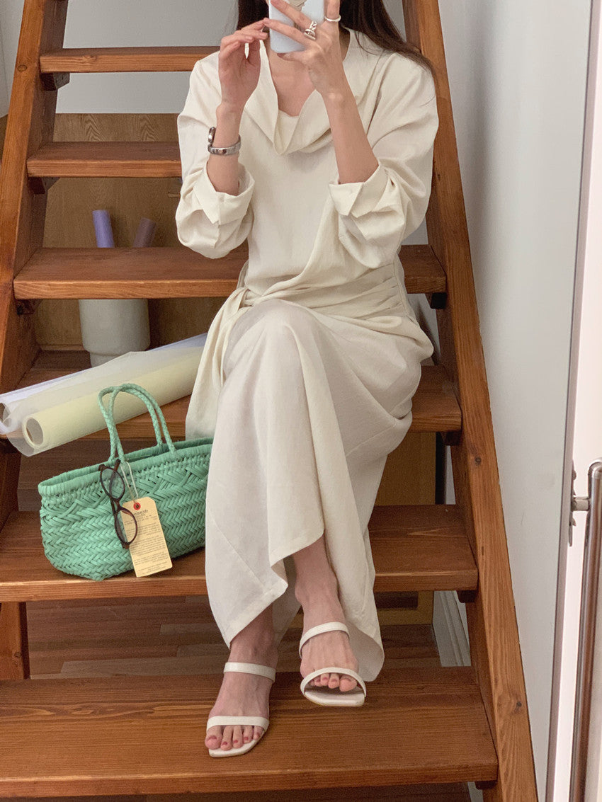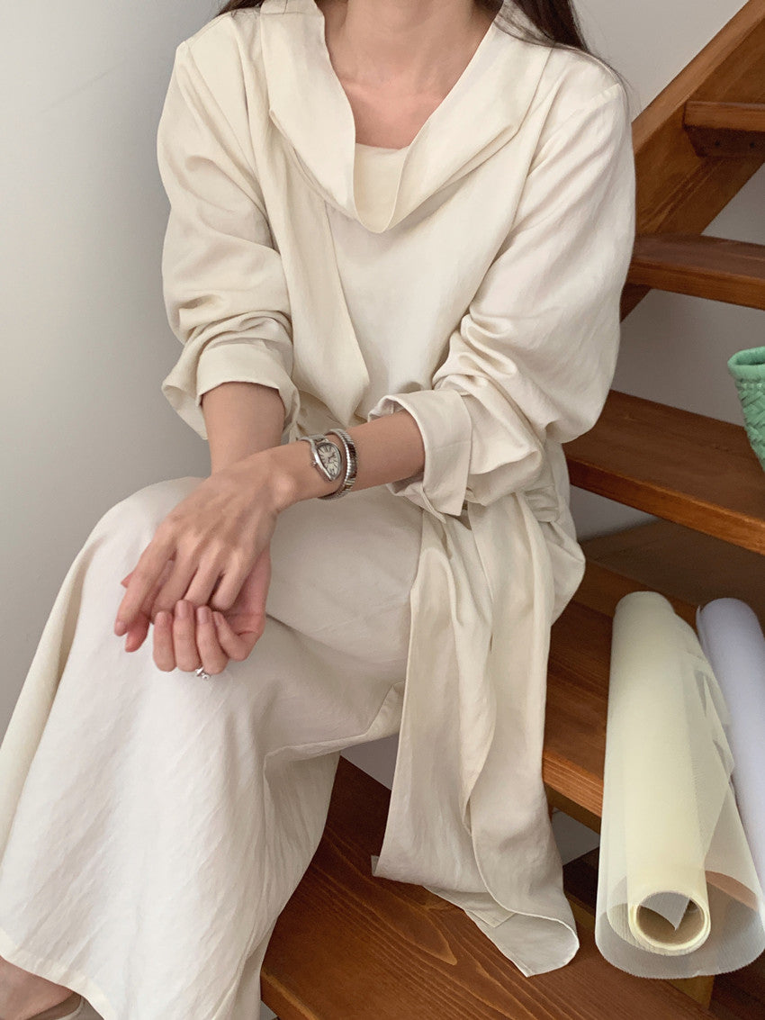【F60136】實拍法式復古優雅氣質立領寬鬆大綁帶長袖洋裝250212