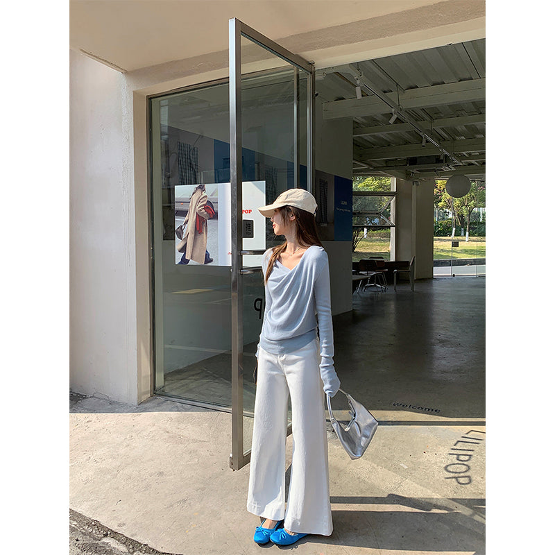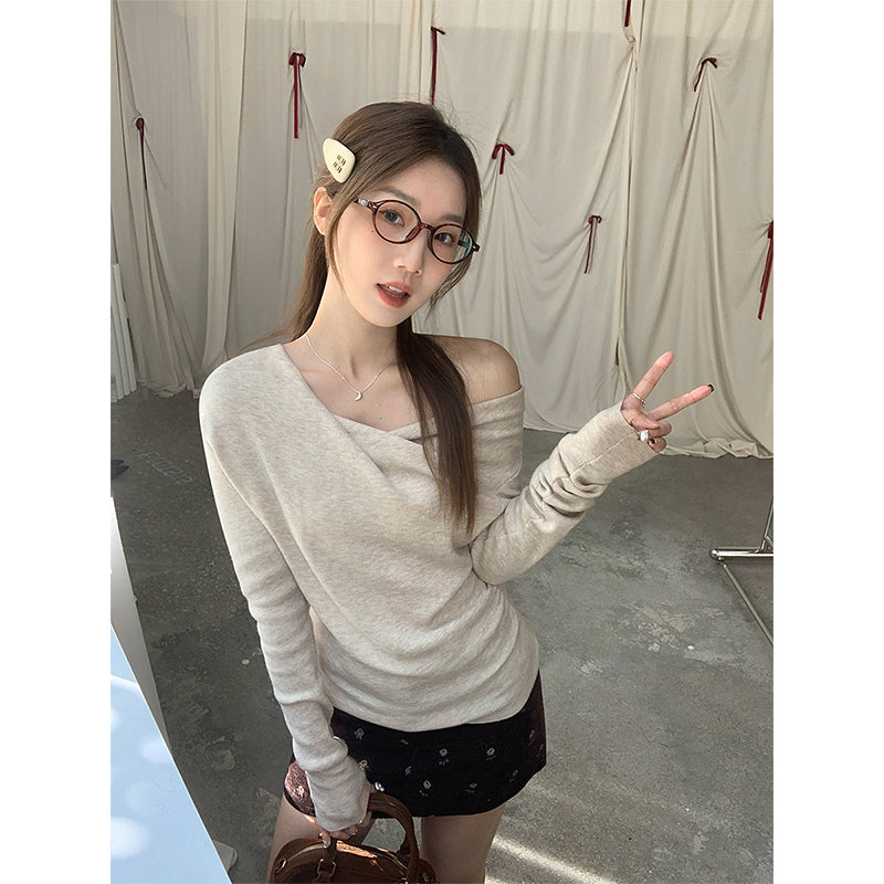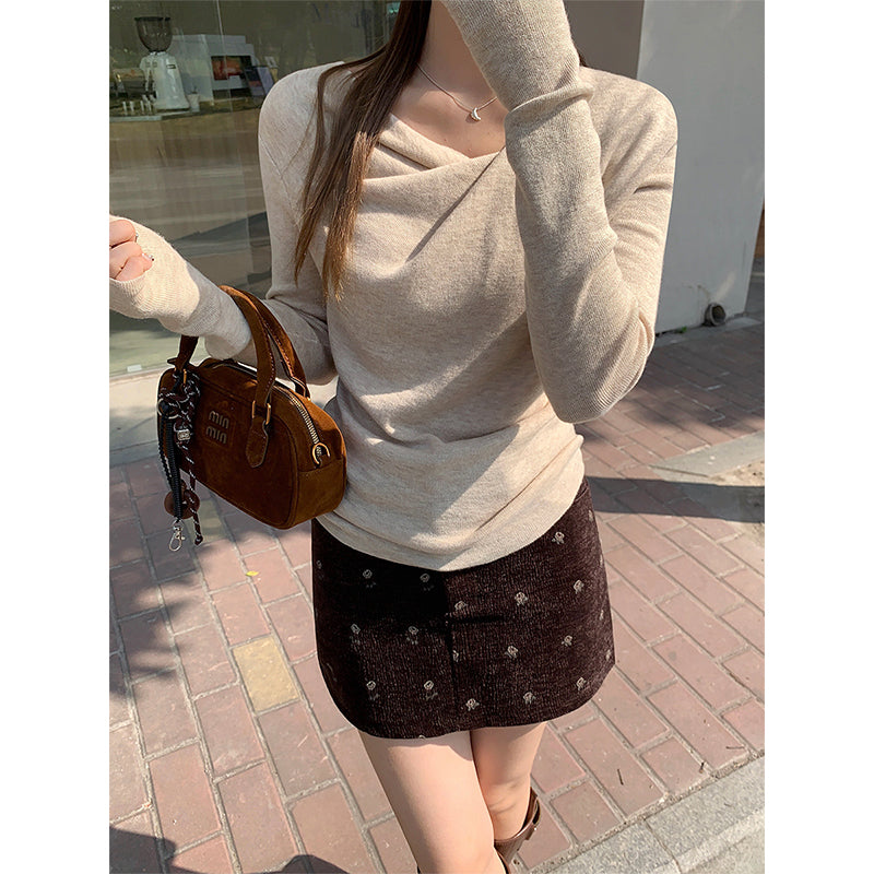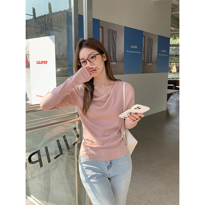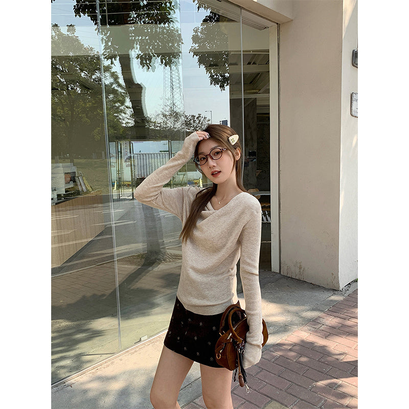 【F60149】實拍法式扭褶斜領羊絨長袖針織衫250218