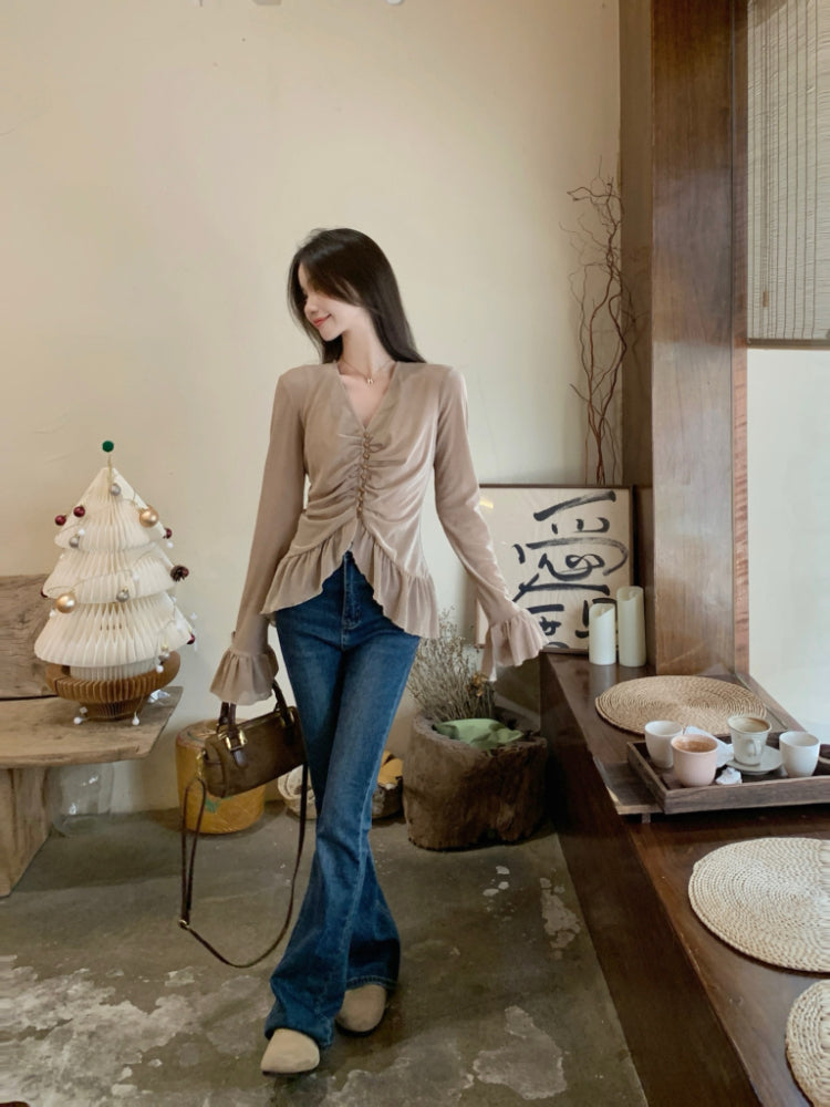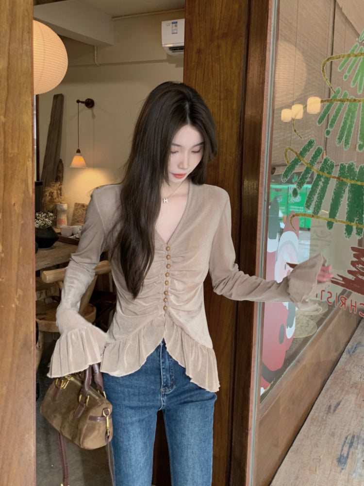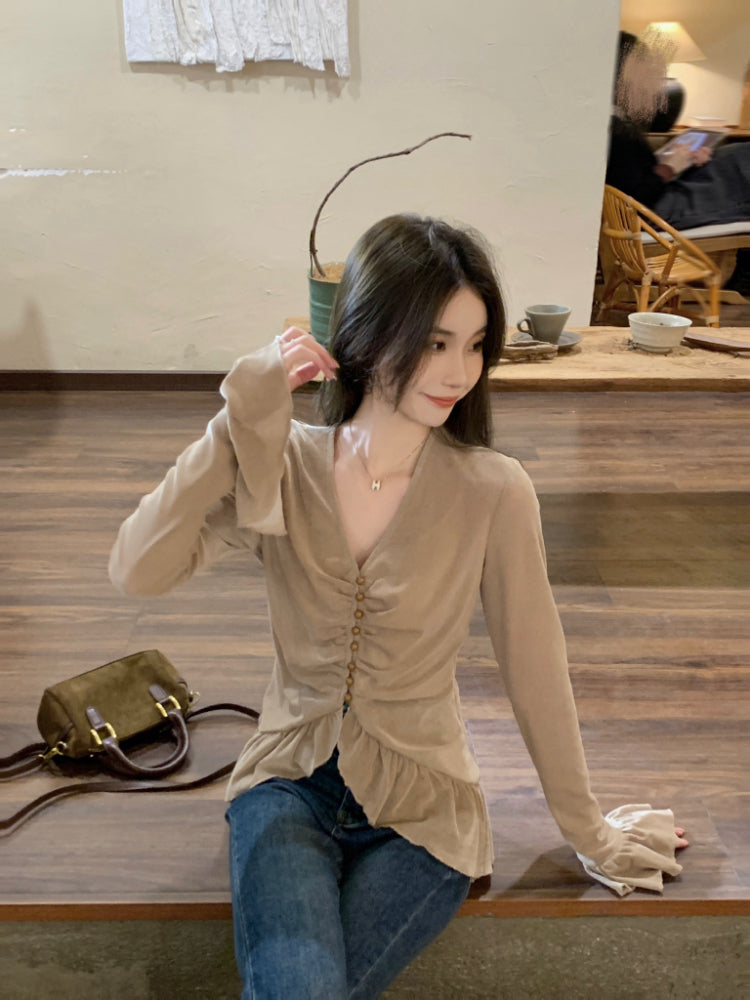 【F60168】實拍韓系氣質荷葉打摺喇叭袖襯衫250218