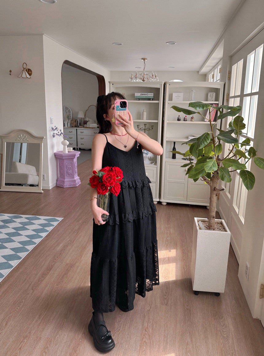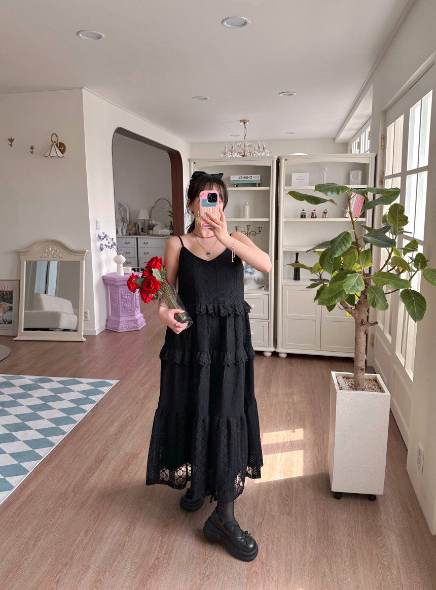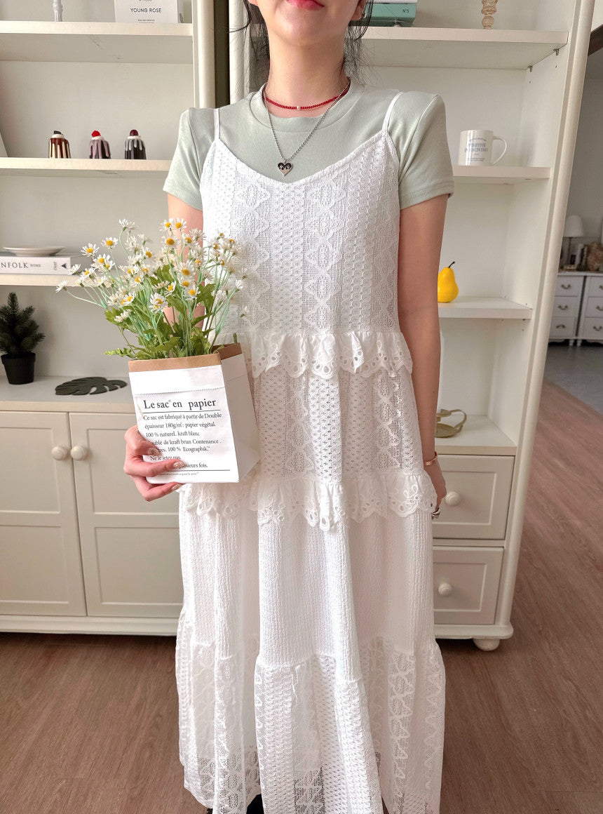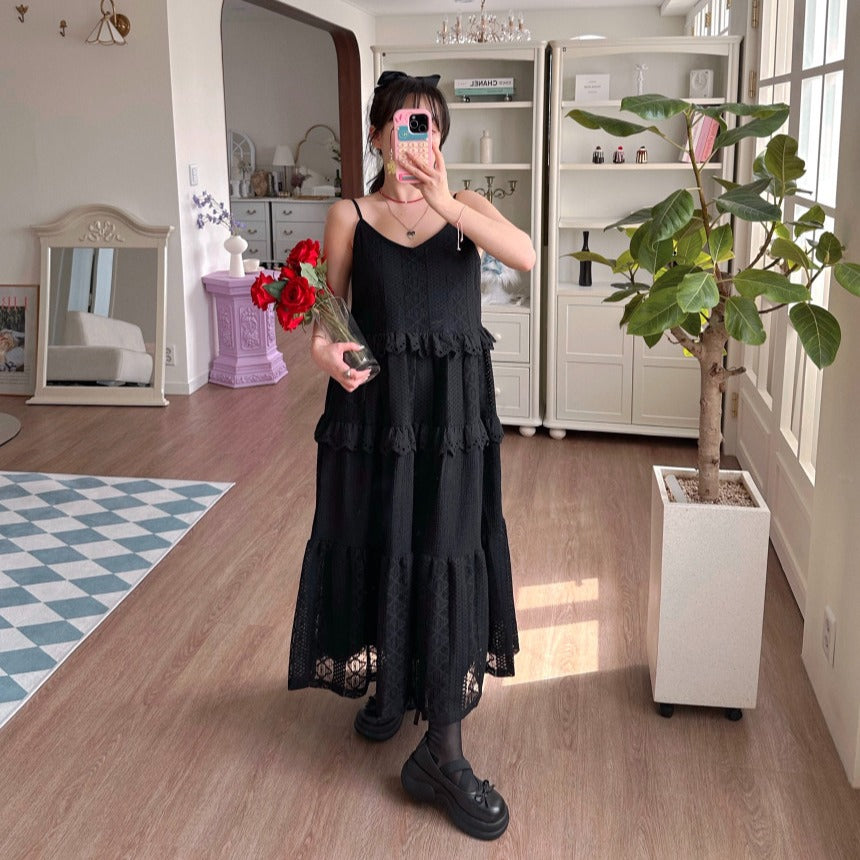【F60182】韓國東大門蕾絲鏤空拼接蕾絲吊帶洋裝250225