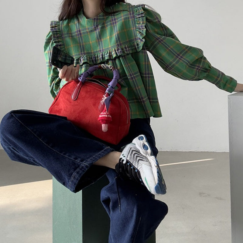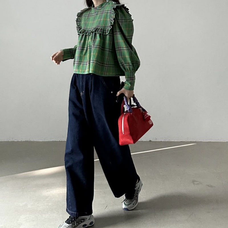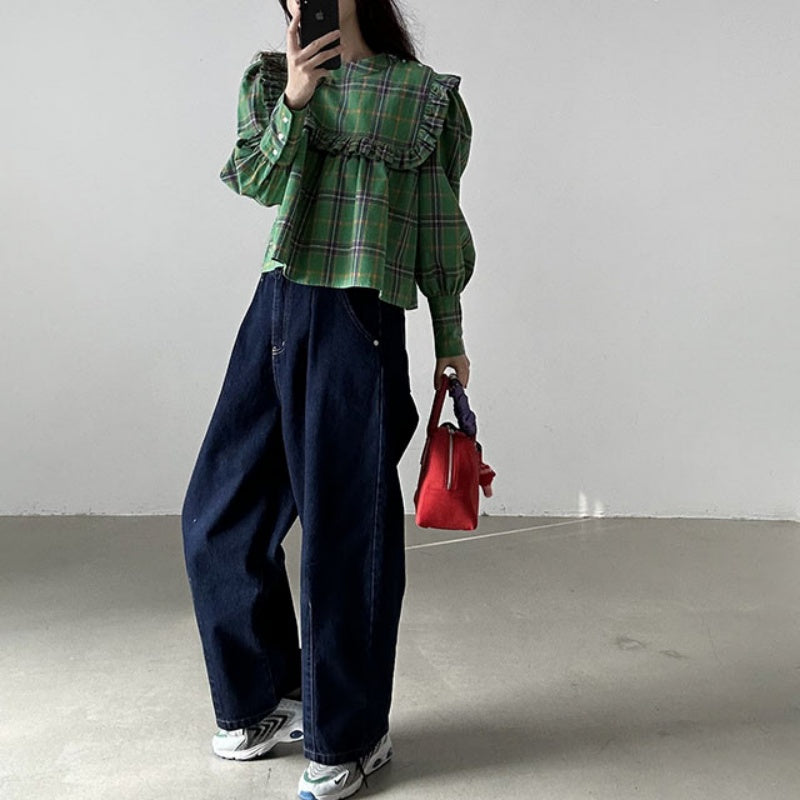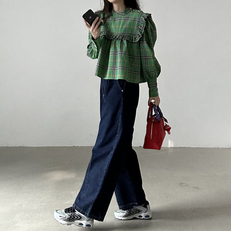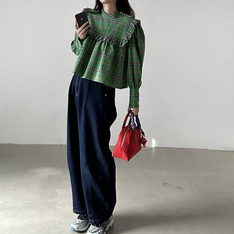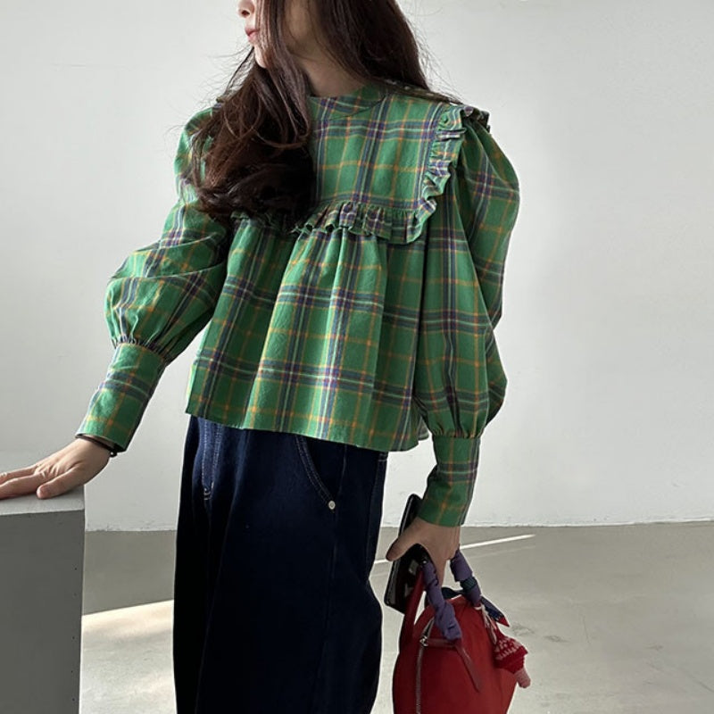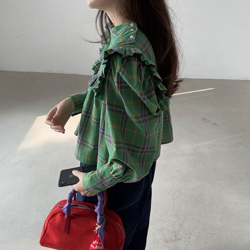 【F60197】現貨韓國復古氣質荷葉格紋寬鬆長袖襯衫250225