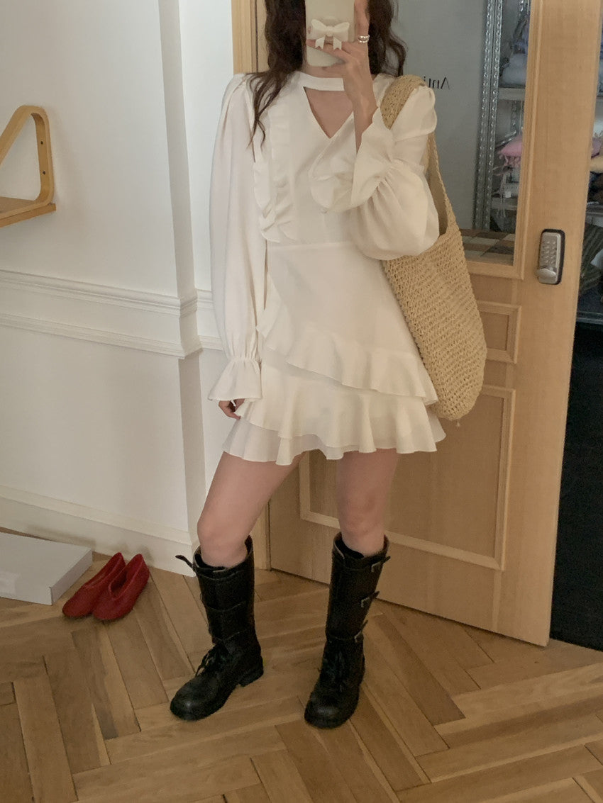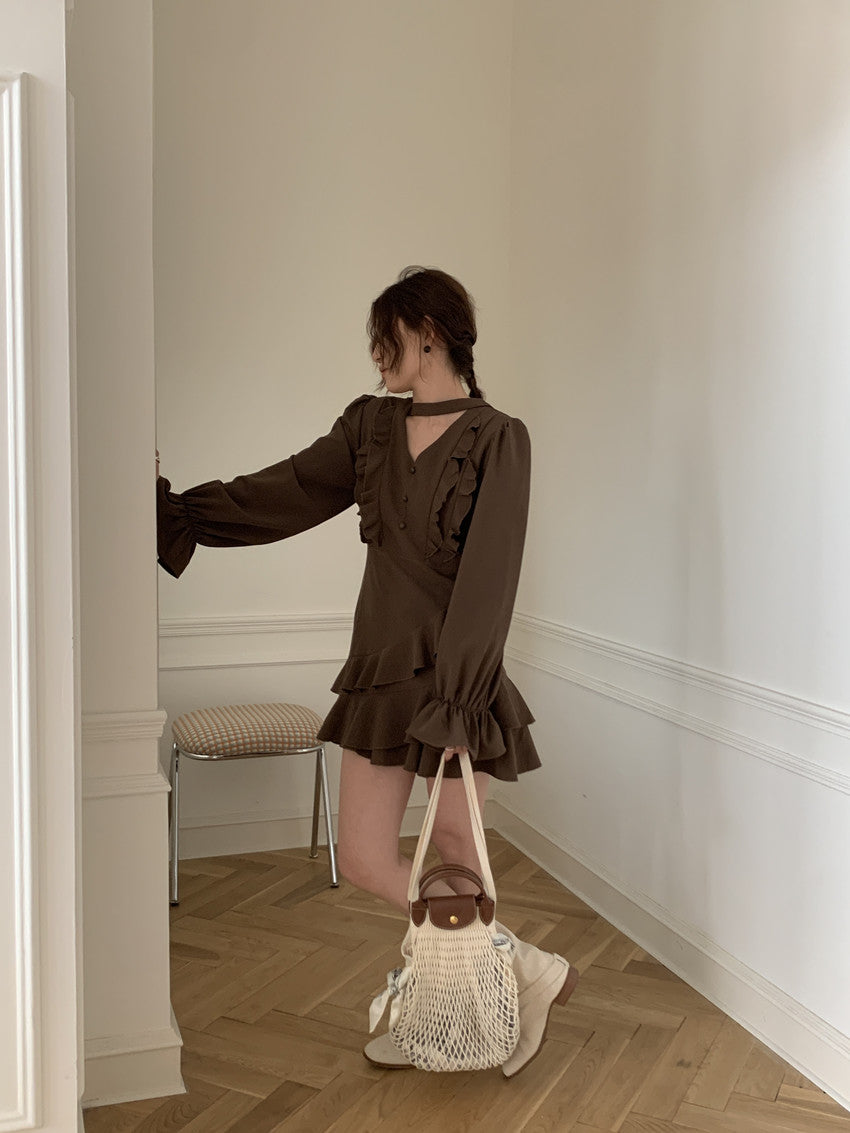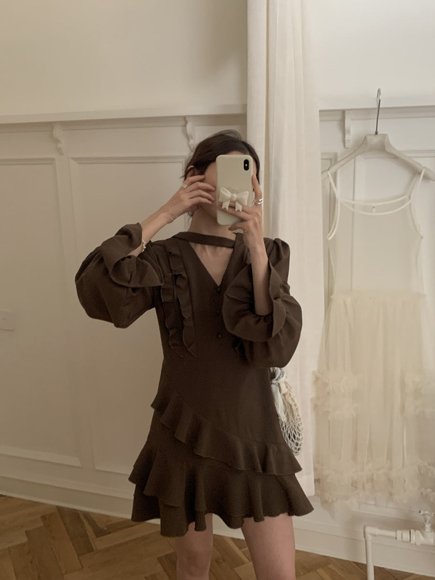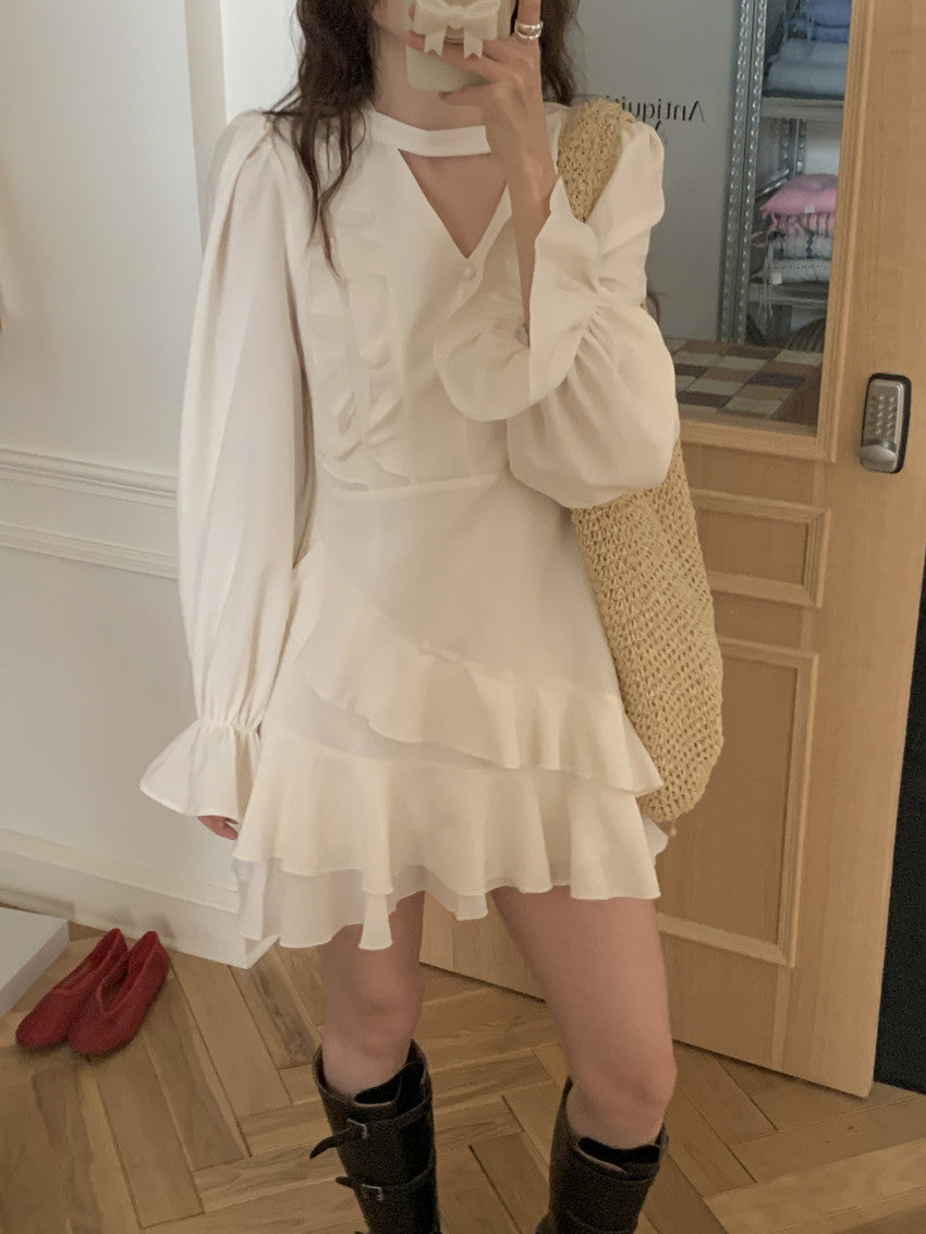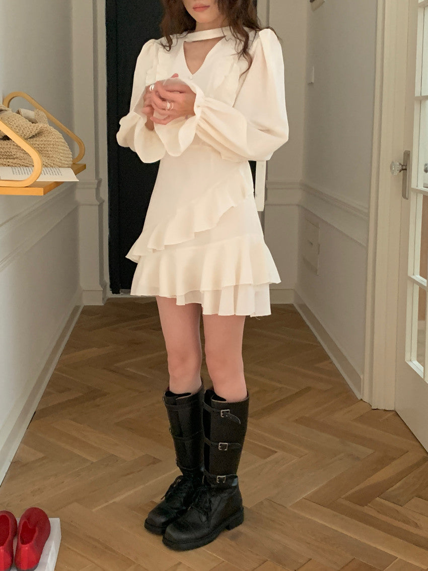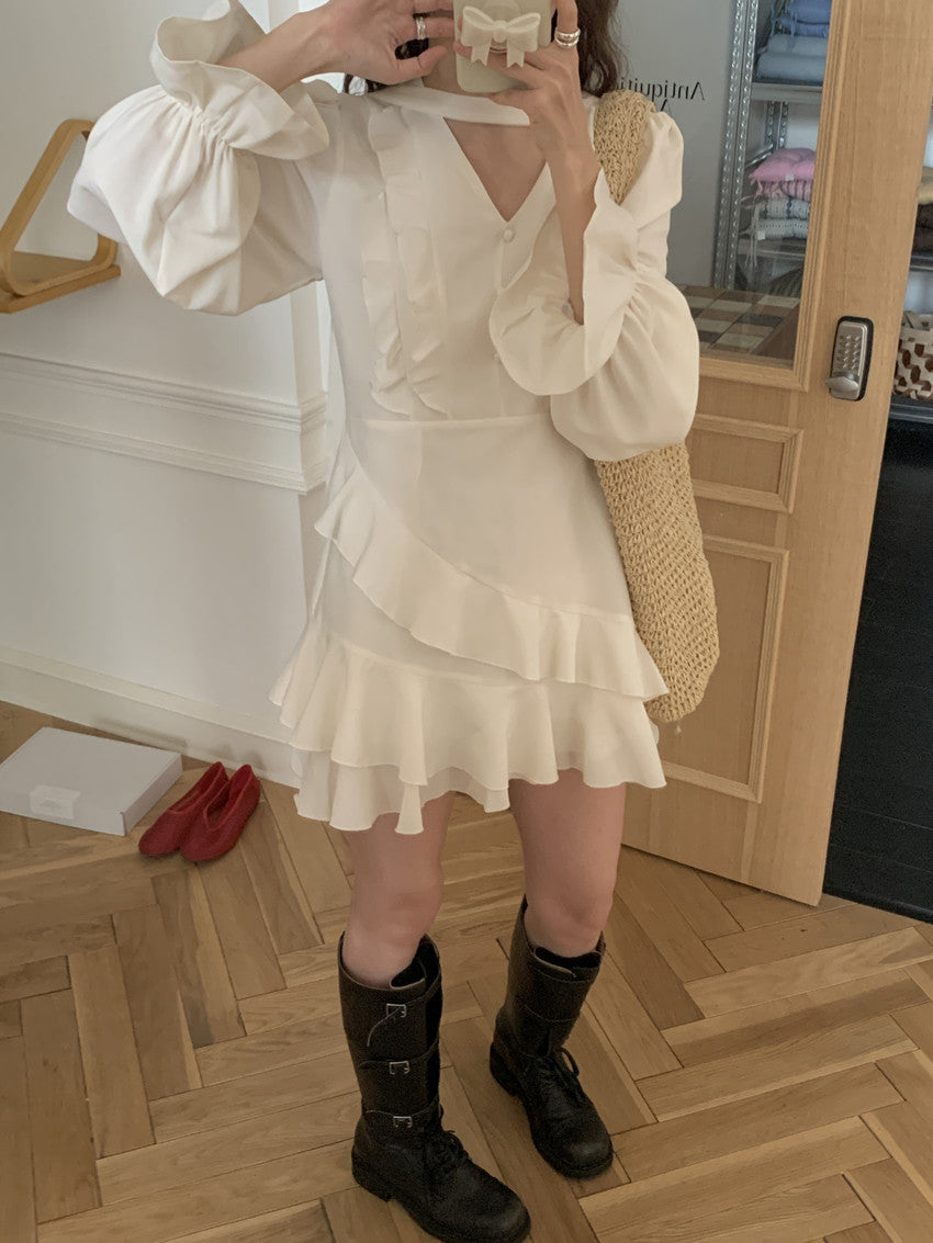 【F60201】實拍法式温柔飄帶V領荷葉長袖短洋裝250225