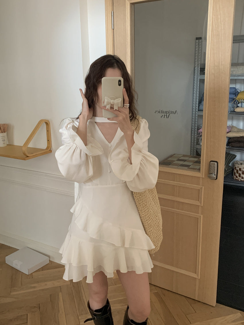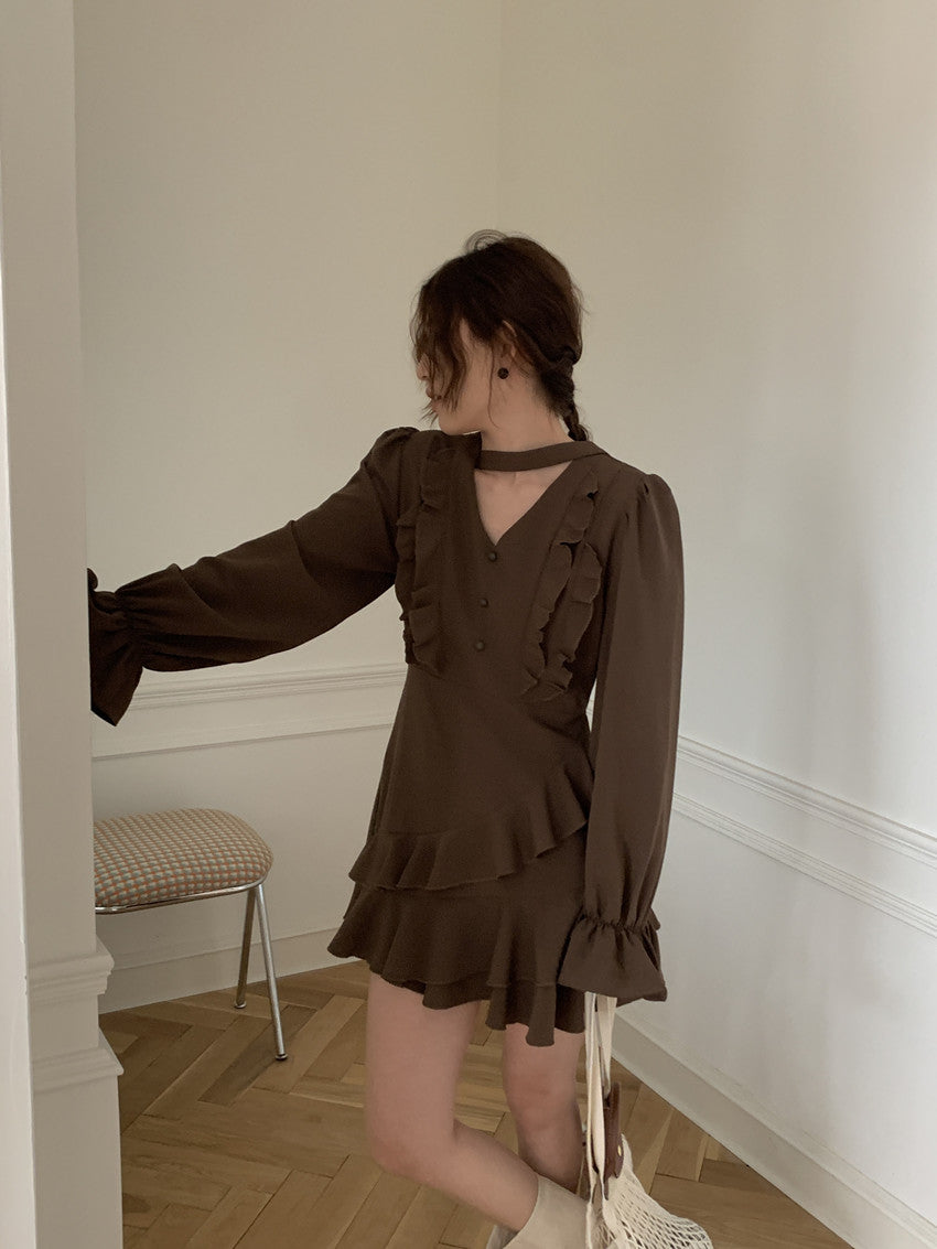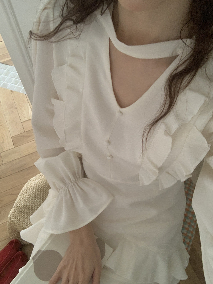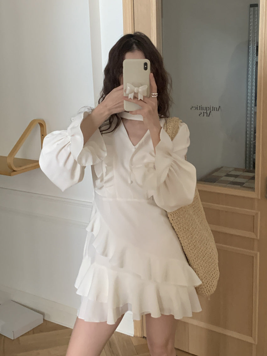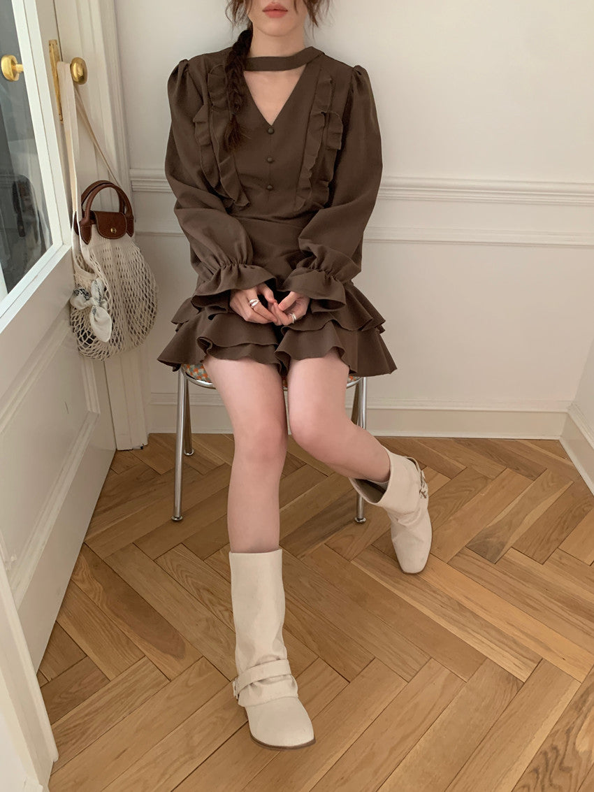 【F60201】實拍法式温柔飄帶V領荷葉長袖短洋裝250225