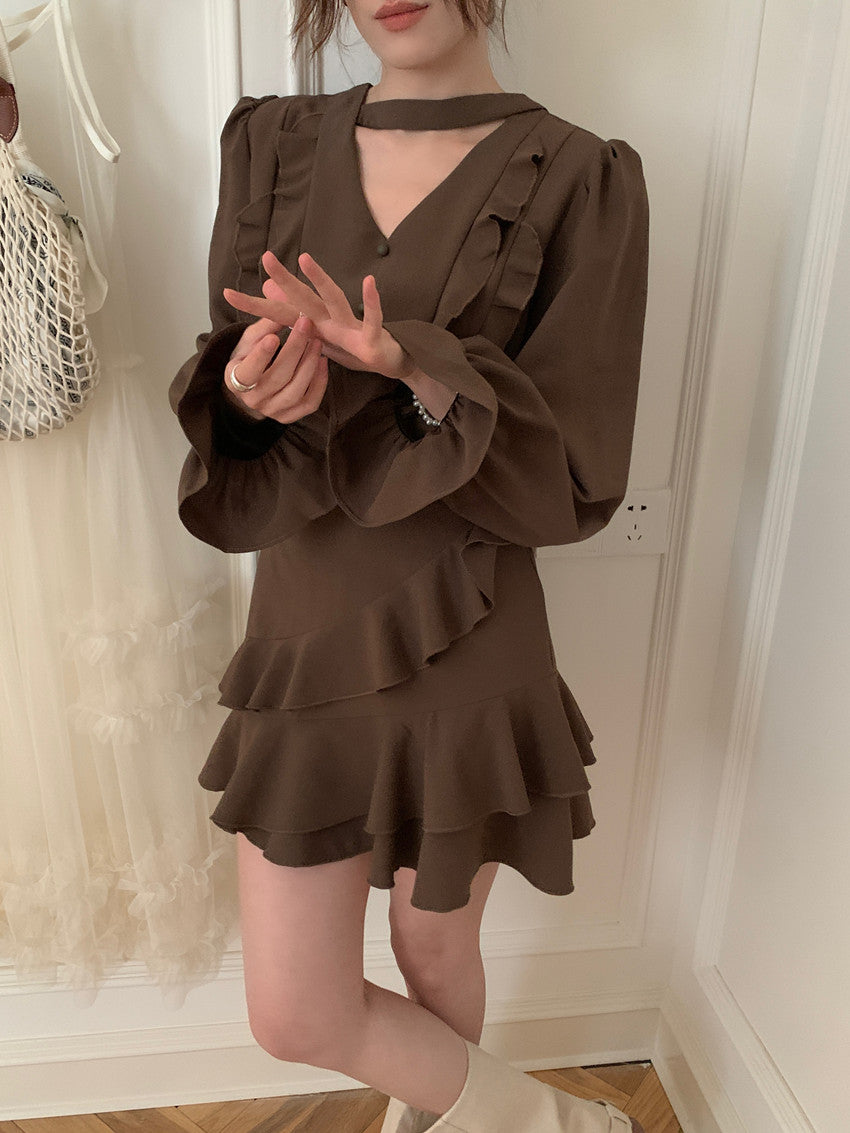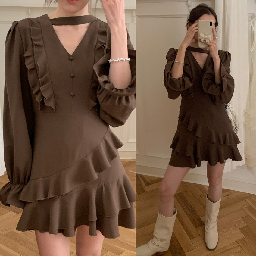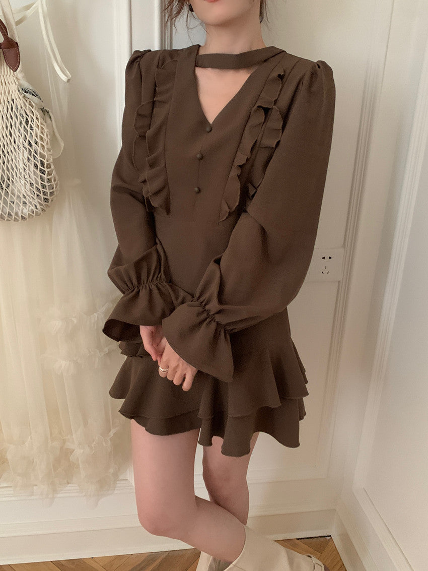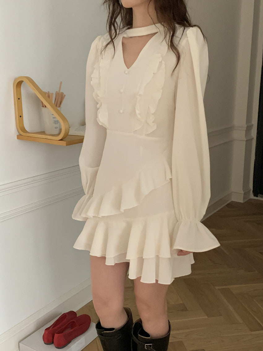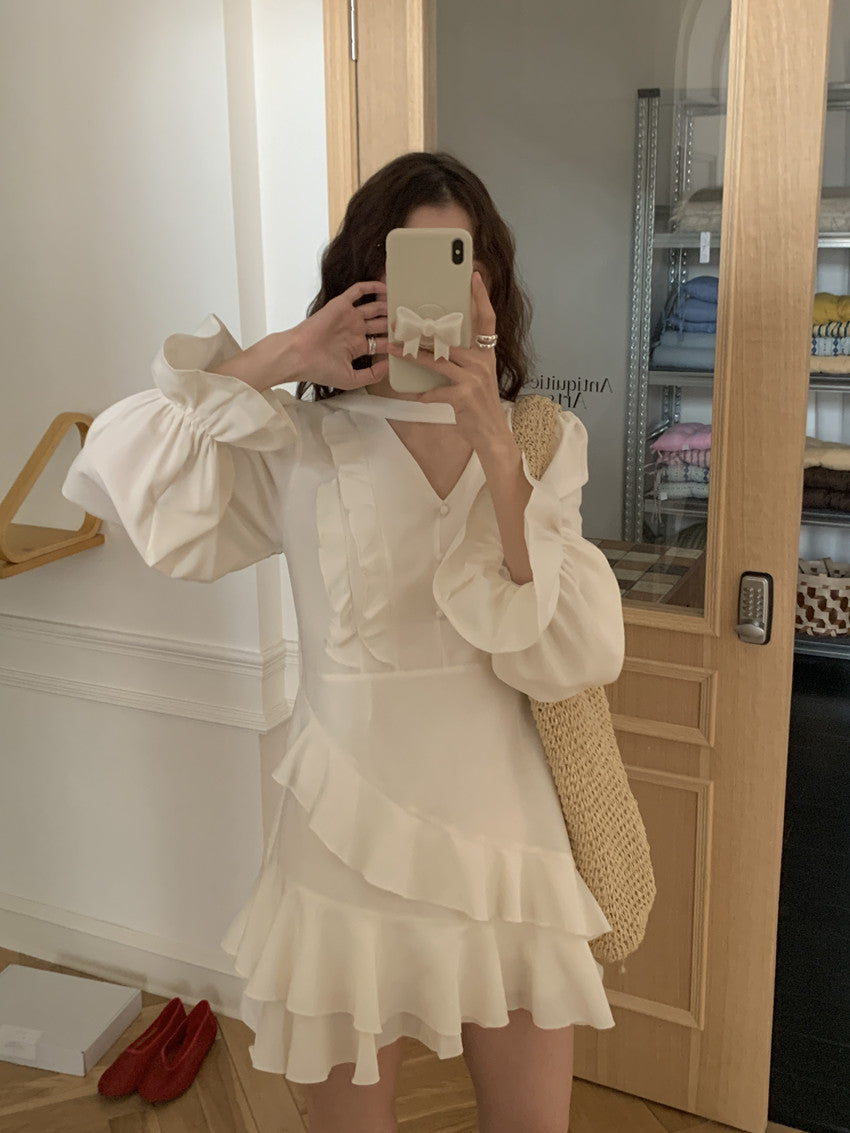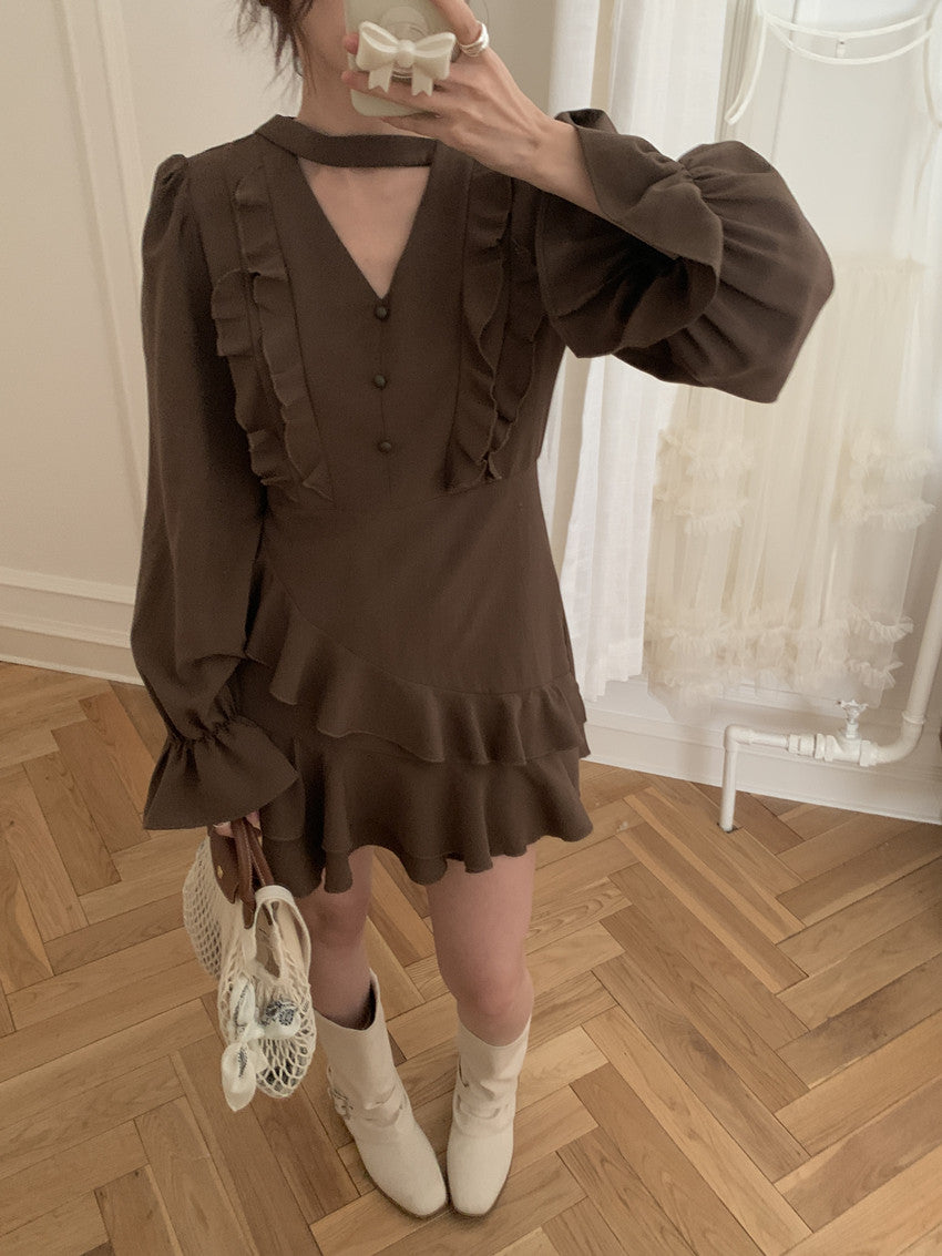 【F60201】實拍法式温柔飄帶V領荷葉長袖短洋裝250225