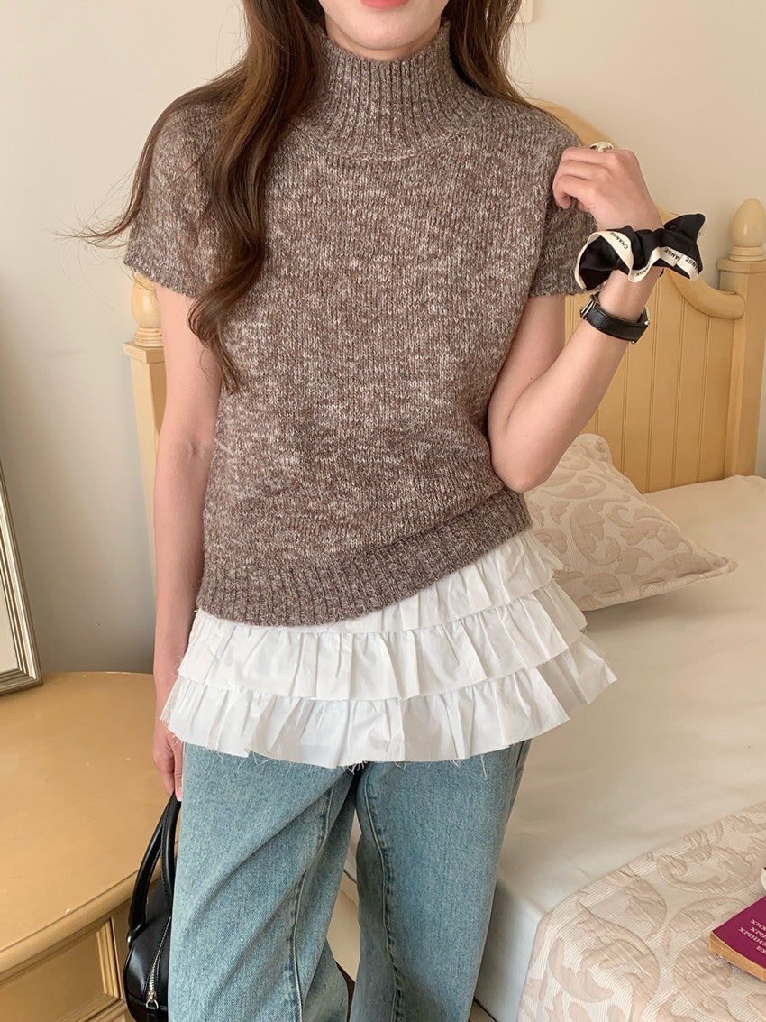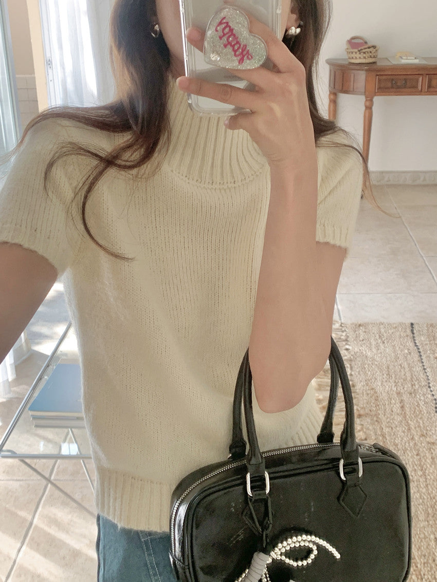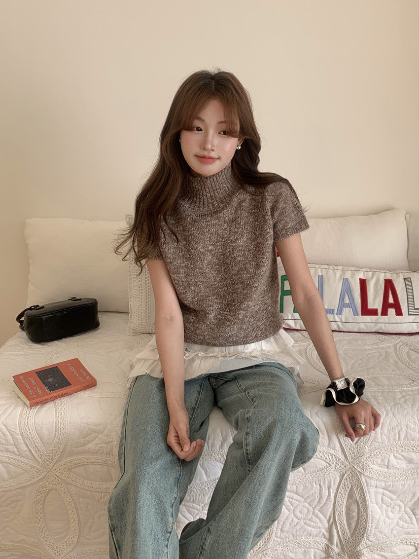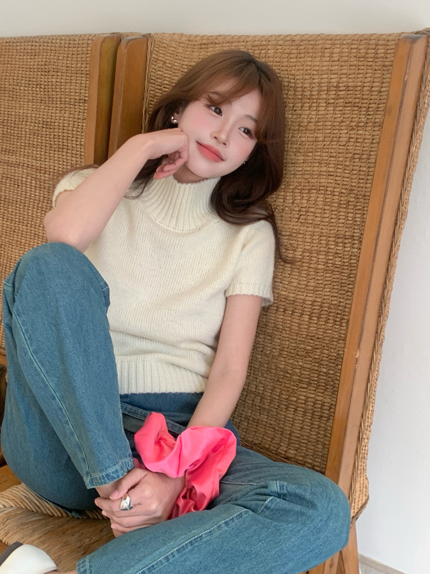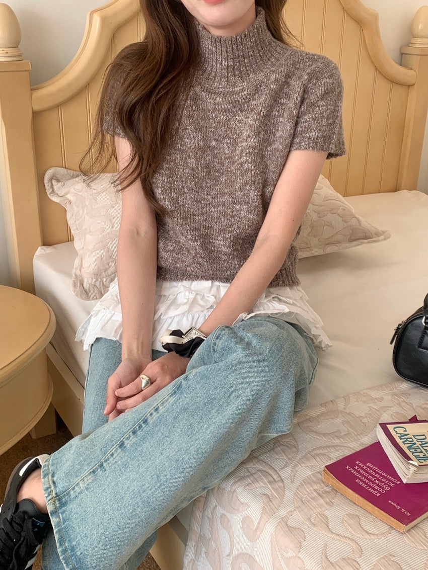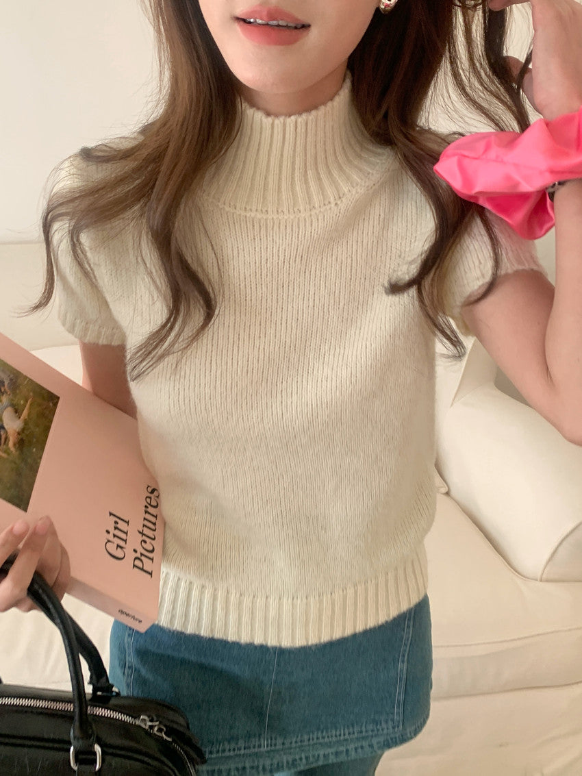 【F60203】實拍温柔氣質 復古慵懶半高領短袖針織衫250225