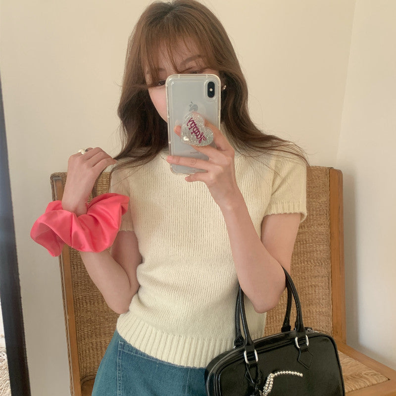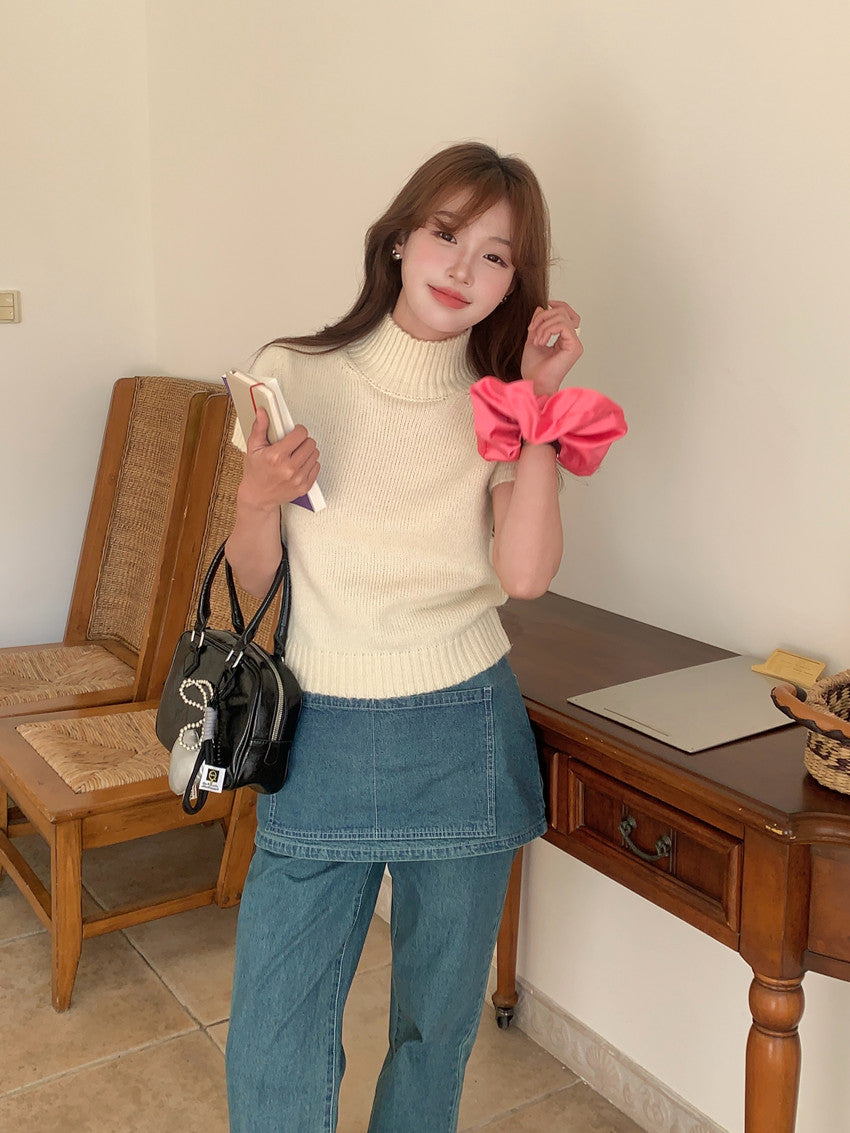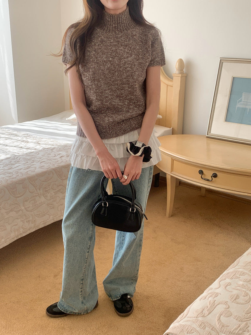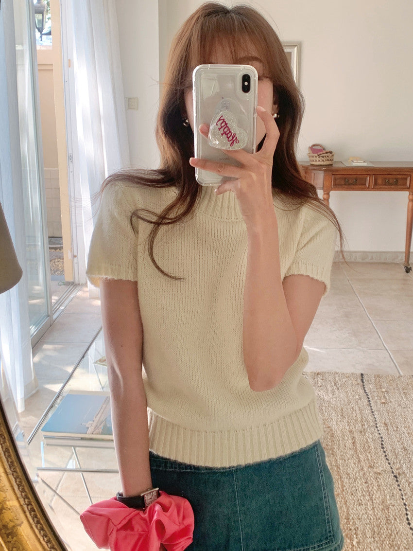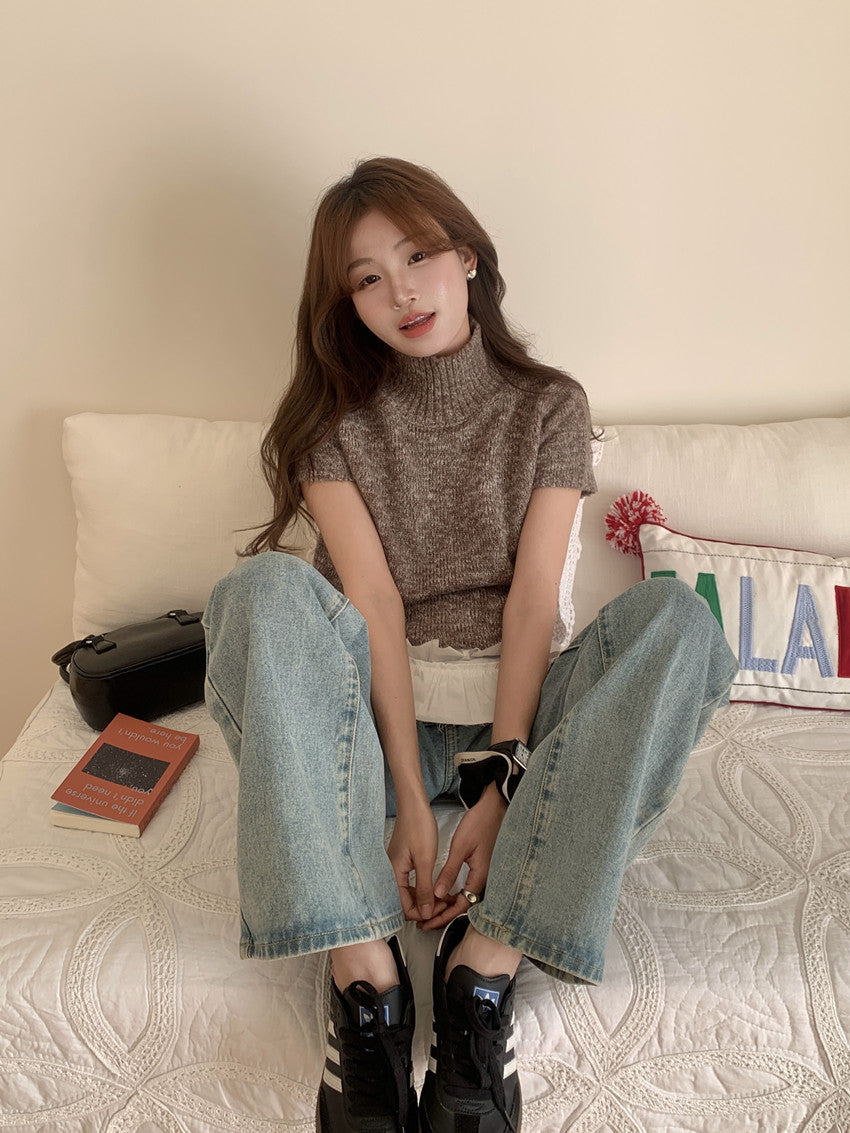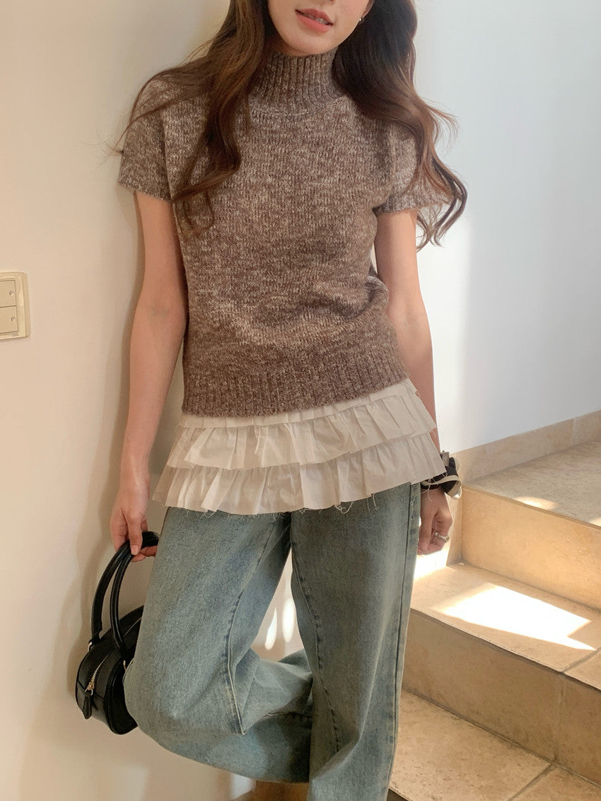 【F60203】實拍温柔氣質 復古慵懶半高領短袖針織衫250225