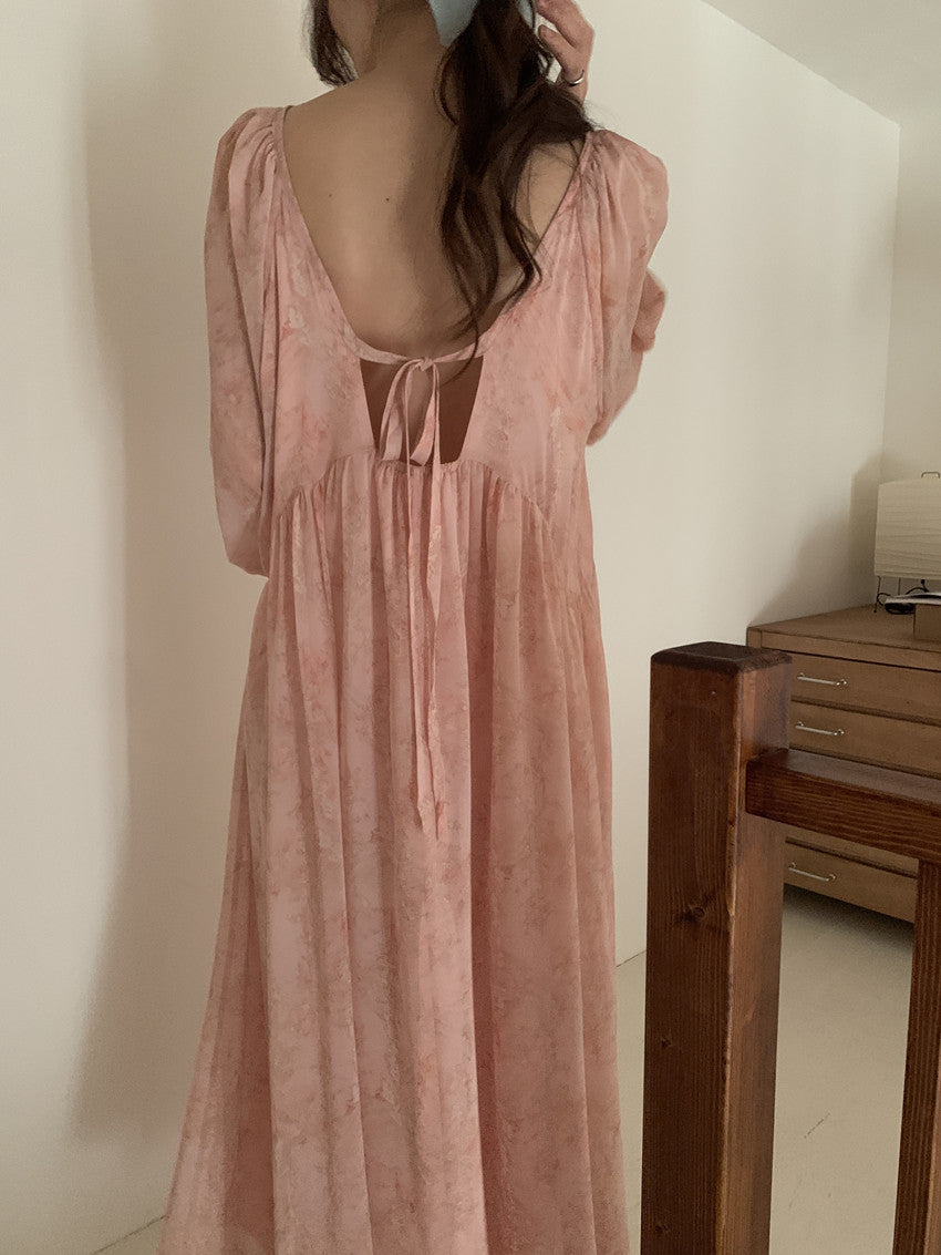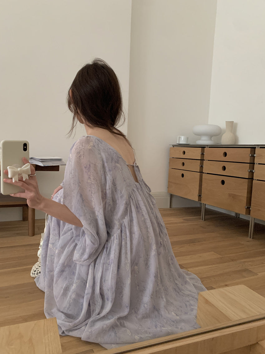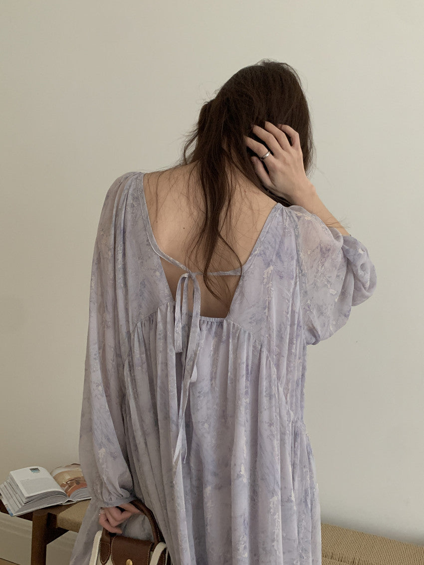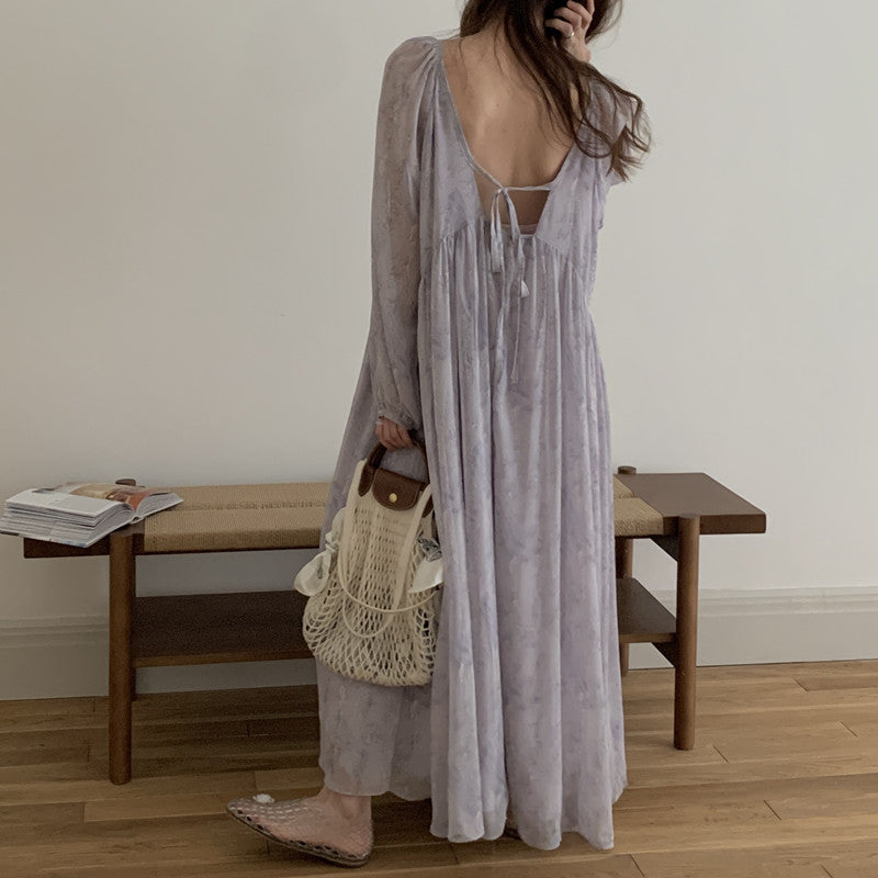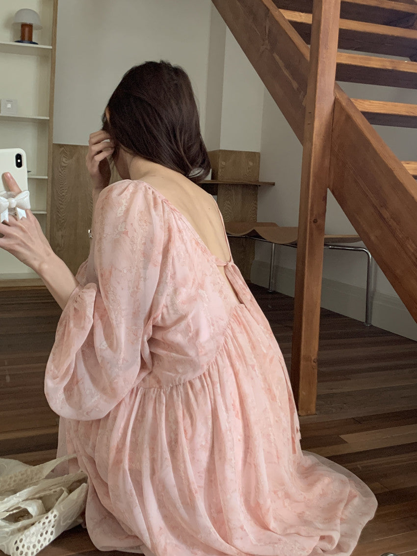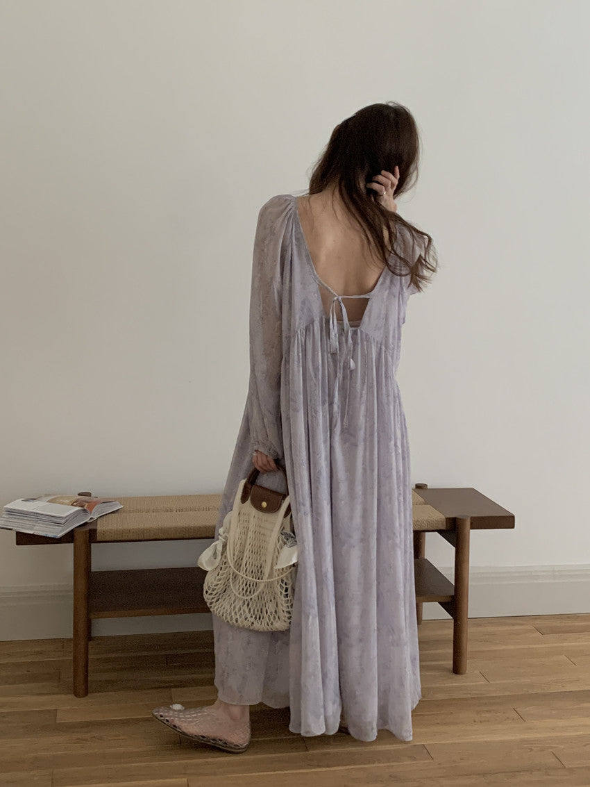【F60208】實拍仙氣飄飄碎花大露背設計寬鬆長雪紡洋裝250225