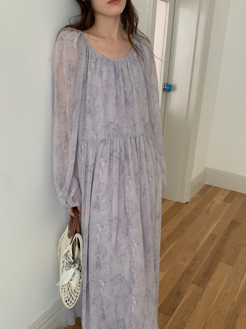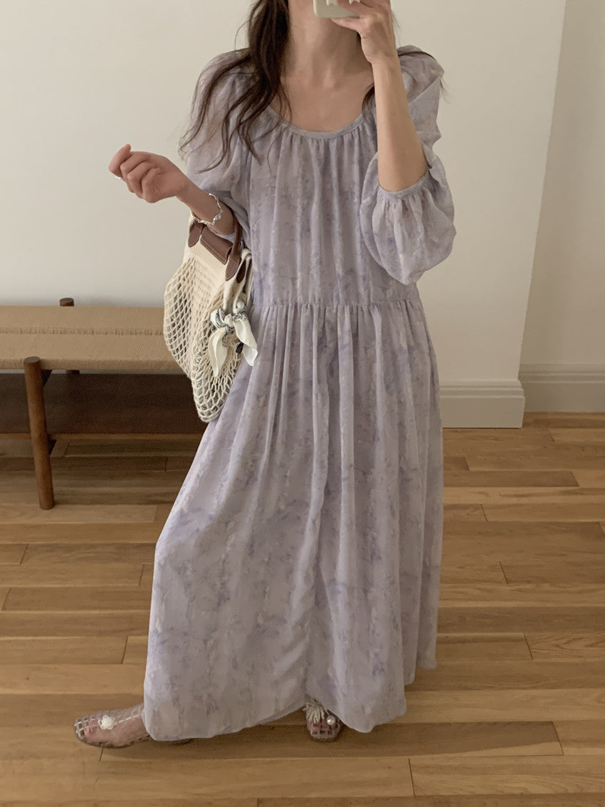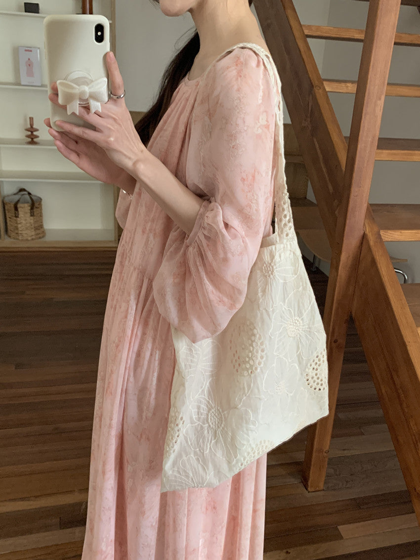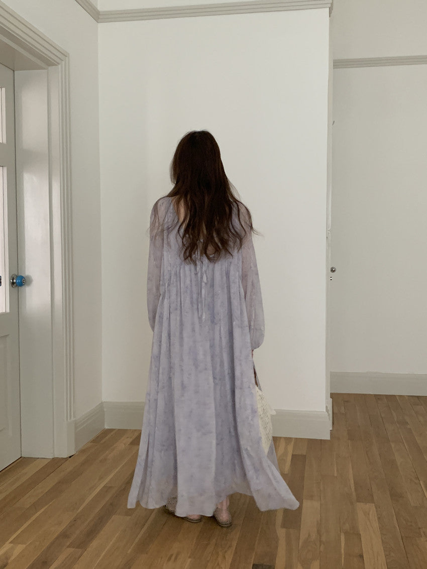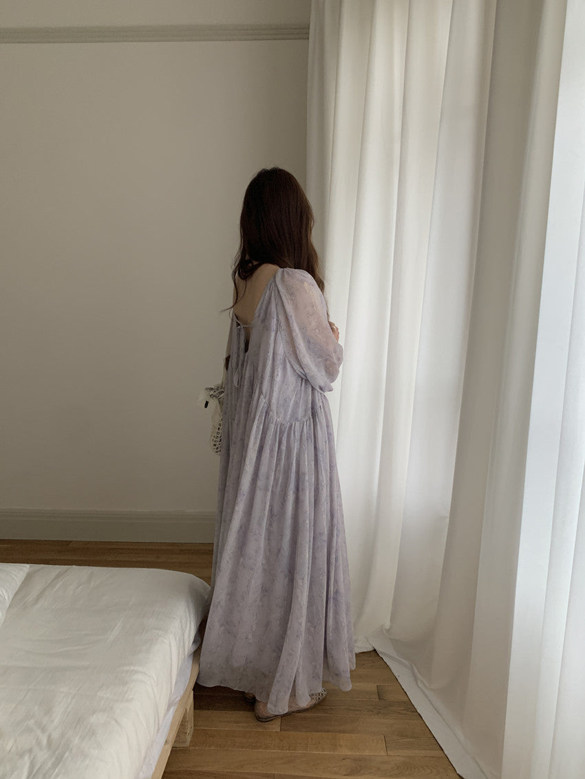 【F60208】實拍仙氣飄飄碎花大露背設計寬鬆長雪紡洋裝250225