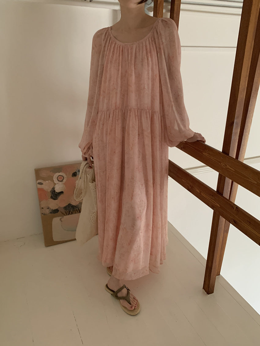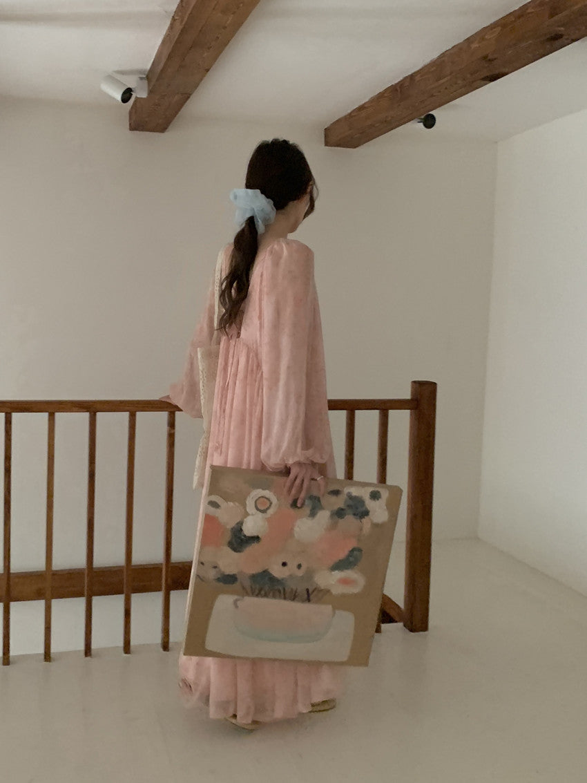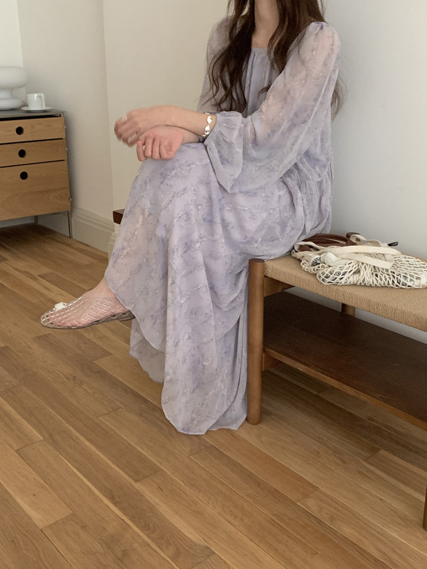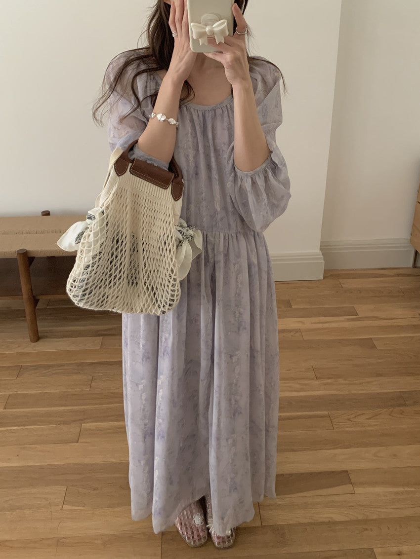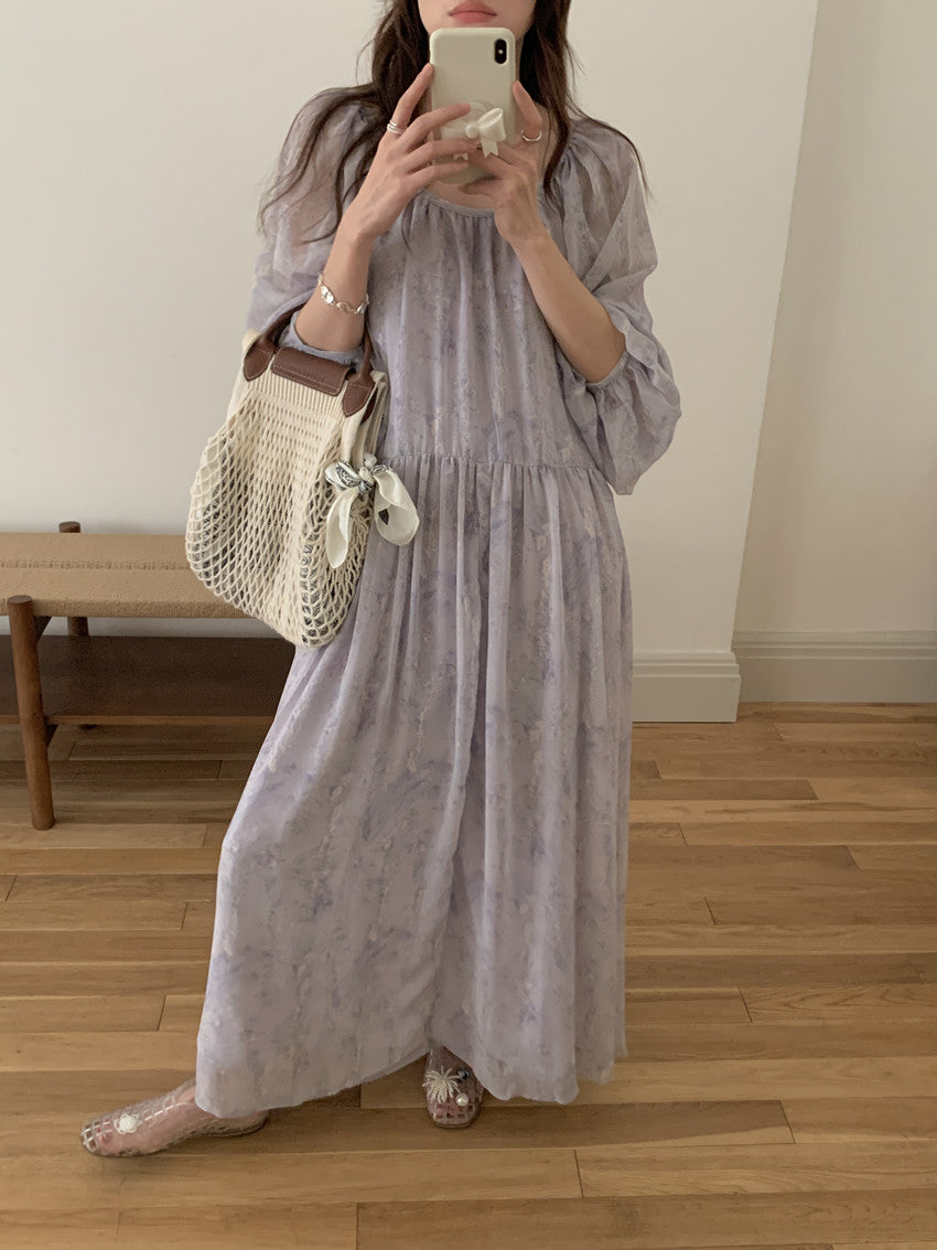 【F60208】實拍仙氣飄飄碎花大露背設計寬鬆長雪紡洋裝250225