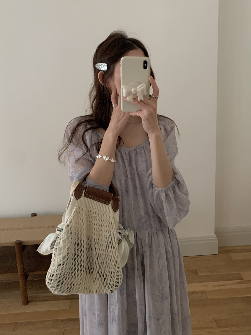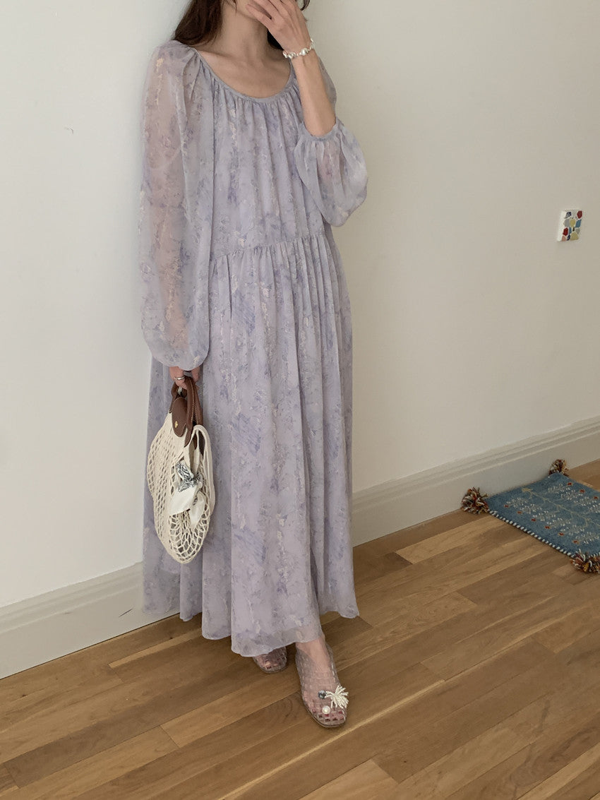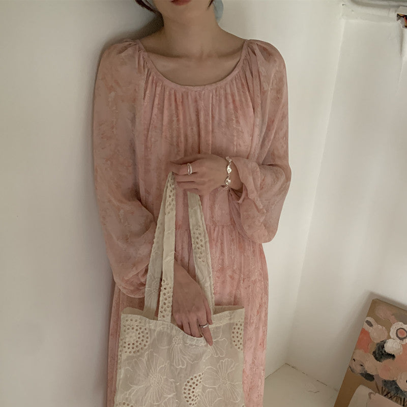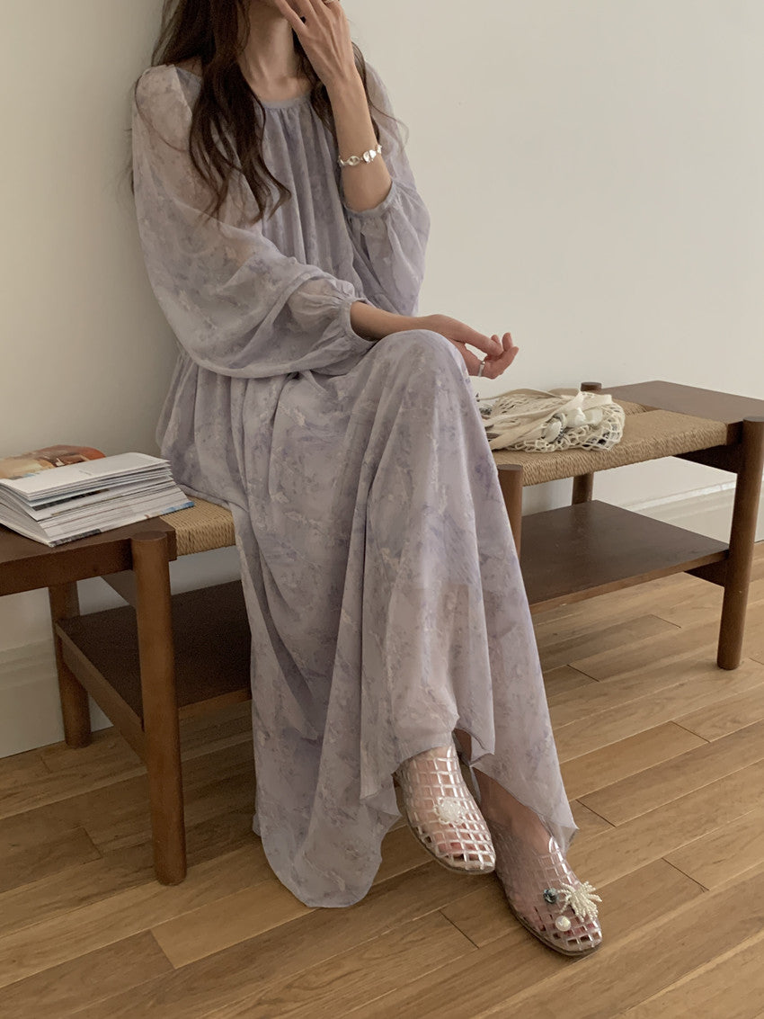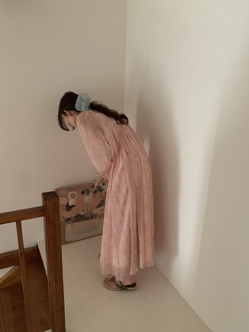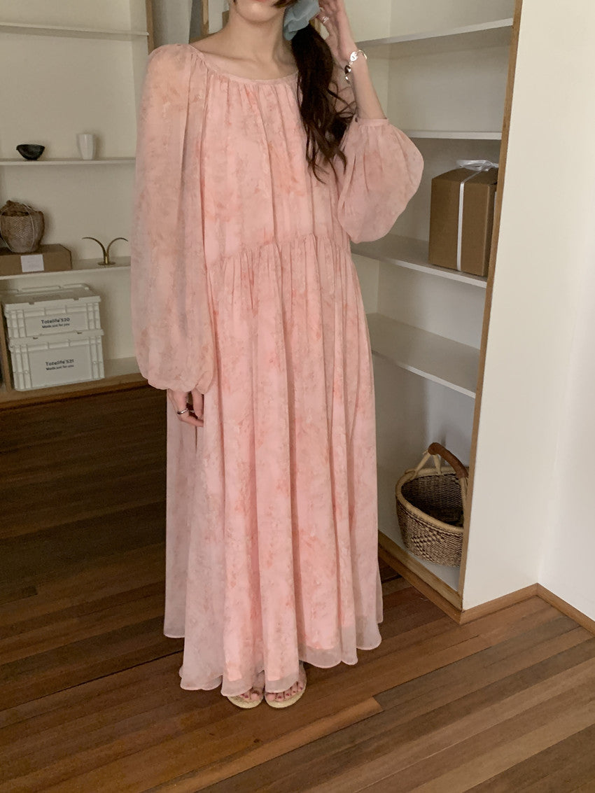 【F60208】實拍仙氣飄飄碎花大露背設計寬鬆長雪紡洋裝250225