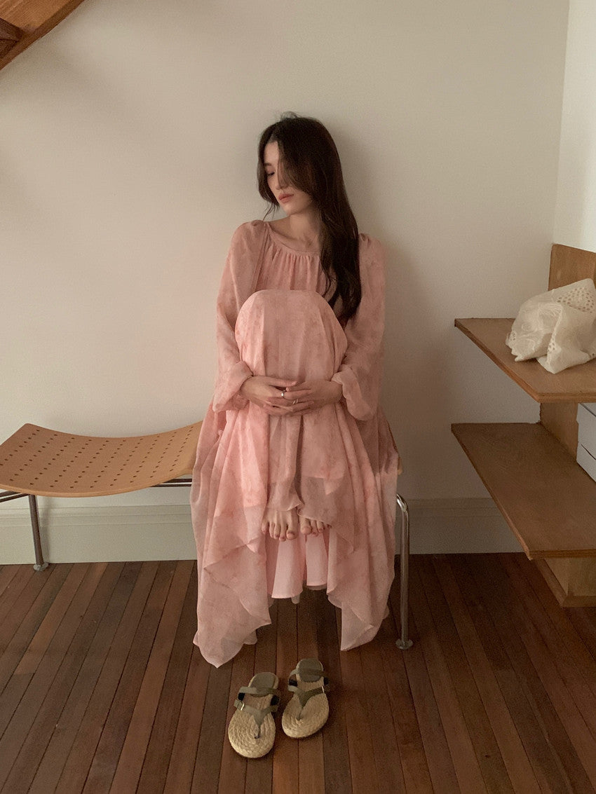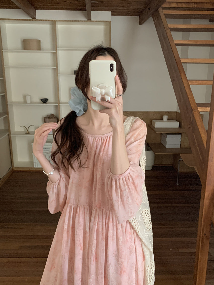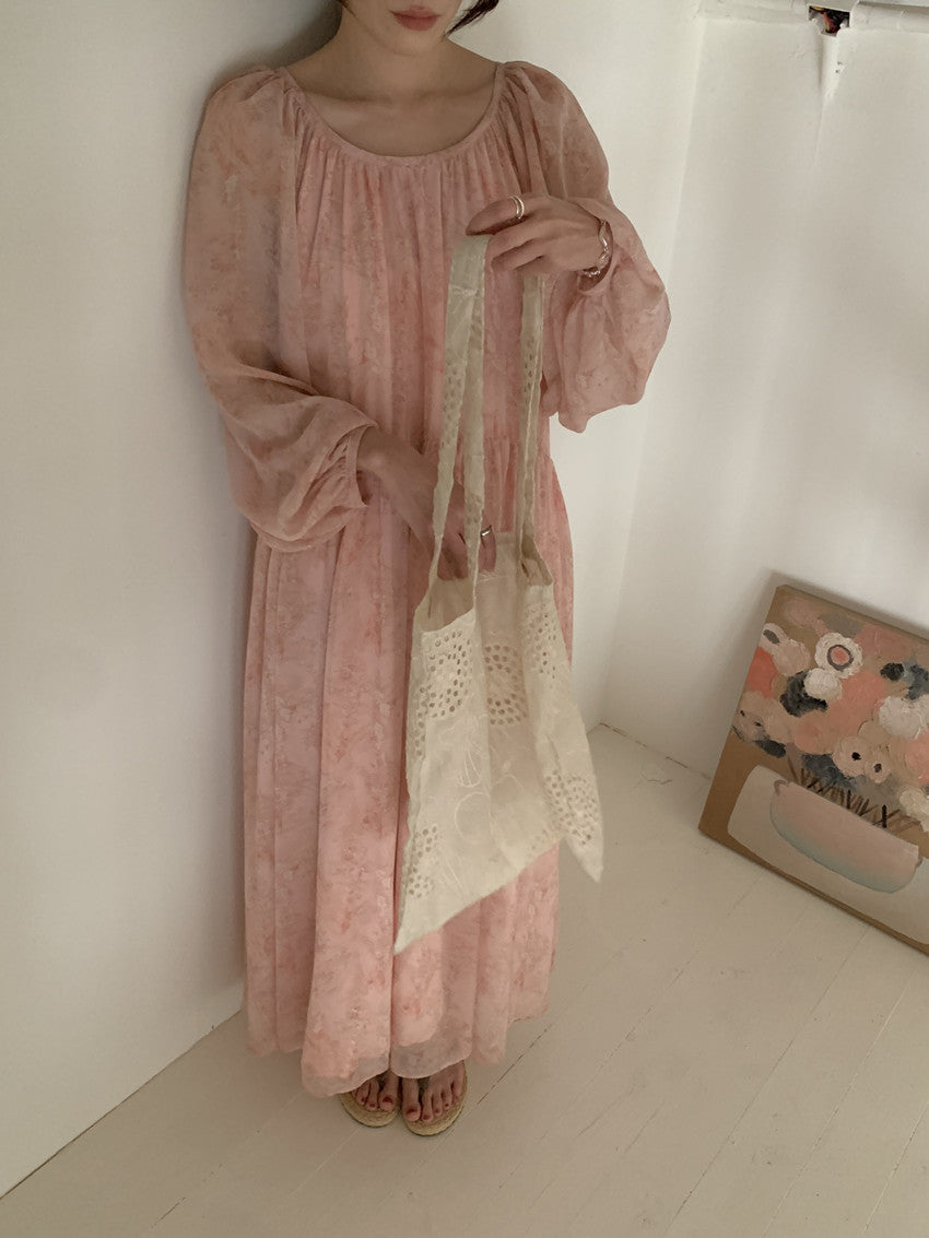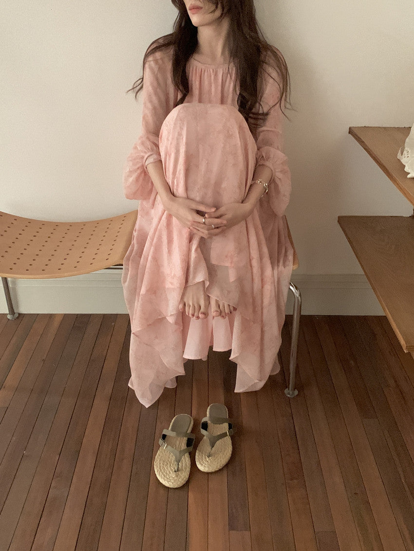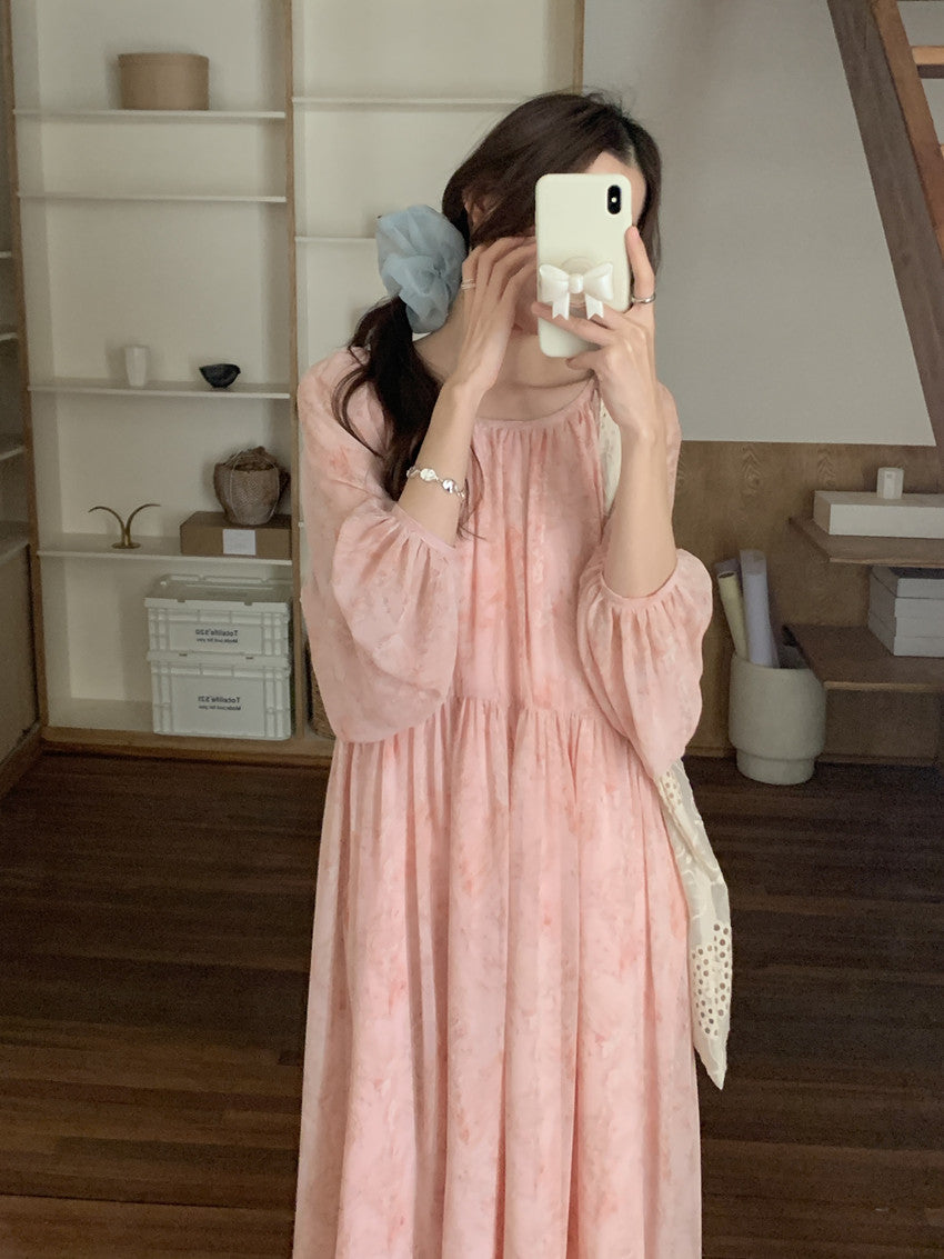 【F60208】實拍仙氣飄飄碎花大露背設計寬鬆長雪紡洋裝250225