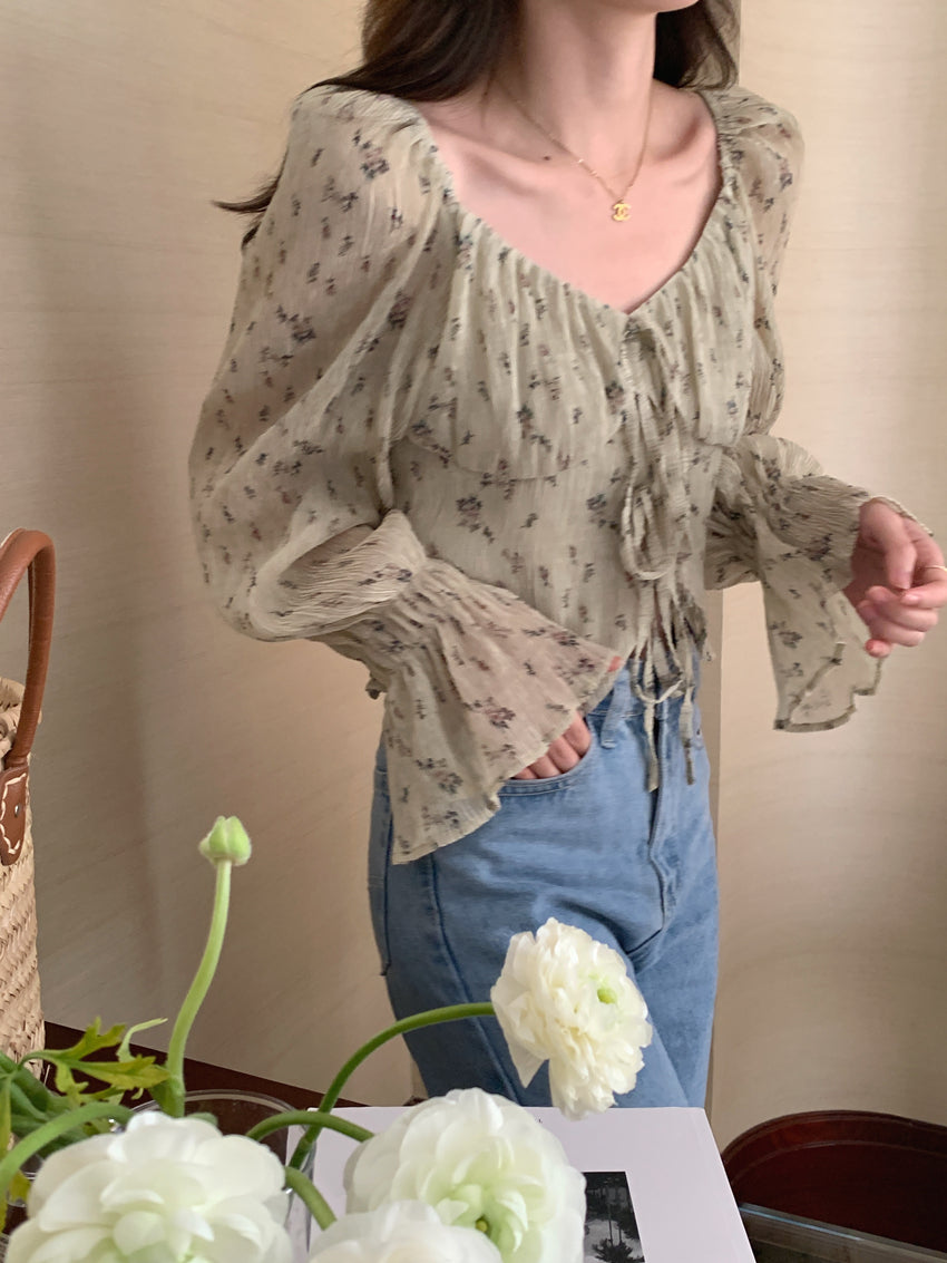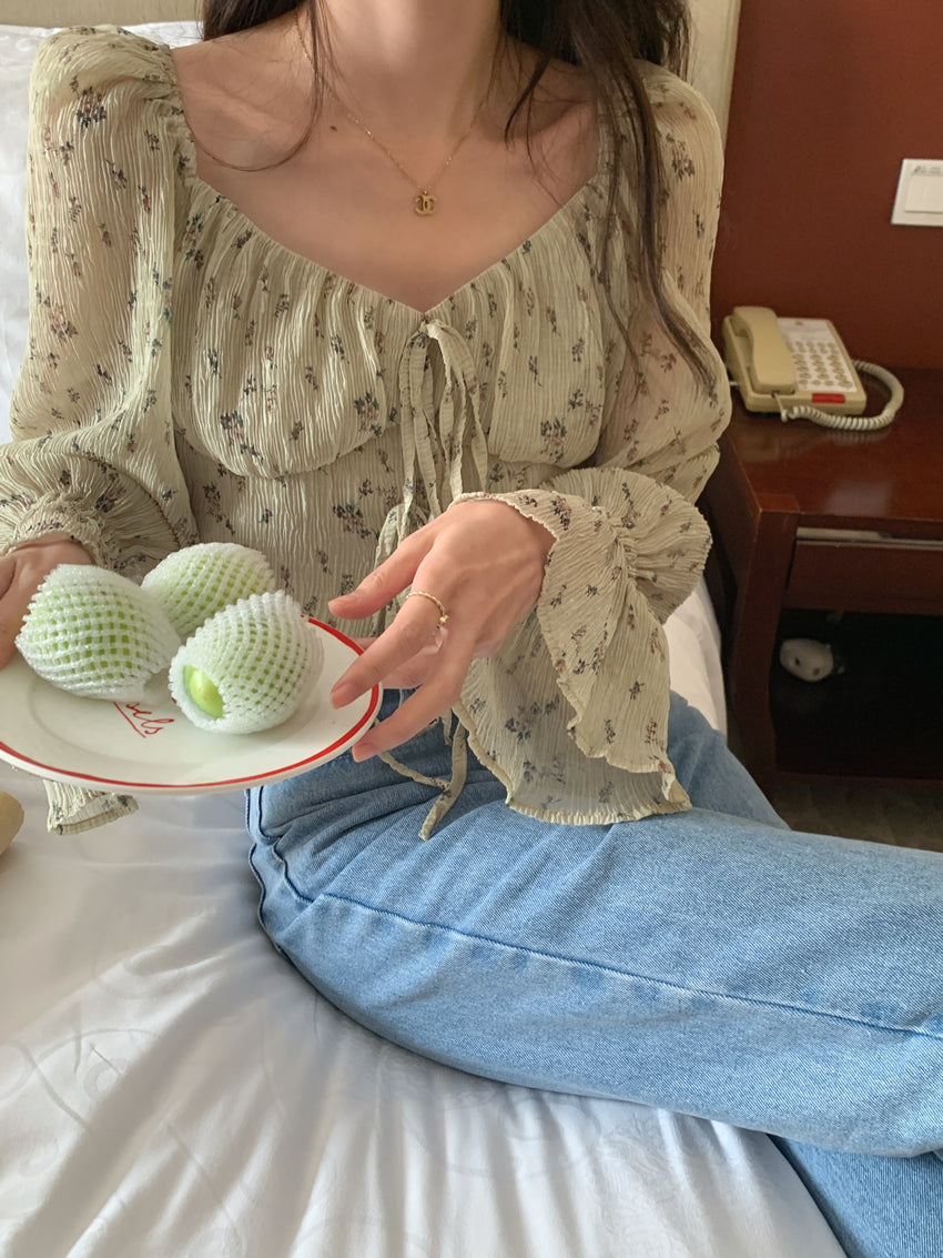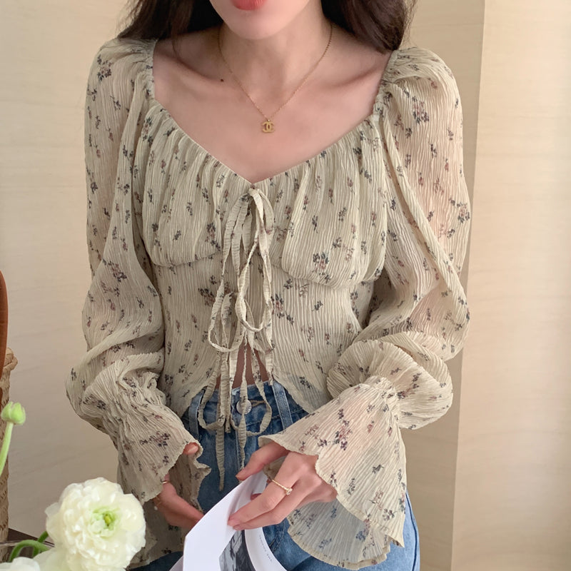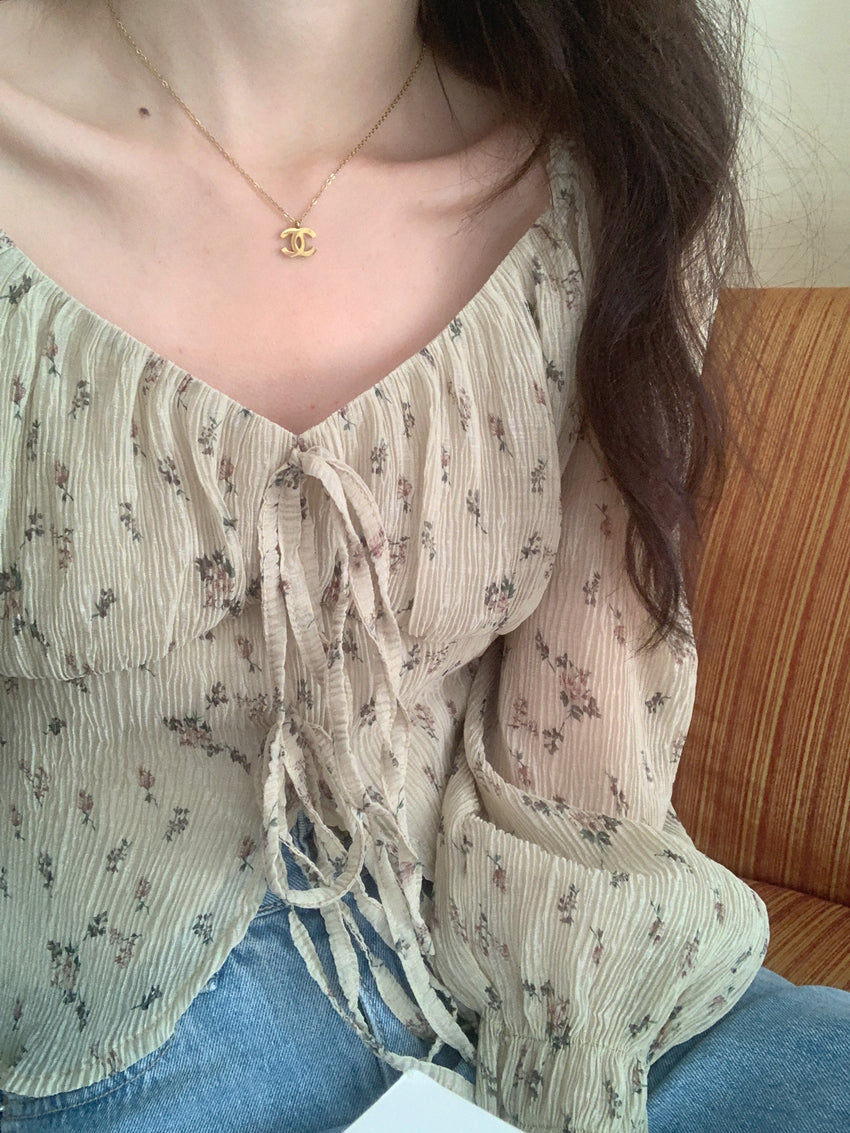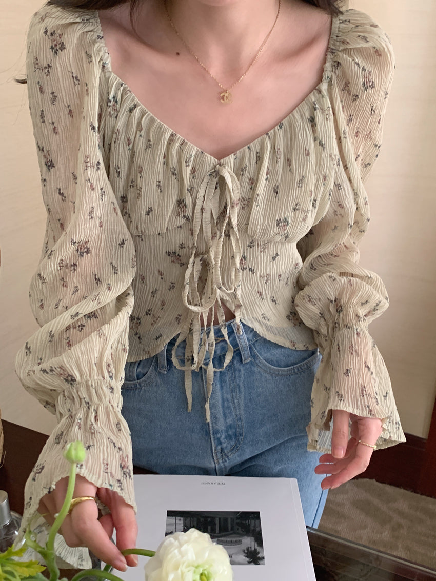【F60209】實拍法式浪漫復古碎花褶皺雪紡衫250225