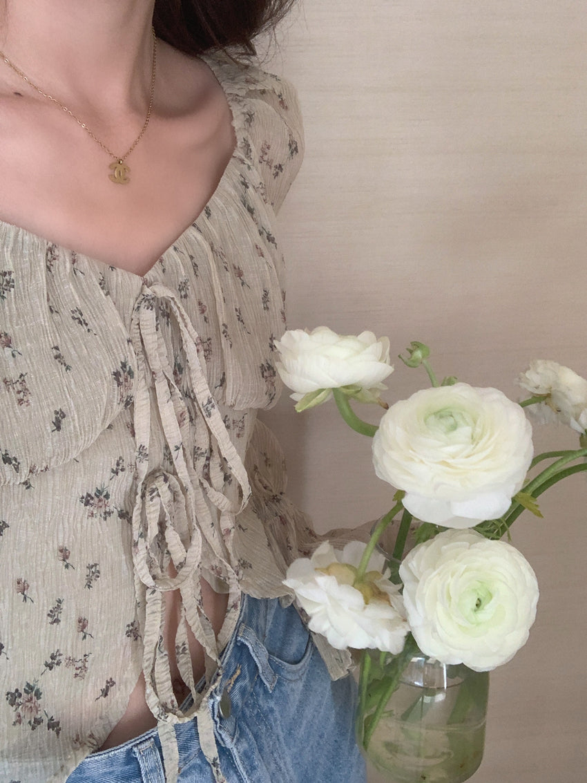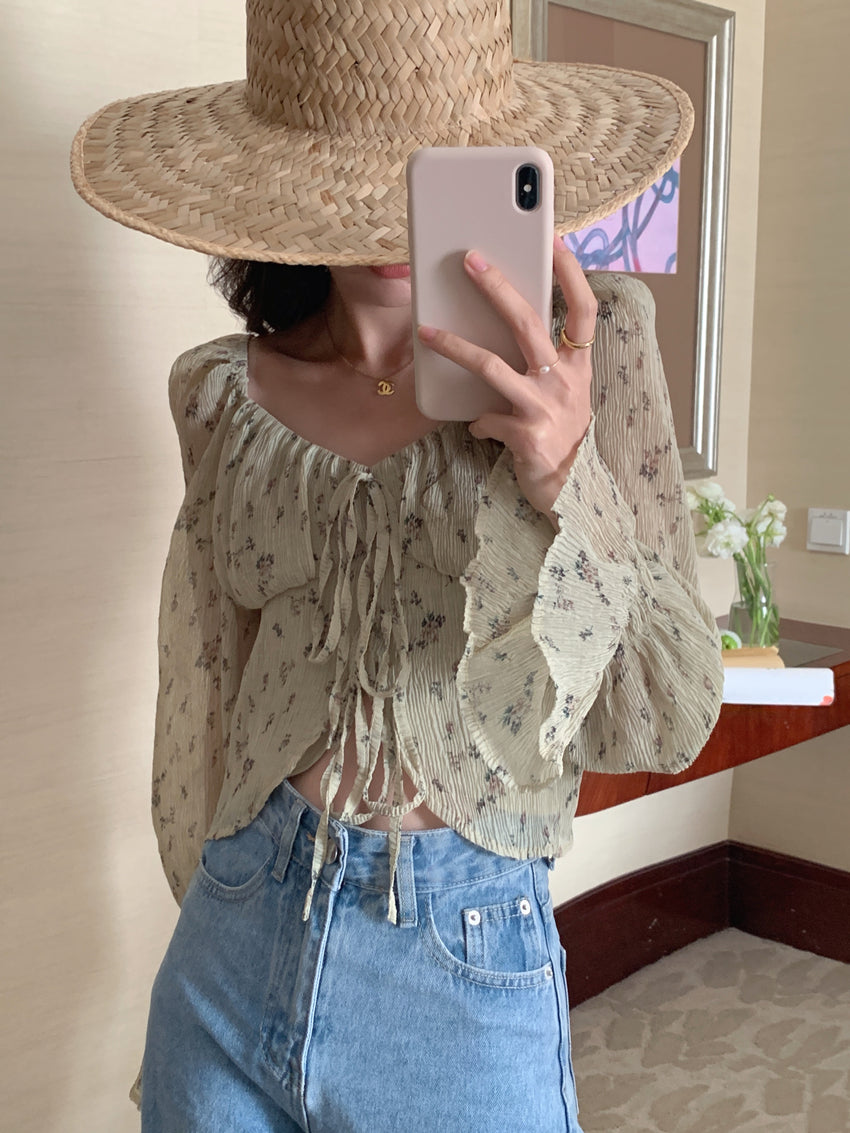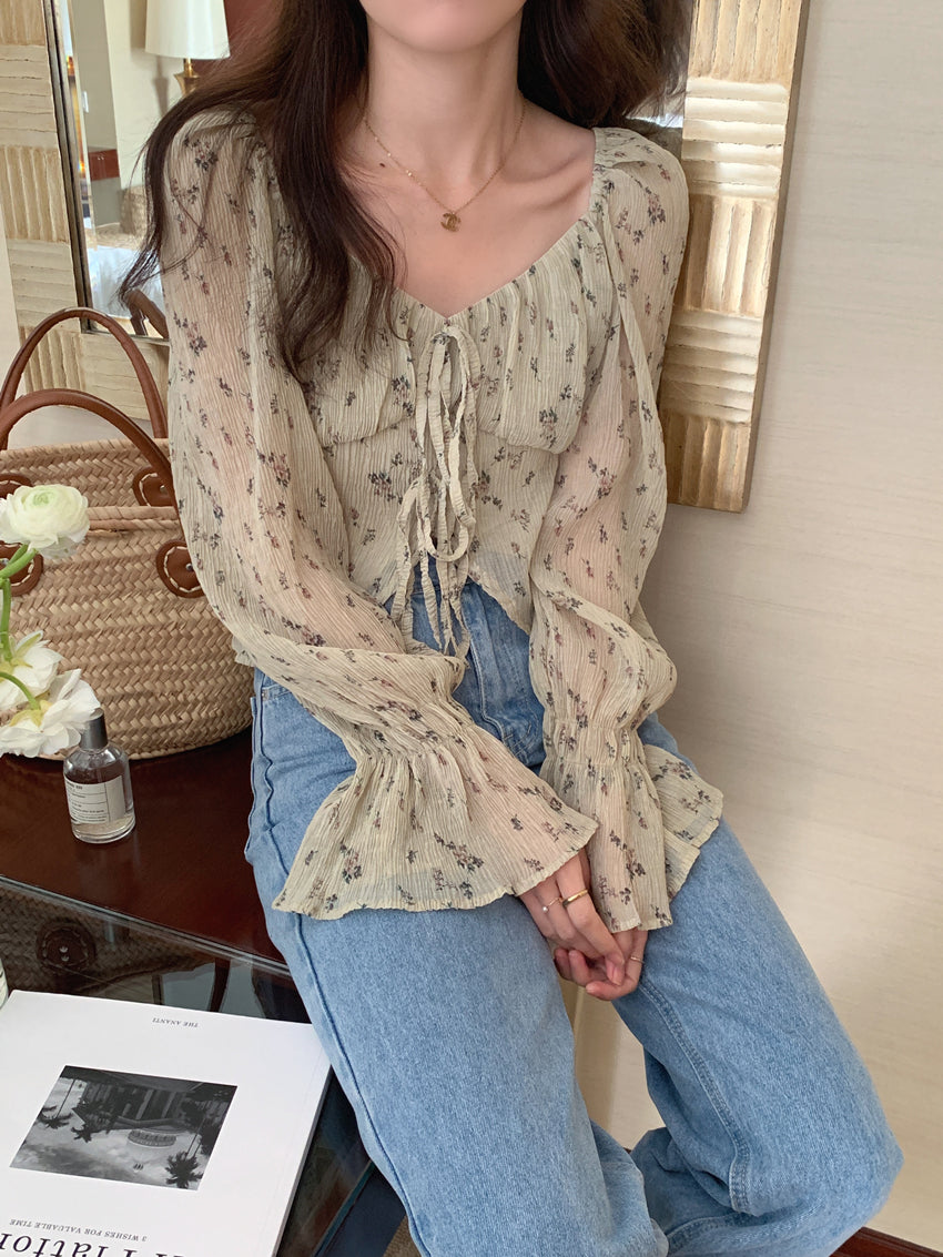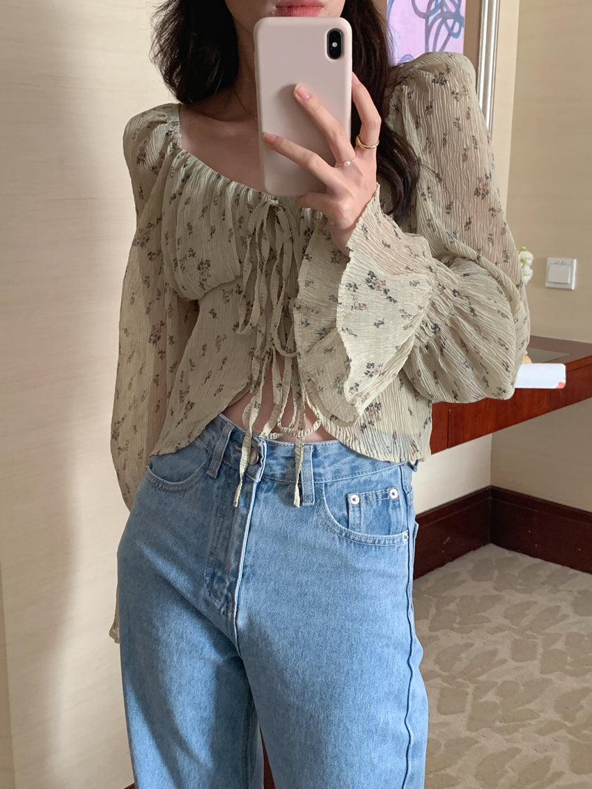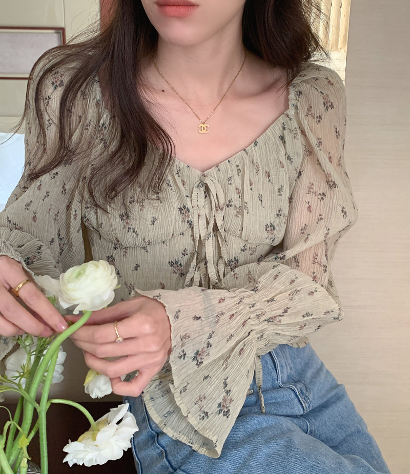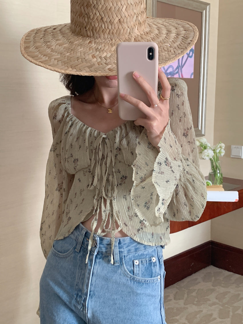 【F60209】實拍法式浪漫復古碎花褶皺雪紡衫250225