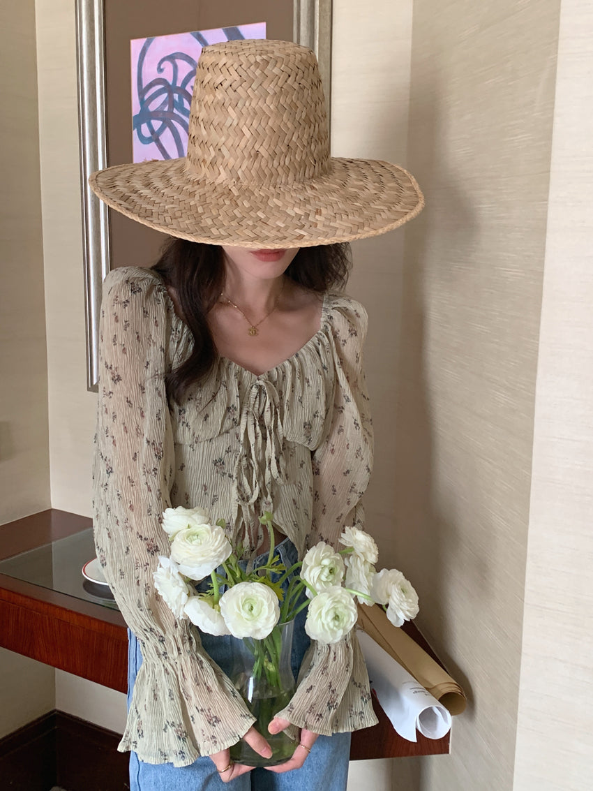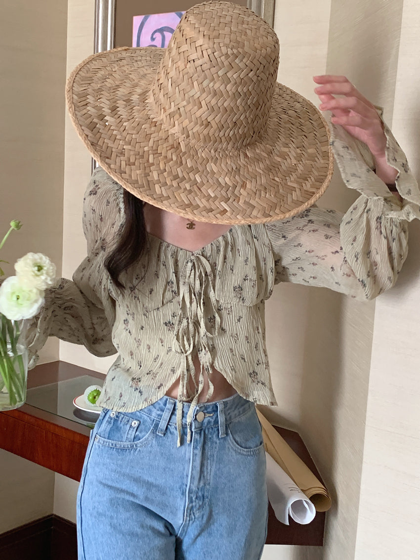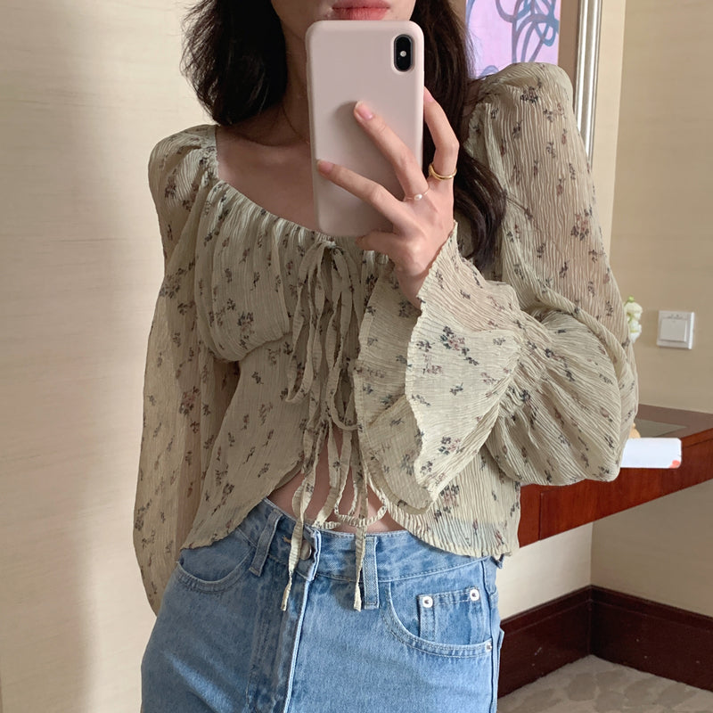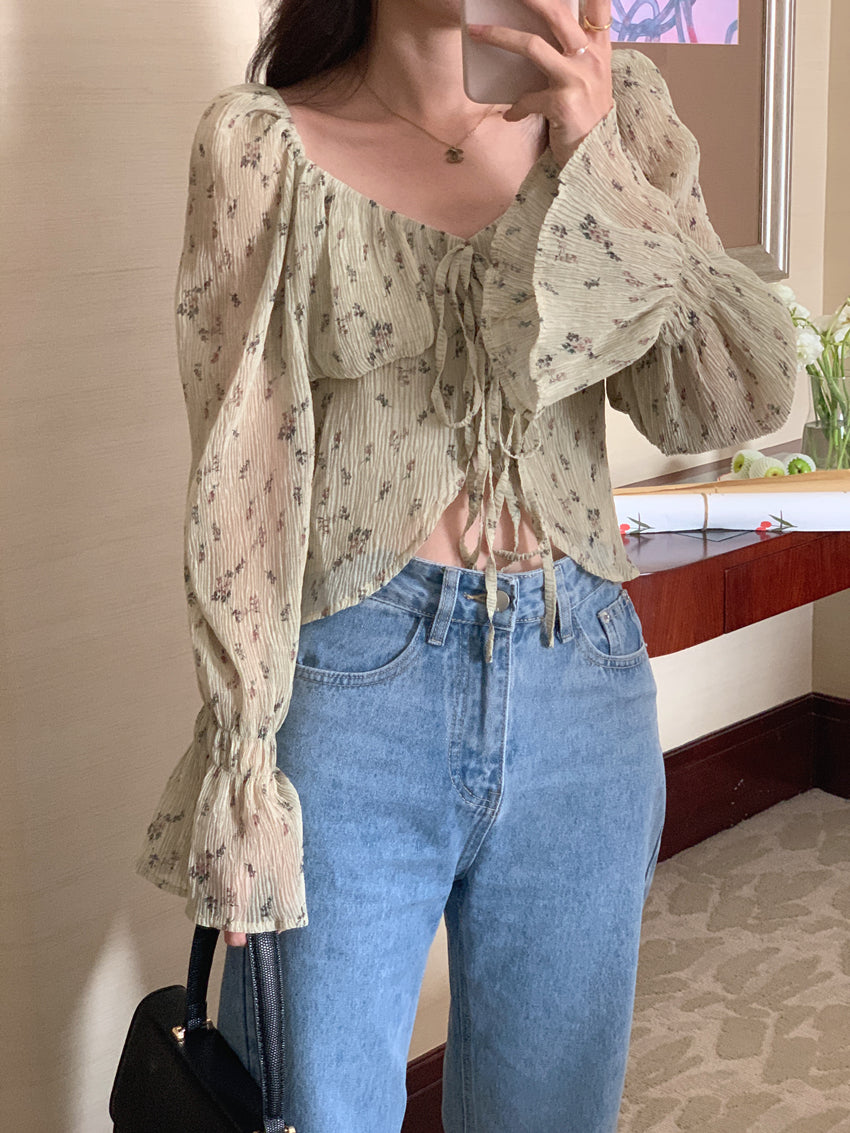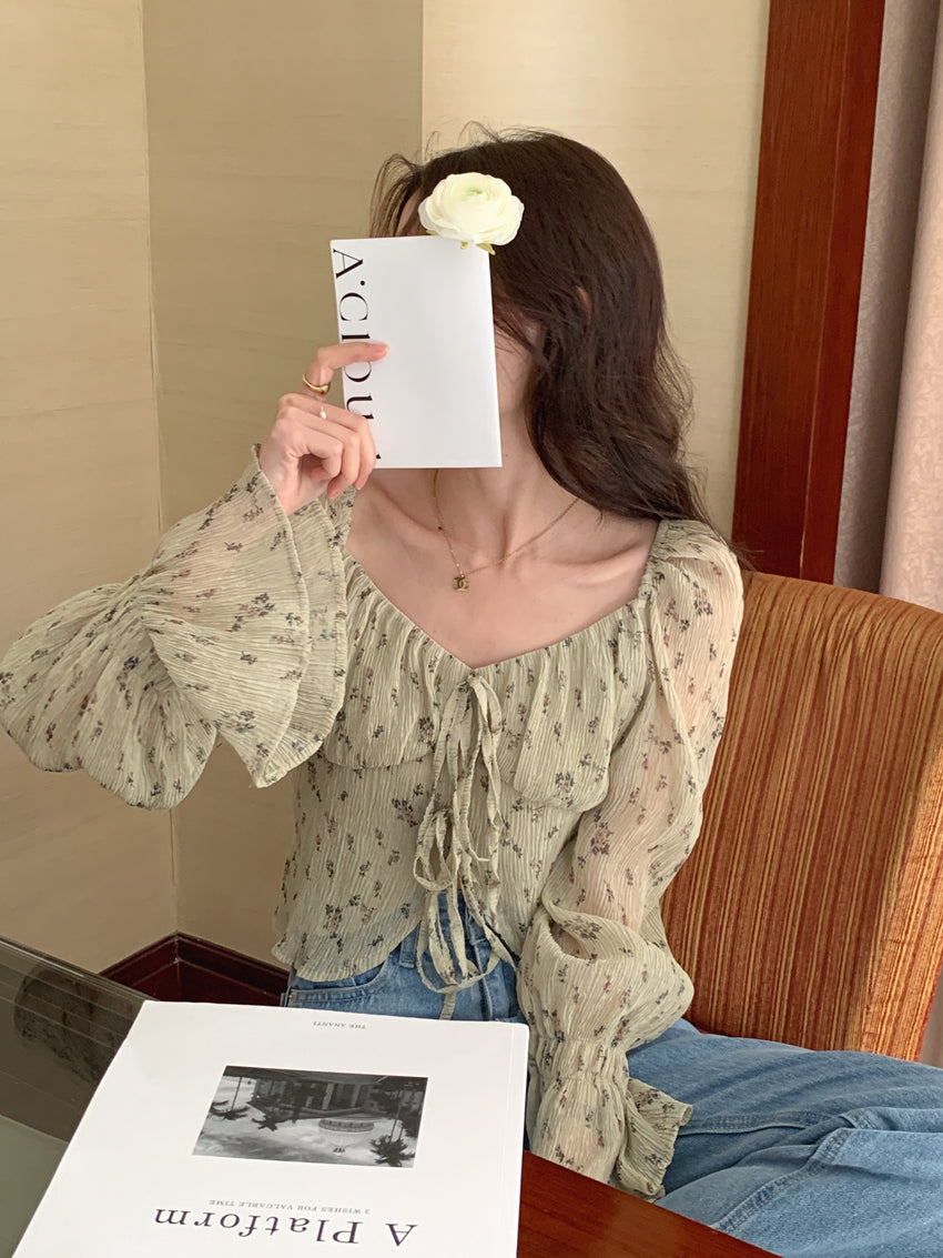 【F60209】實拍法式浪漫復古碎花褶皺雪紡衫250225