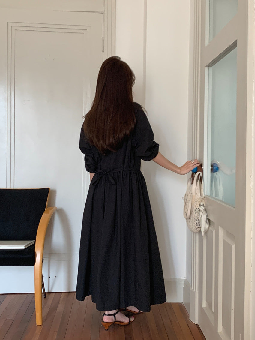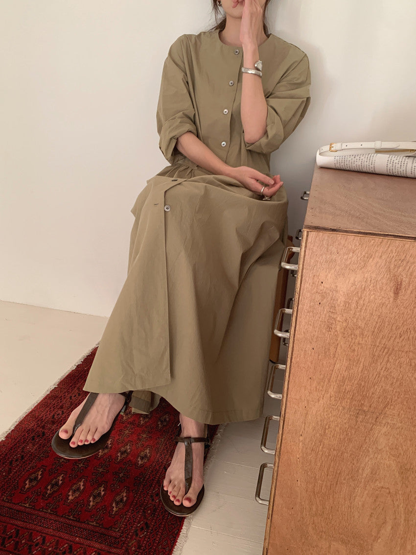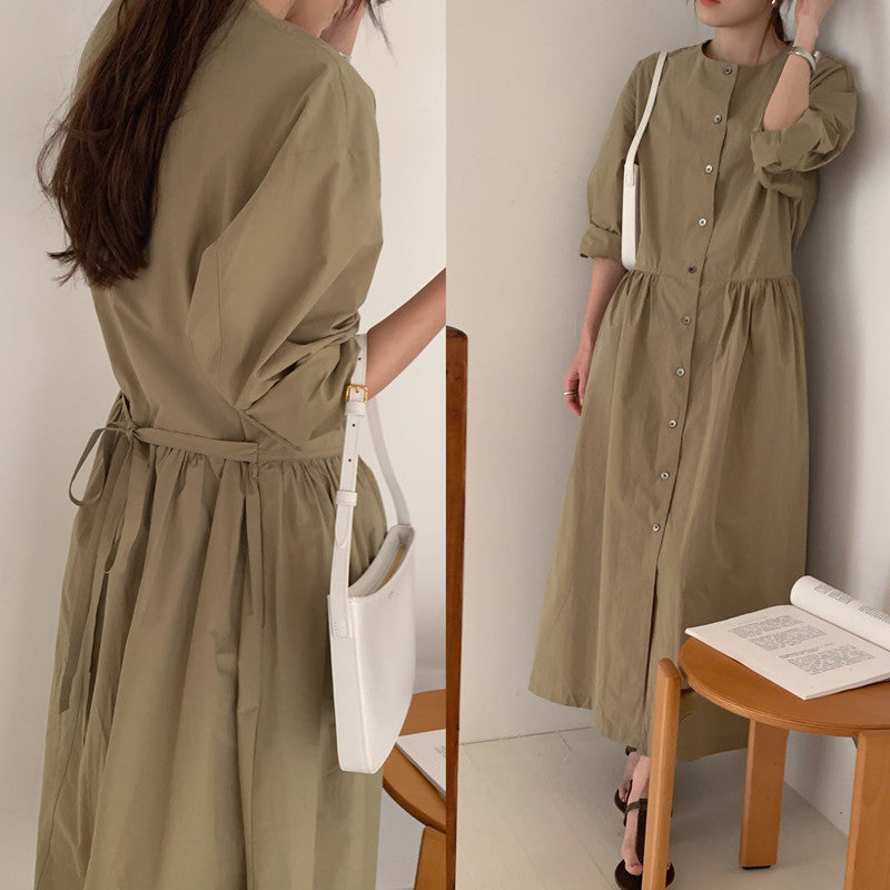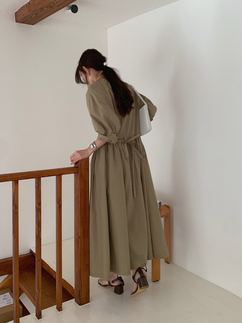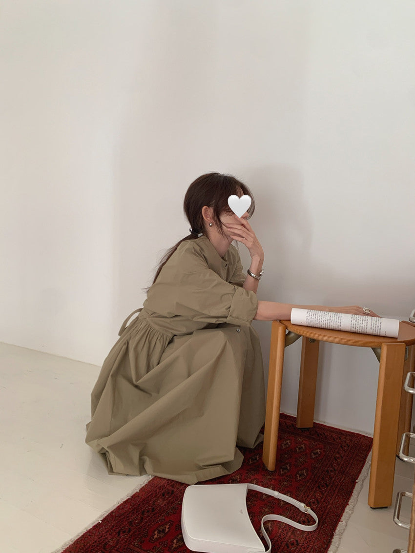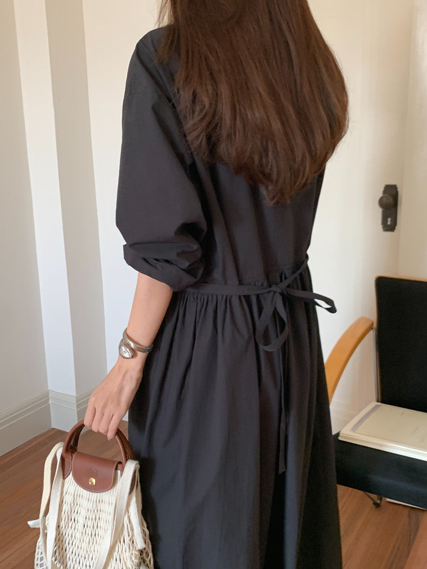 【F60210】實拍復古優雅 圓領寬鬆綁帶長洋裝250225