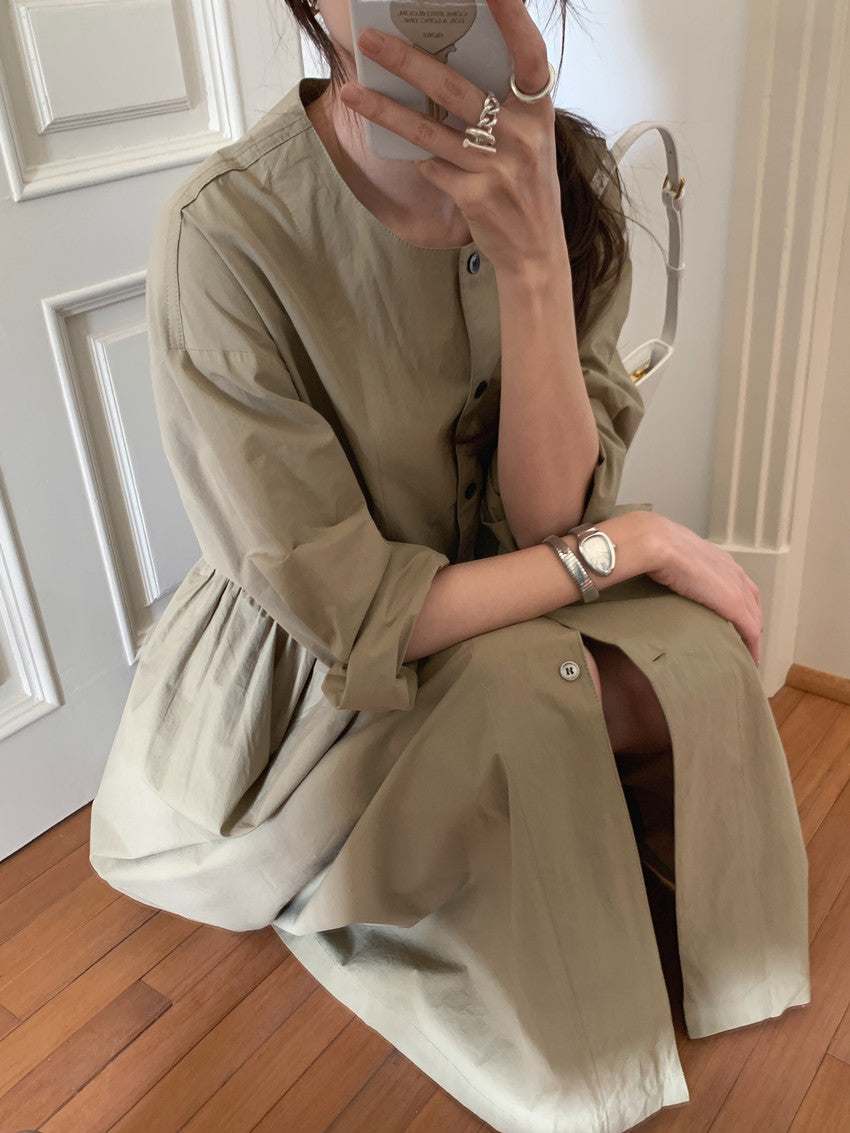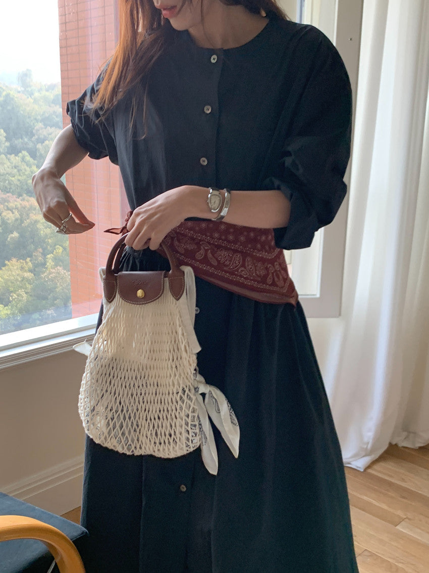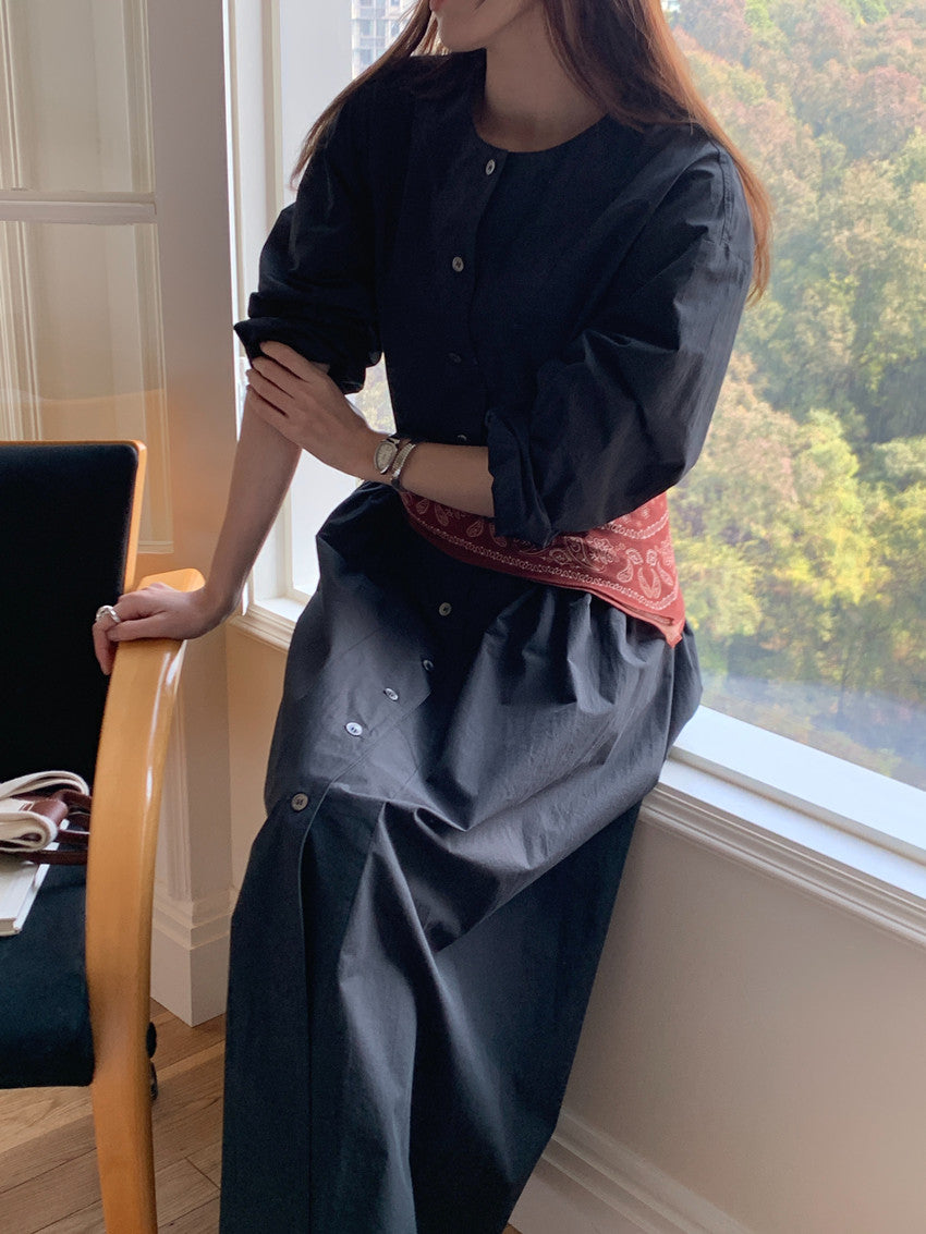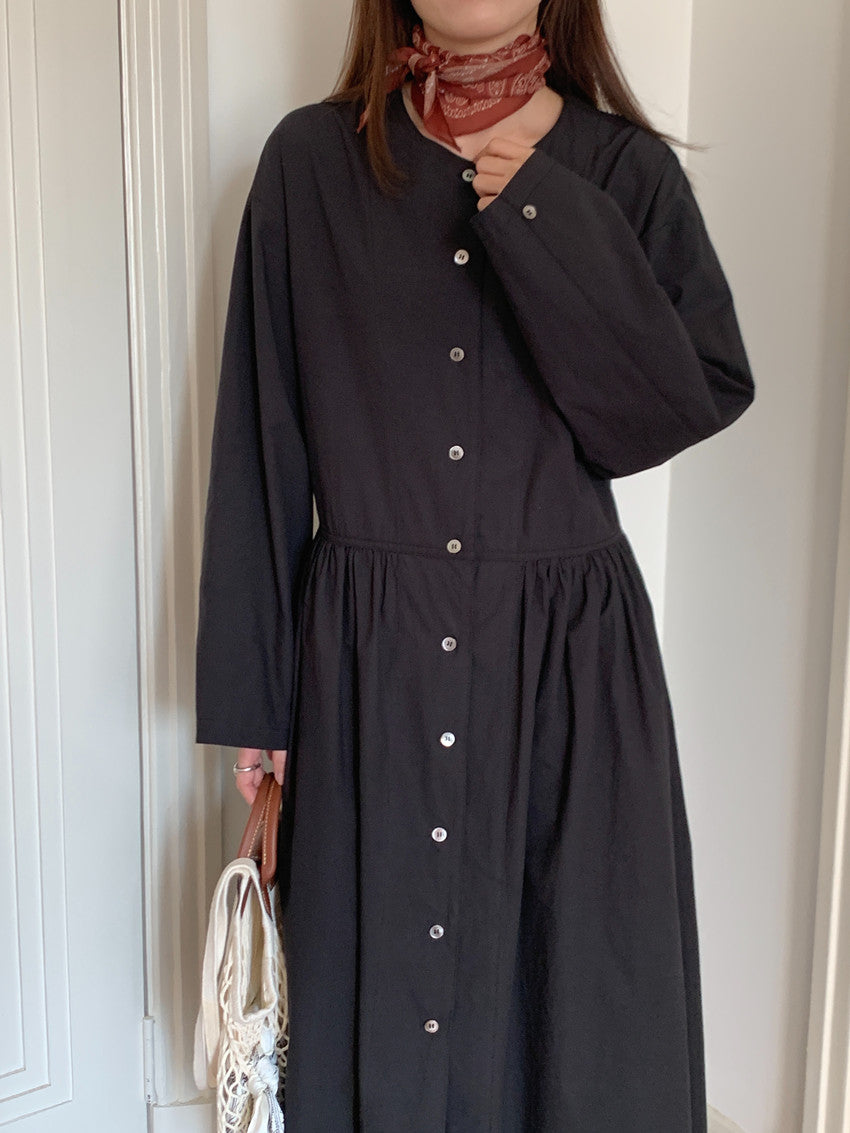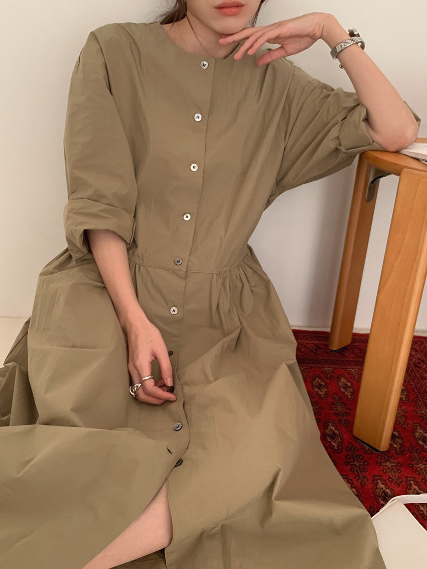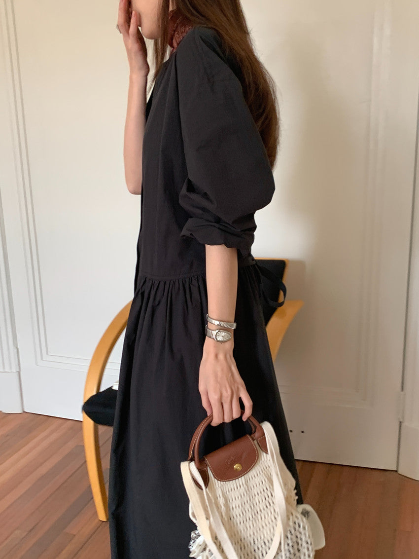 【F60210】實拍復古優雅 圓領寬鬆綁帶長洋裝250225