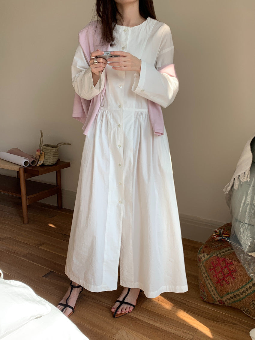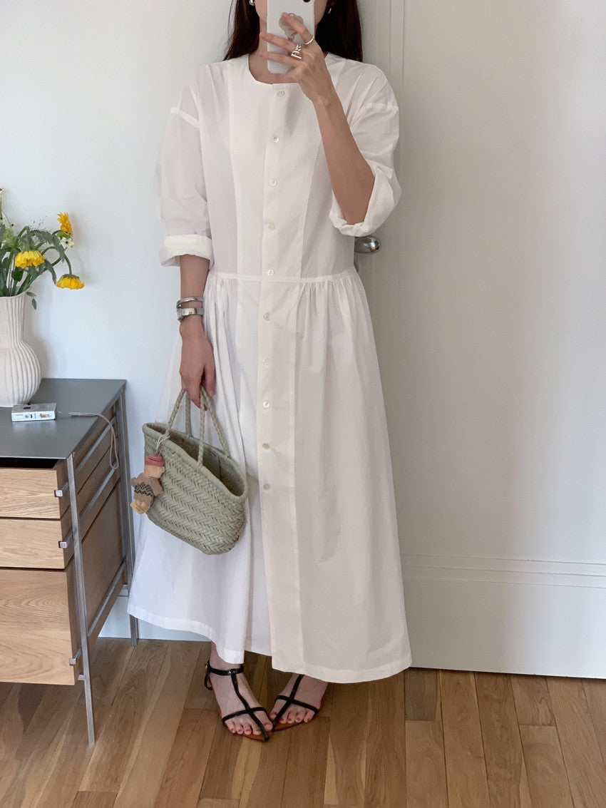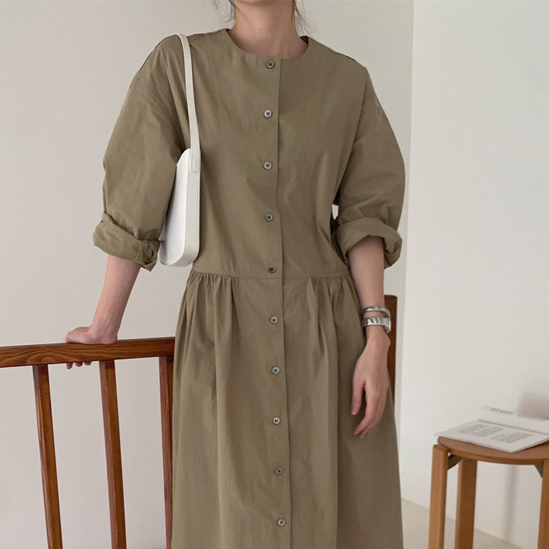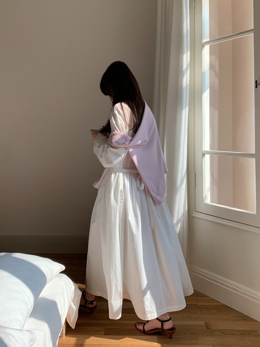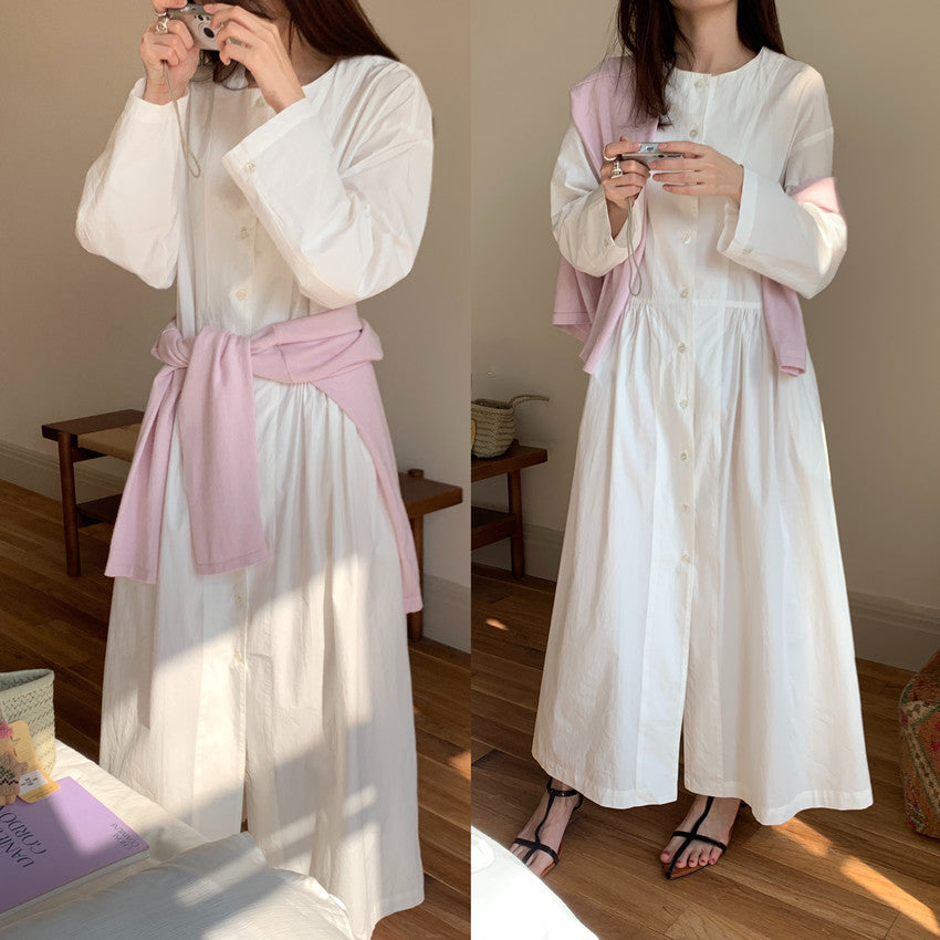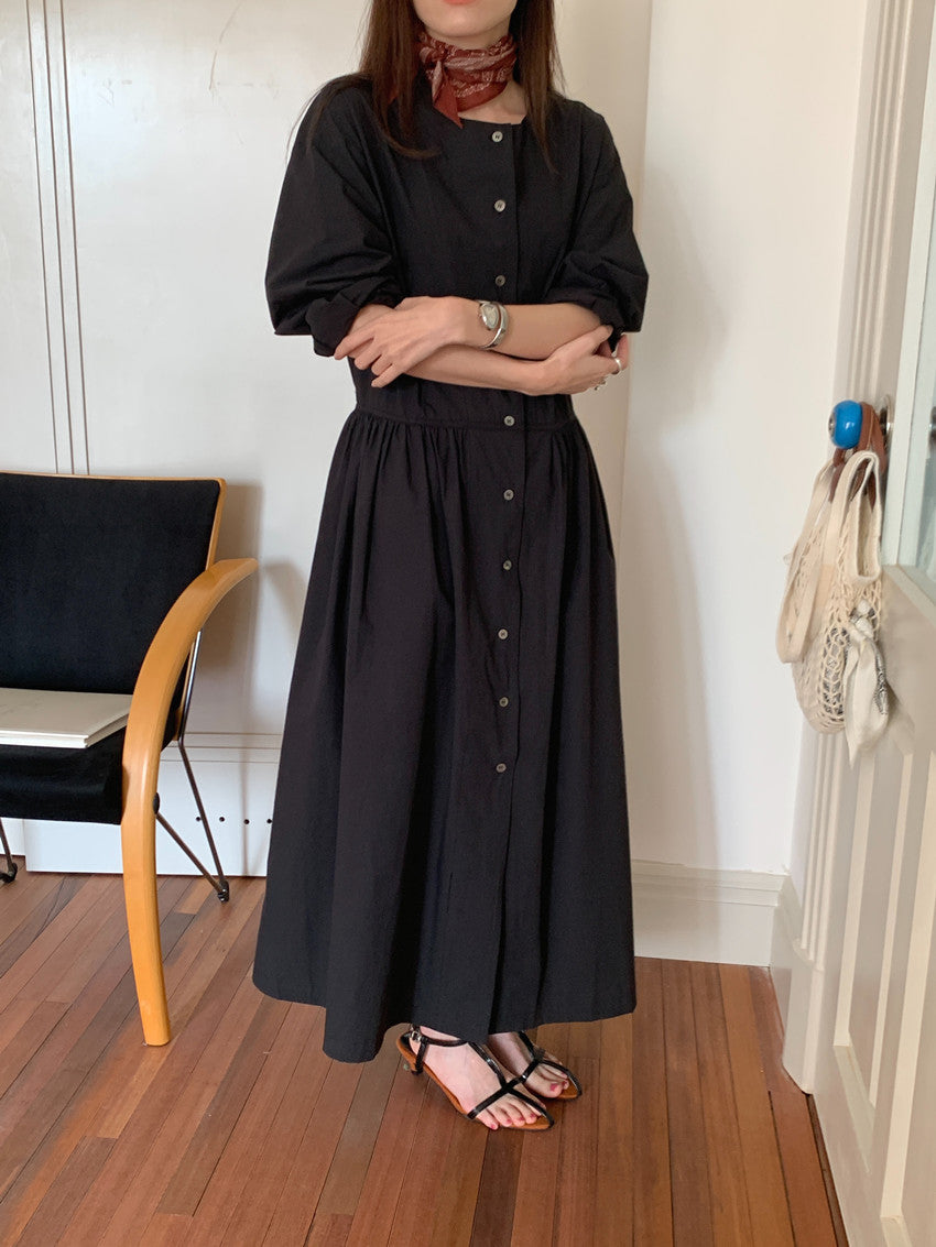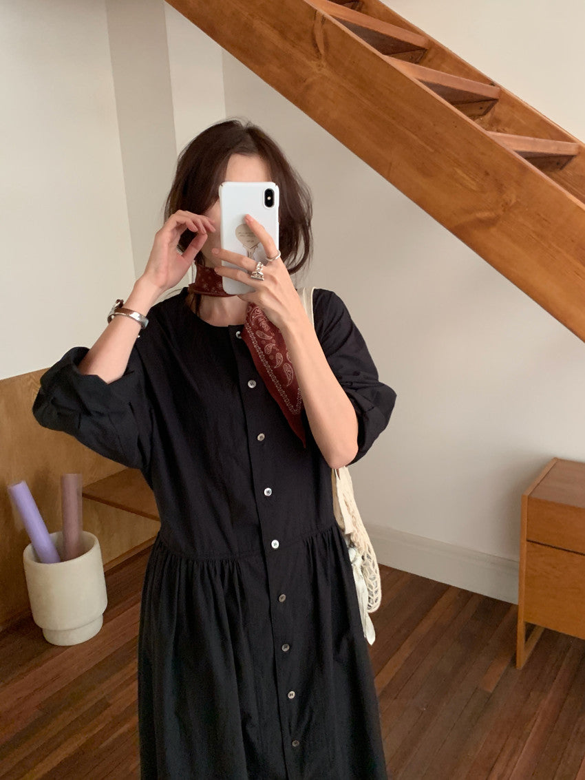 【F60210】實拍復古優雅 圓領寬鬆綁帶長洋裝250225