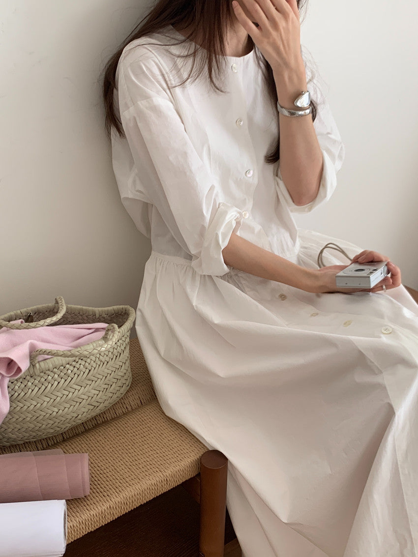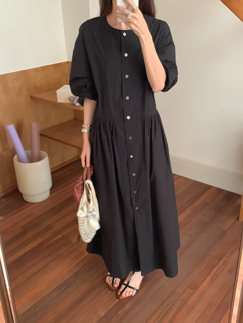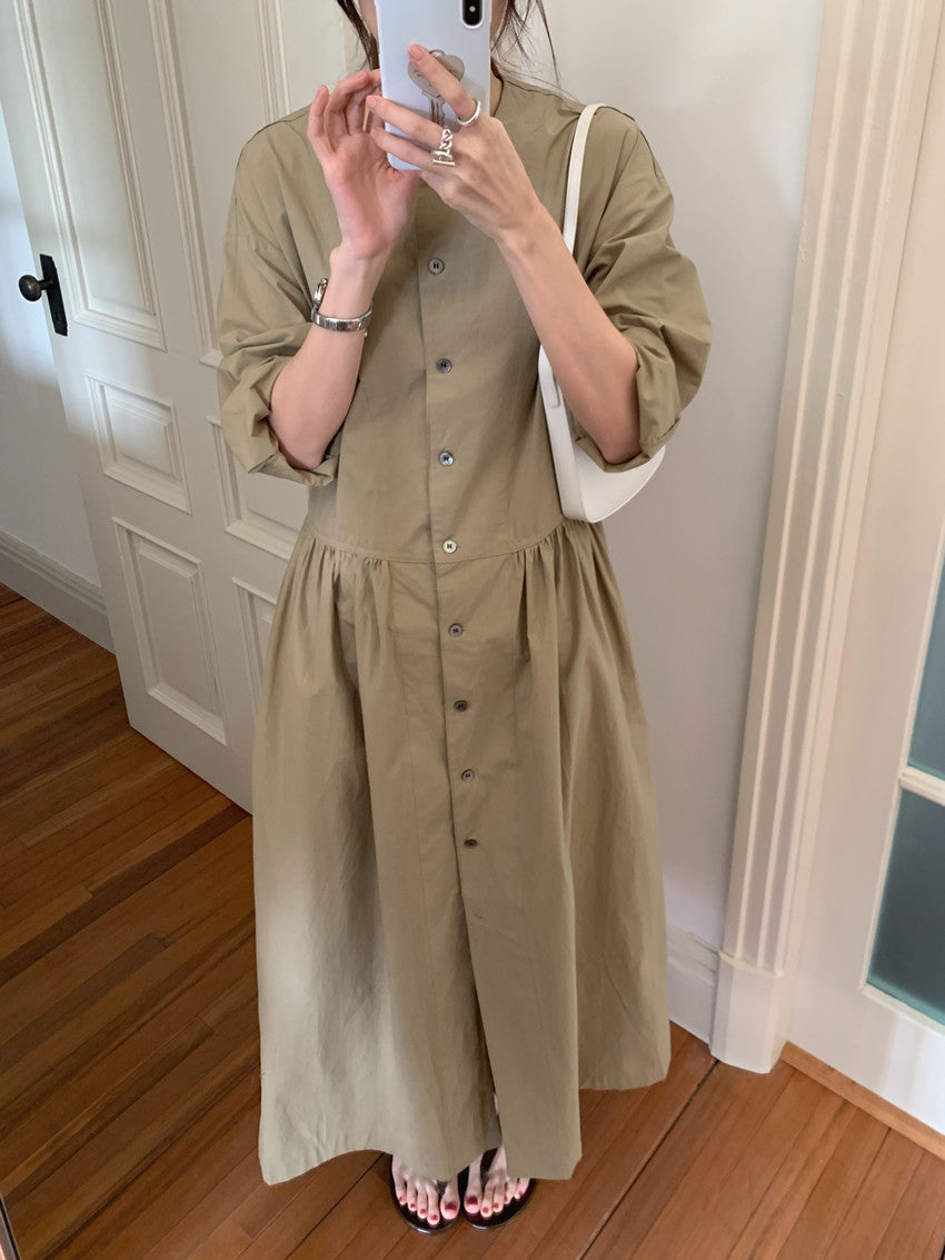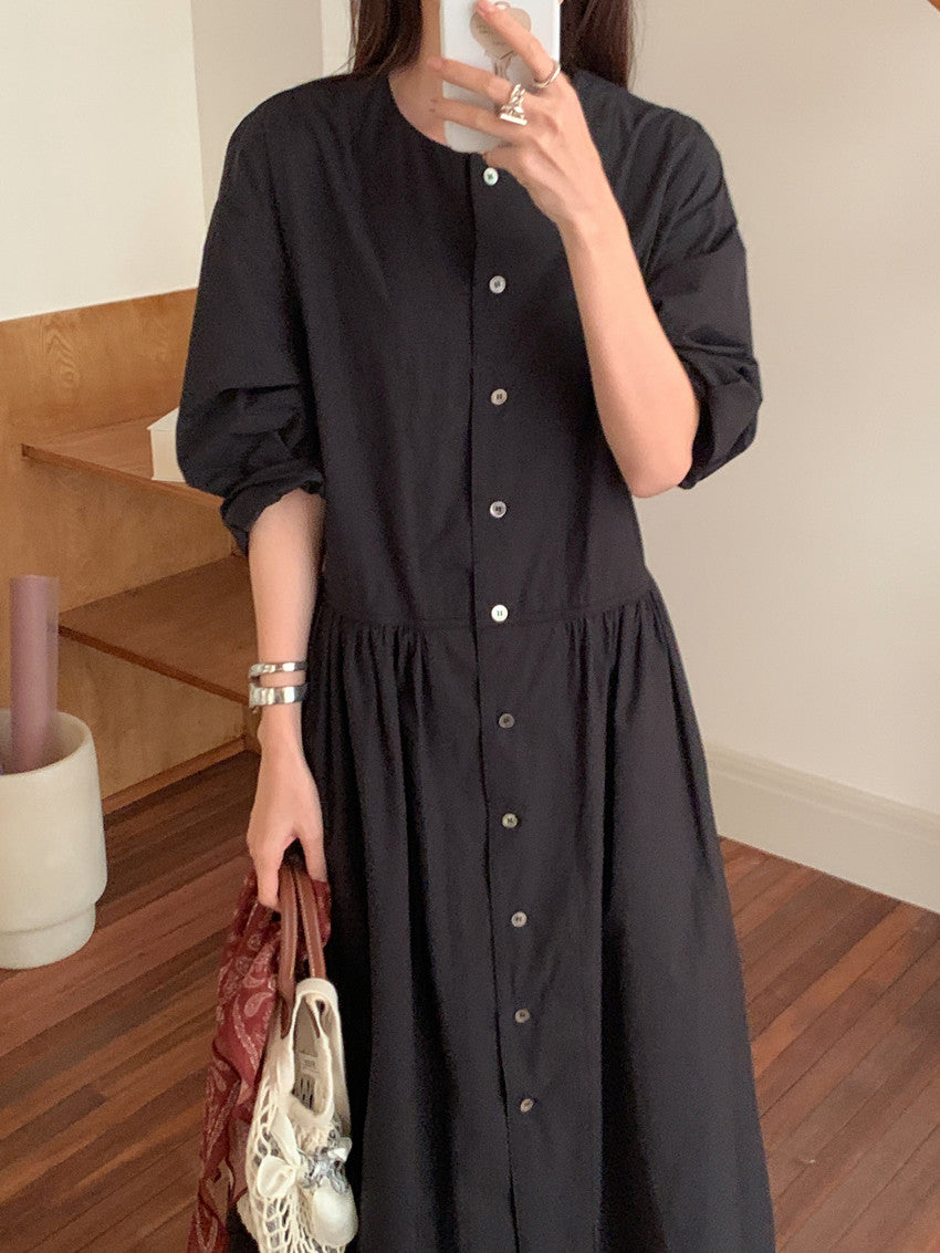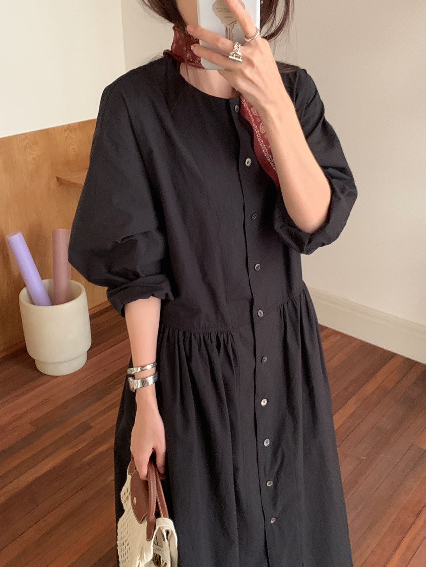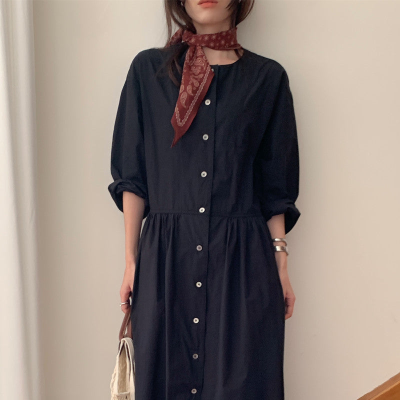 【F60210】實拍復古優雅 圓領寬鬆綁帶長洋裝250225