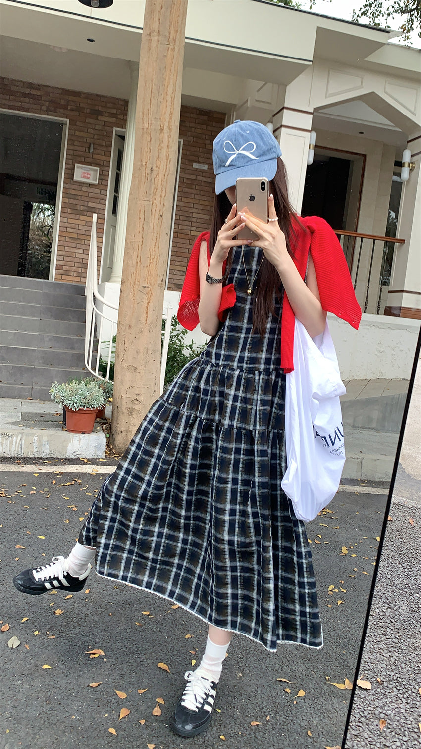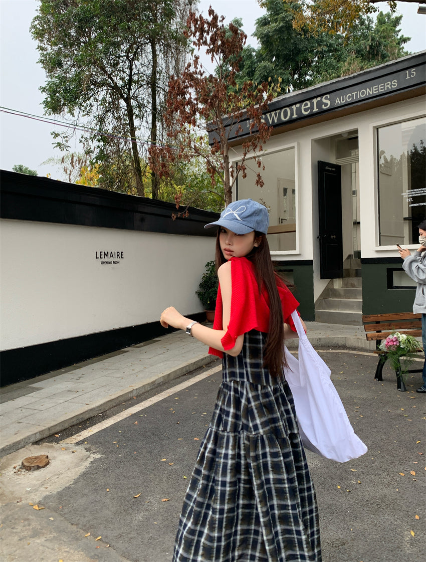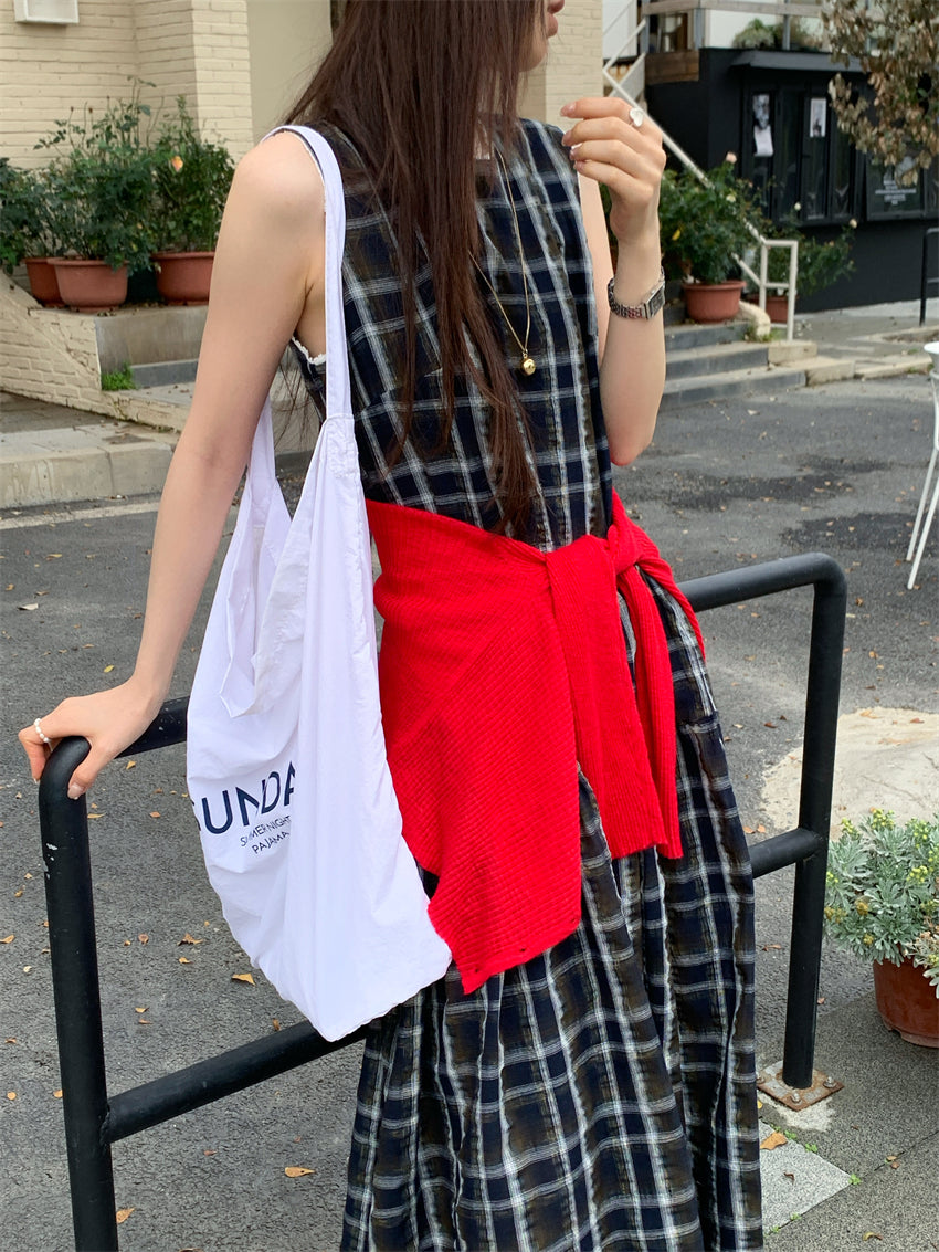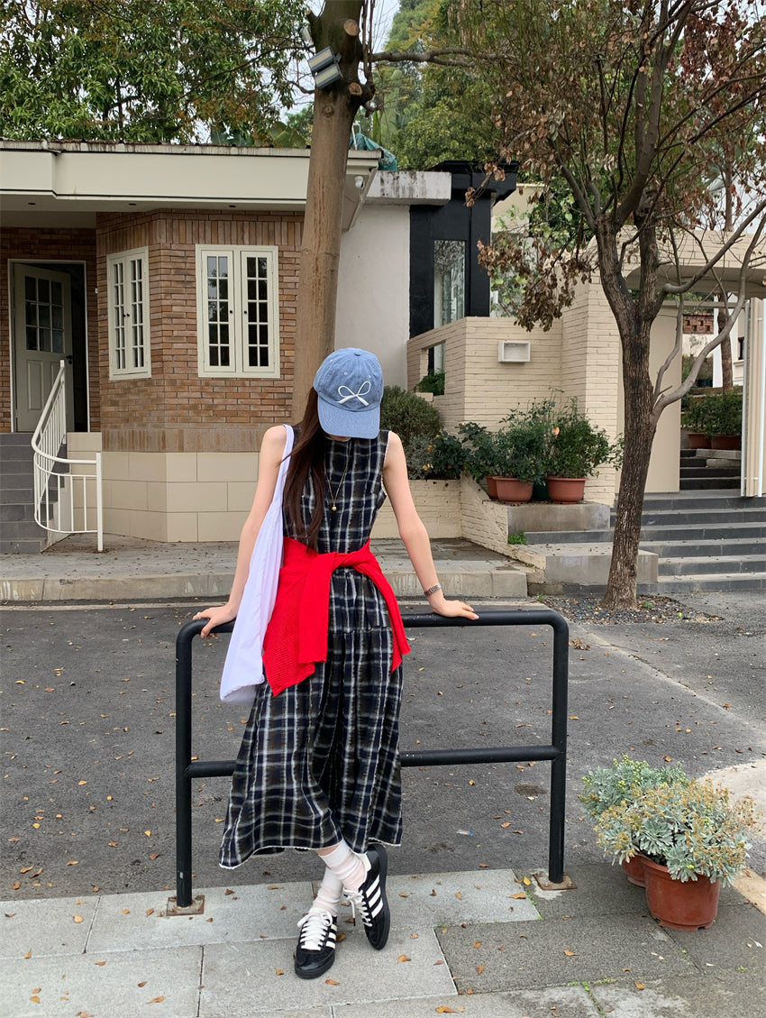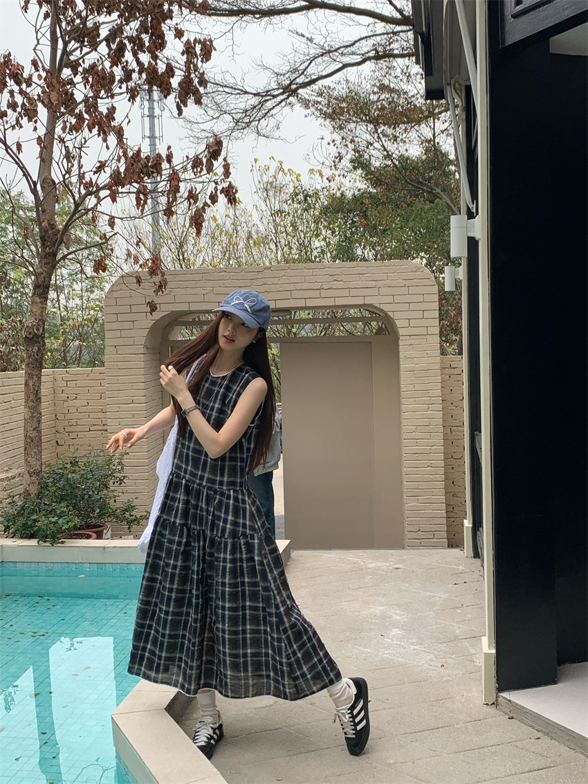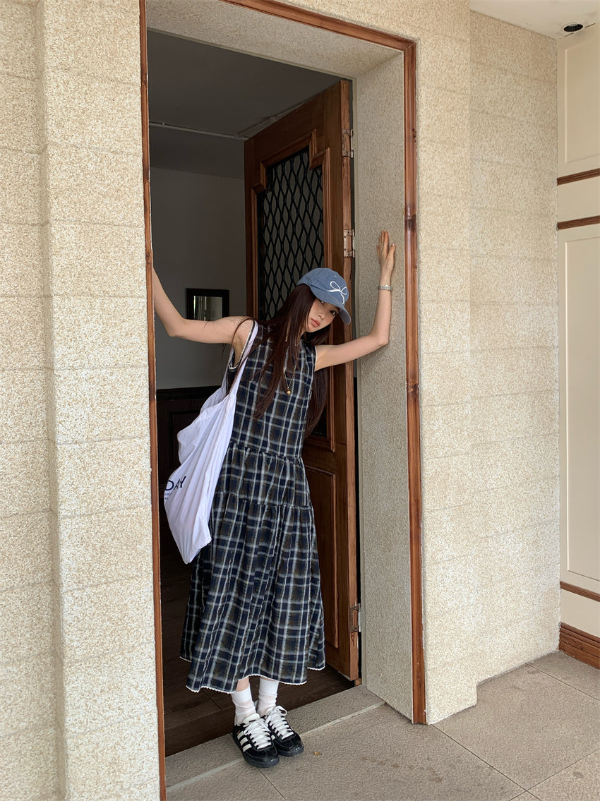 【F60216】實拍復古綠色格紋背心洋裝250225