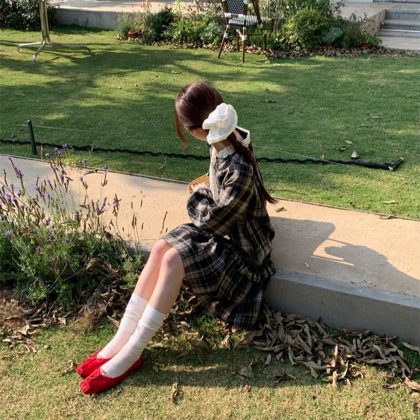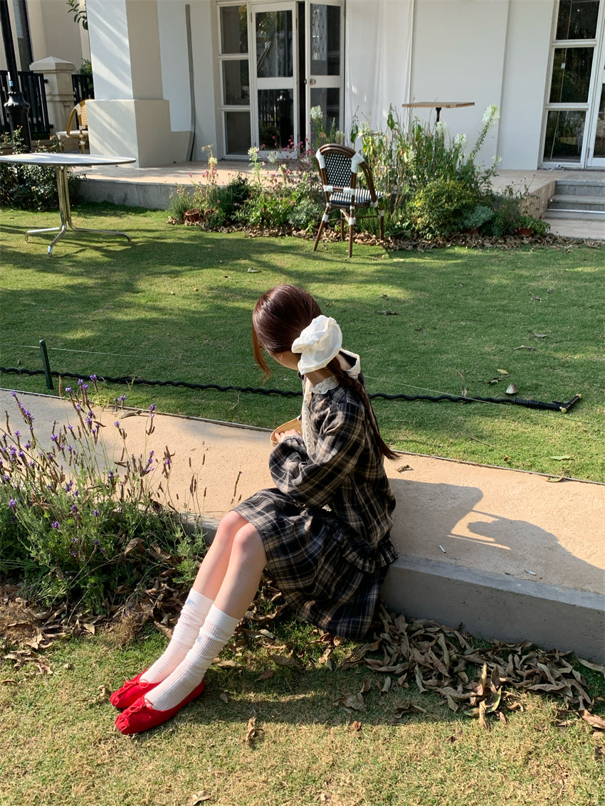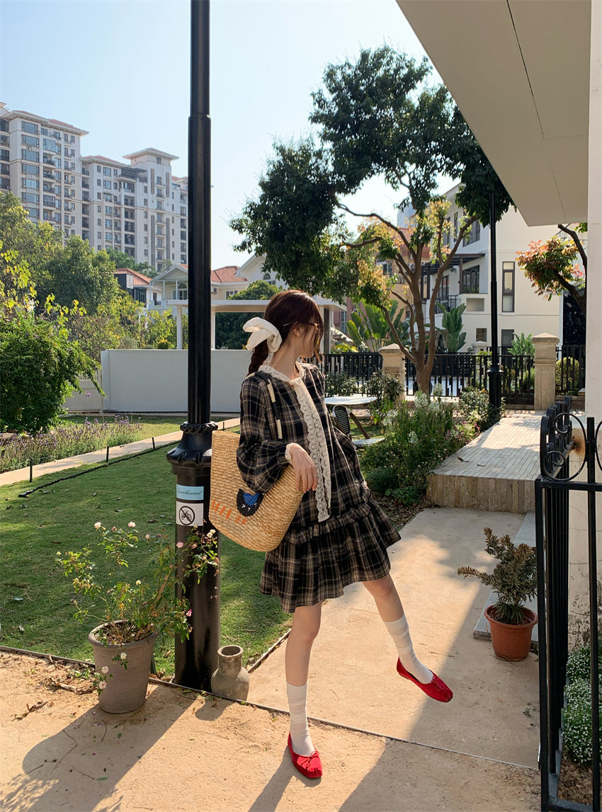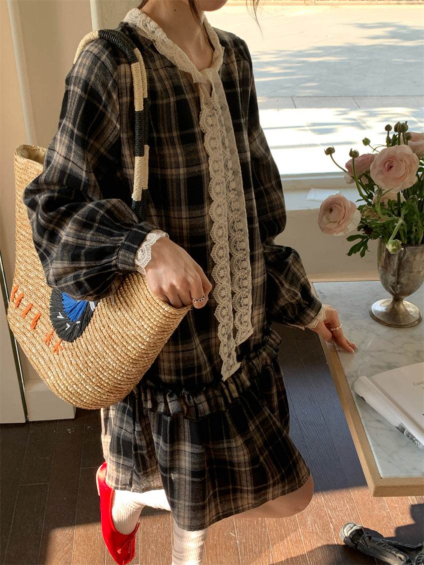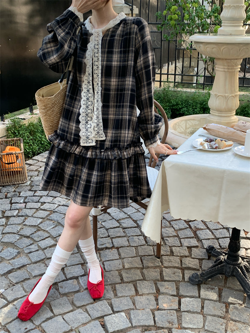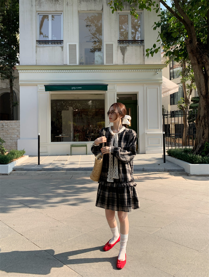 【F60219】實拍韓系復古蕾絲繫帶格紋洋裝250225