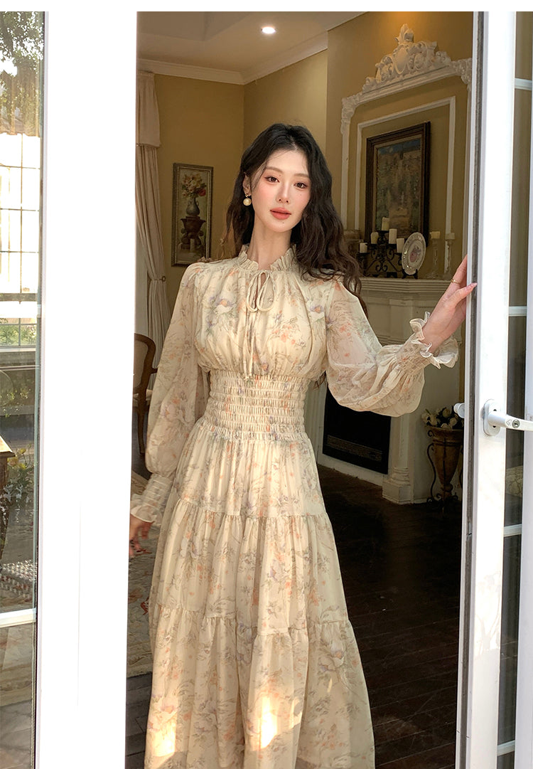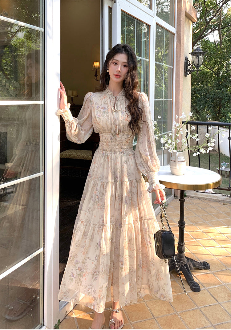 【F60222】實拍S~2XL高單春季法式碎花雪紡長袖洋裝250304