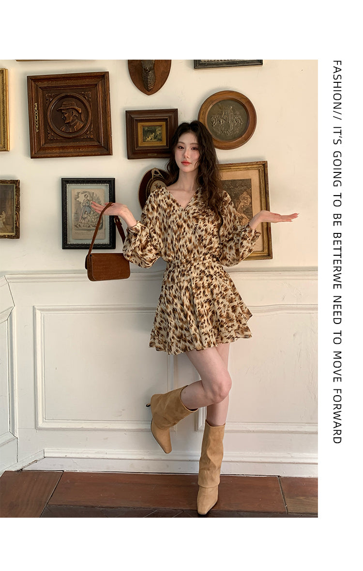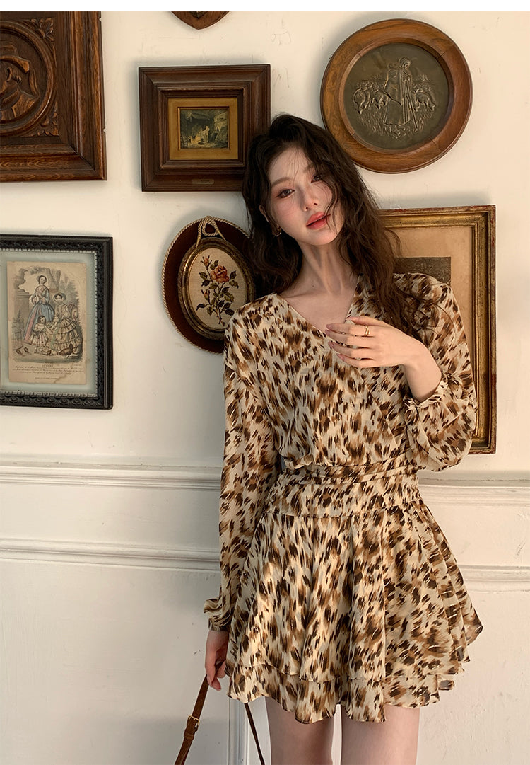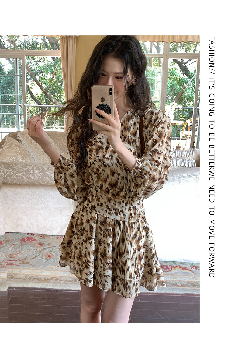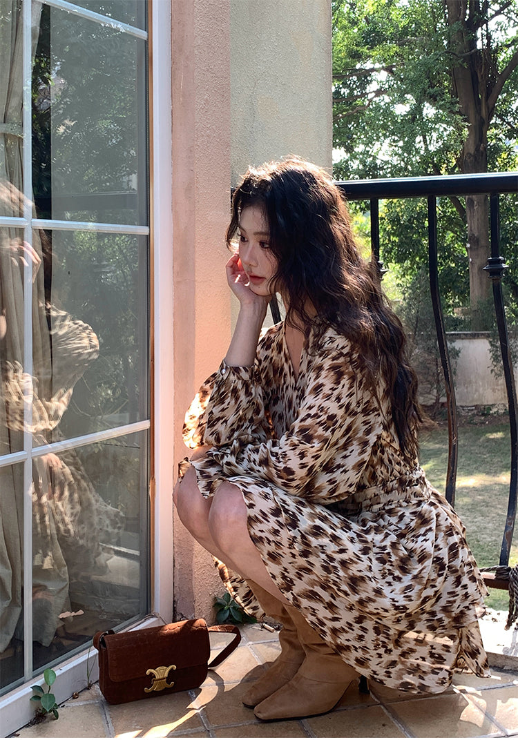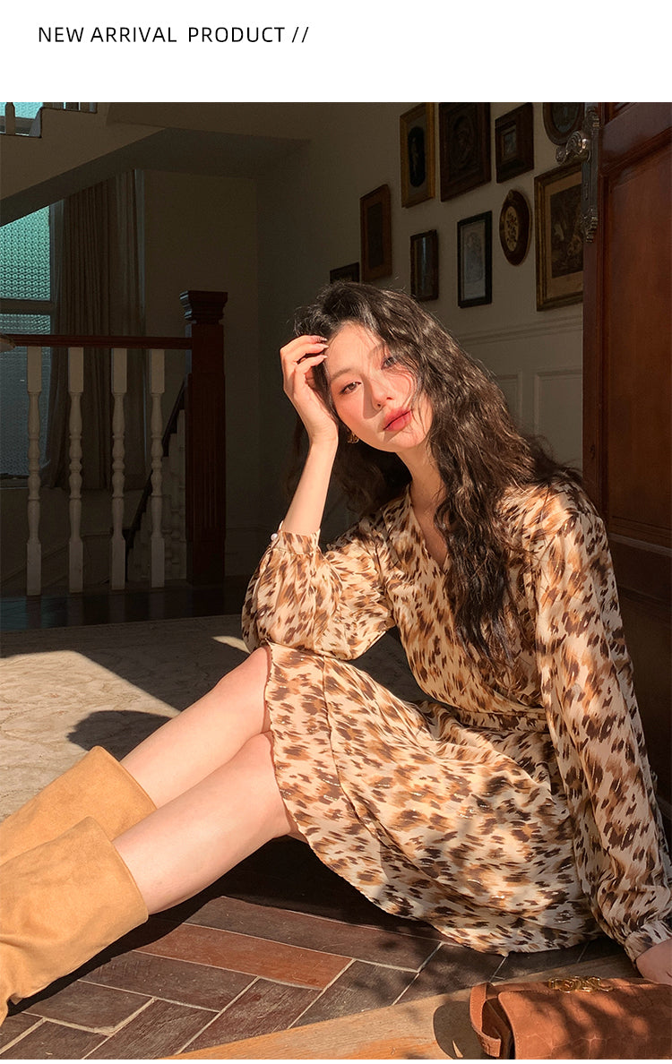 【F60224】實拍S~2XL高單春季法式復古V領豹紋雪紡洋裝250304