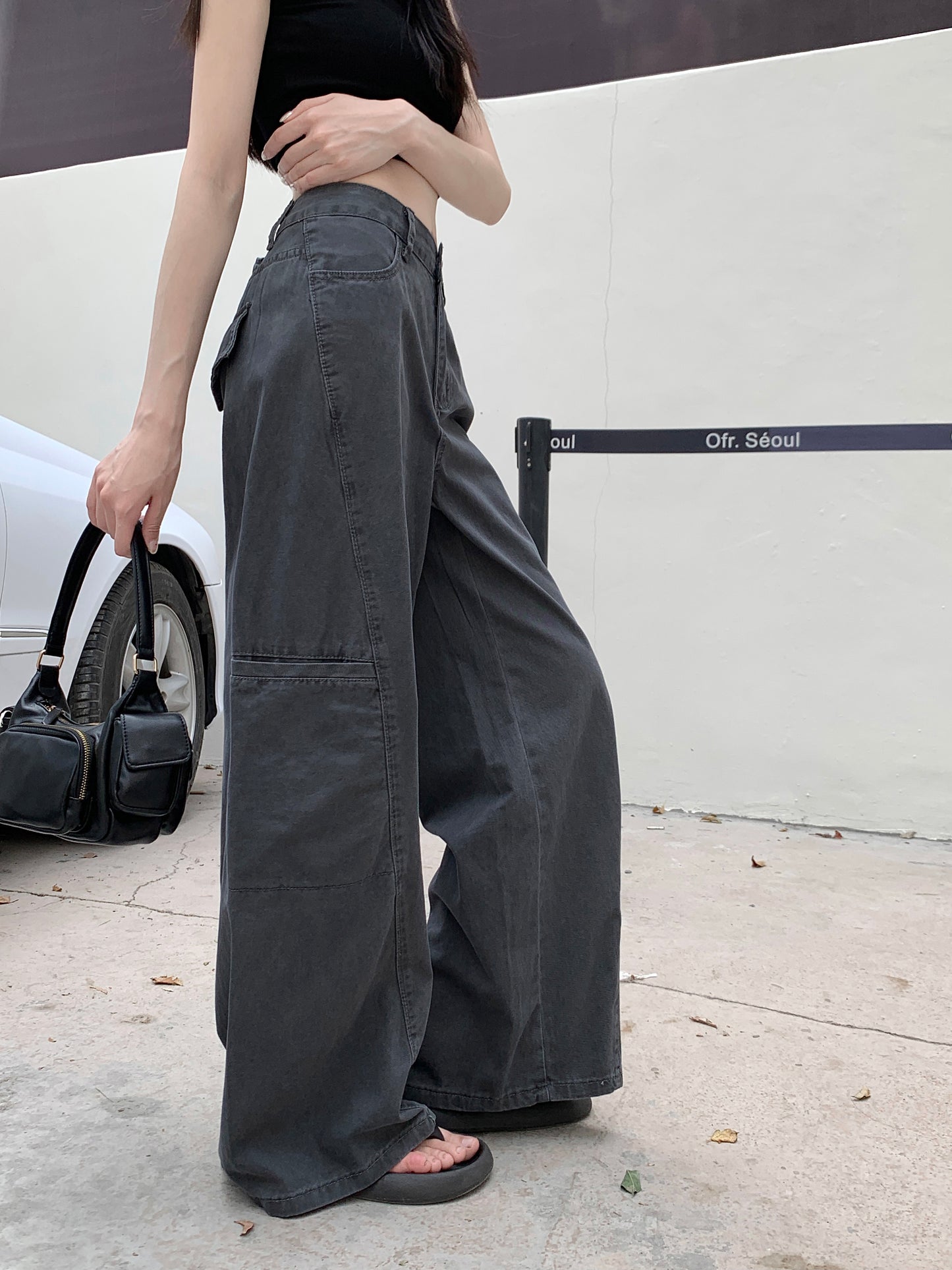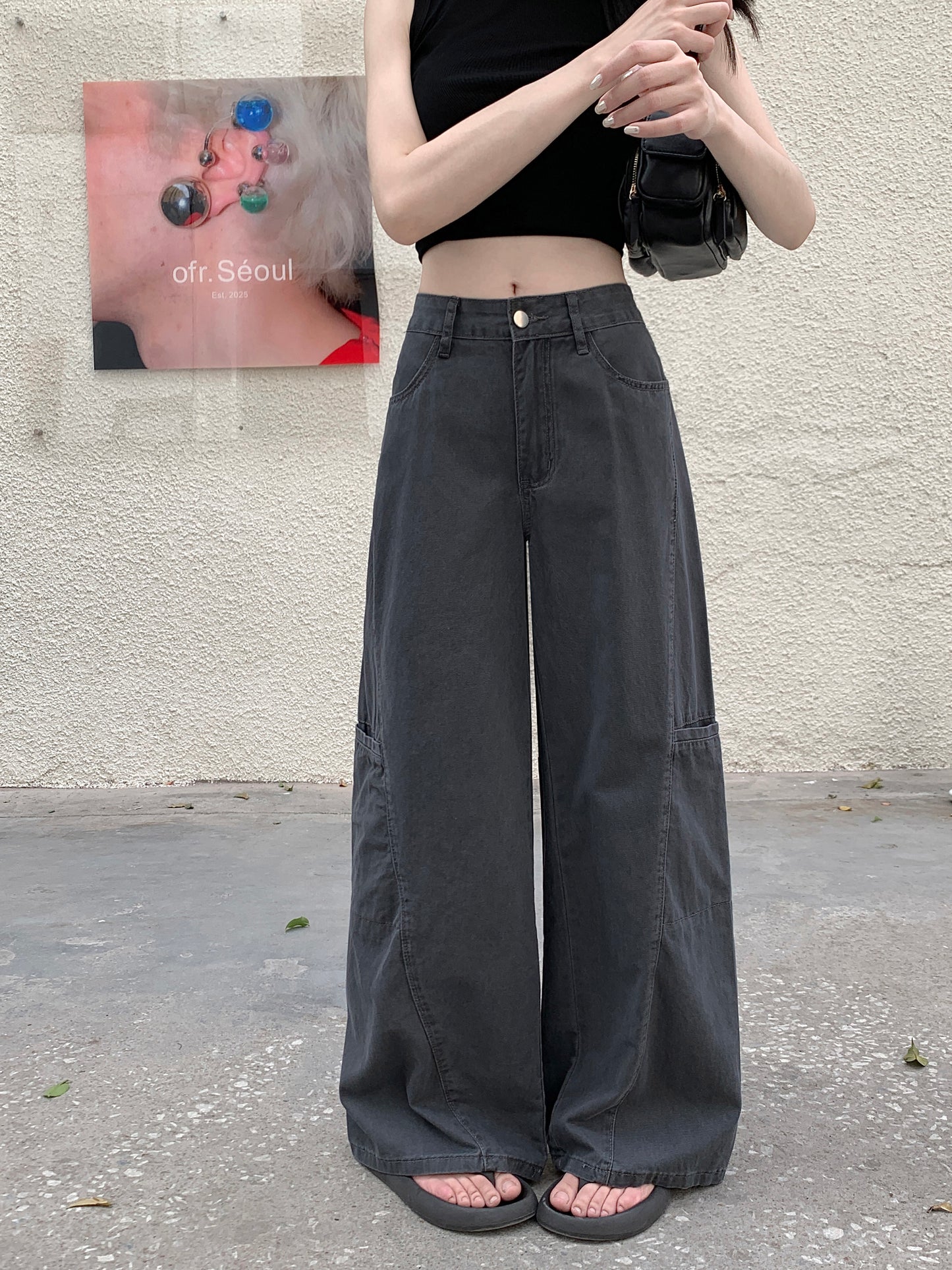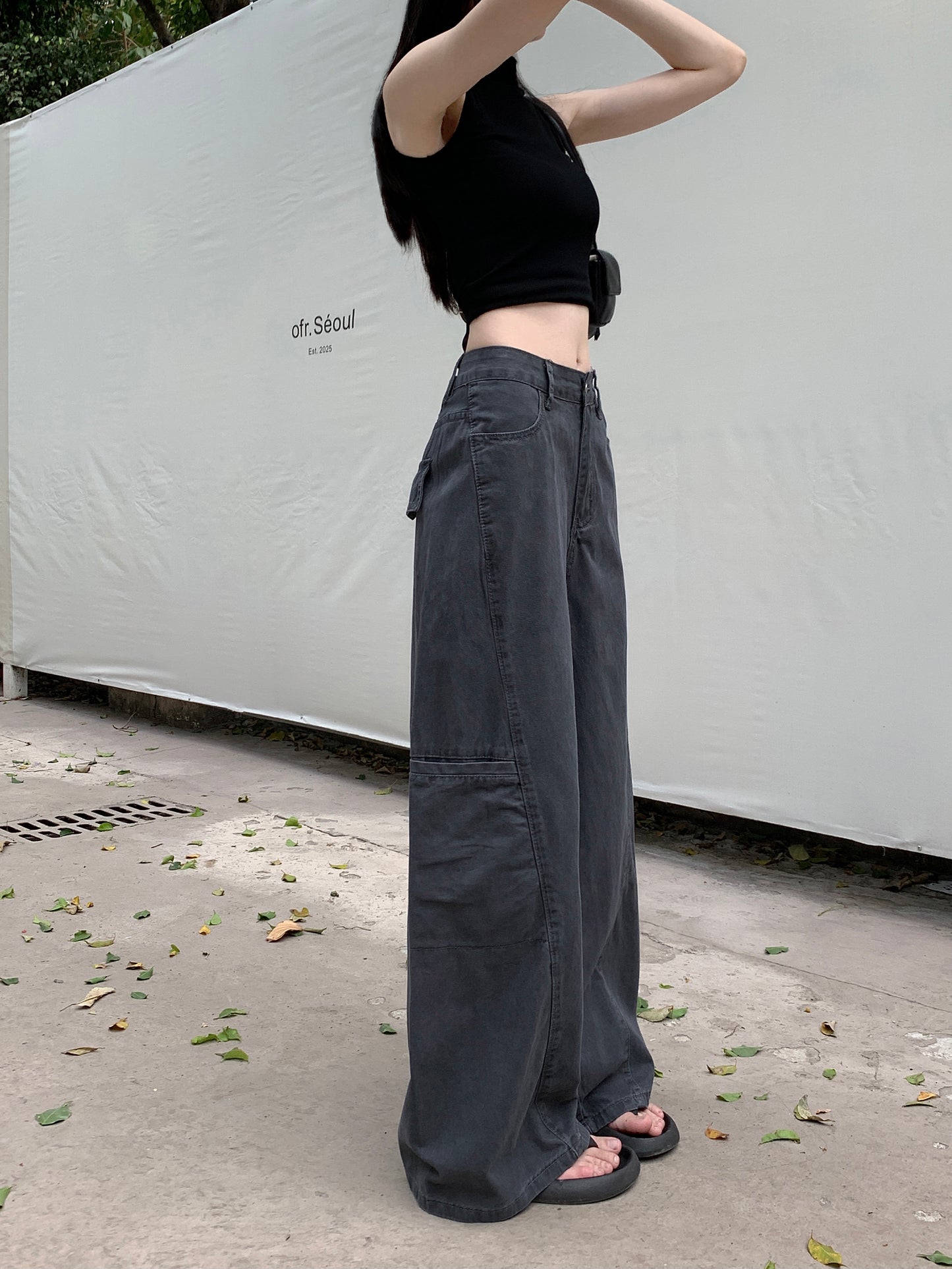 【F60296】實拍S~XL灰色多口袋工裝牛仔褲250401