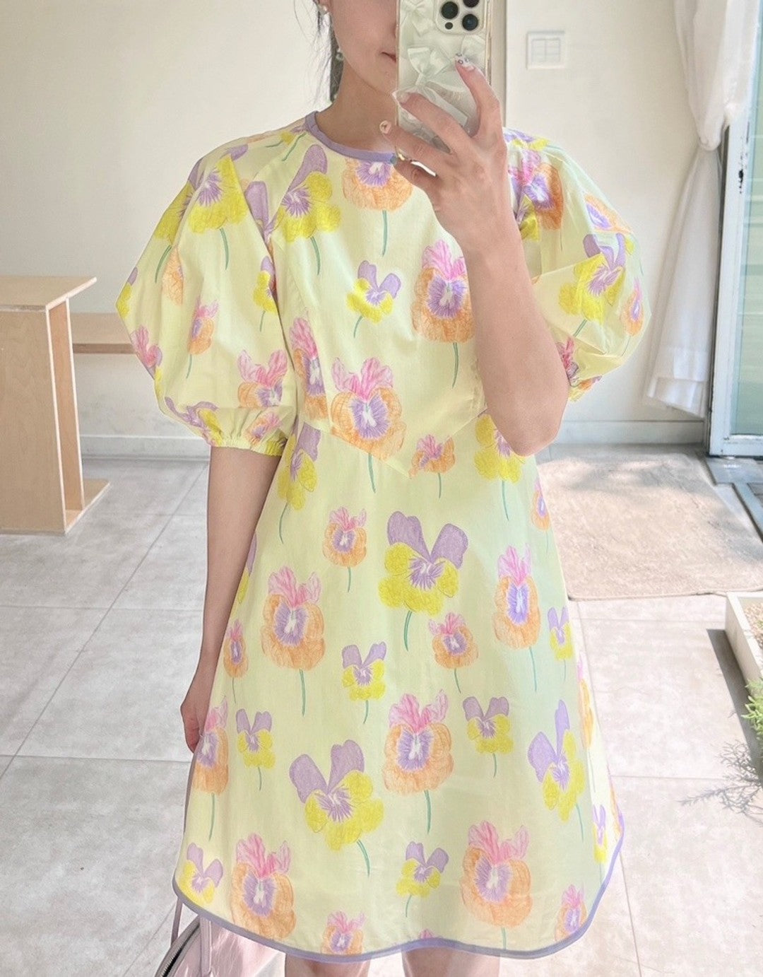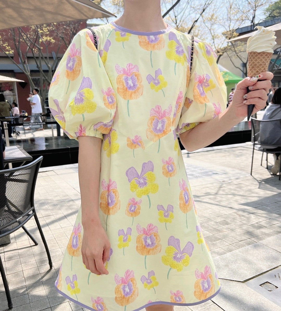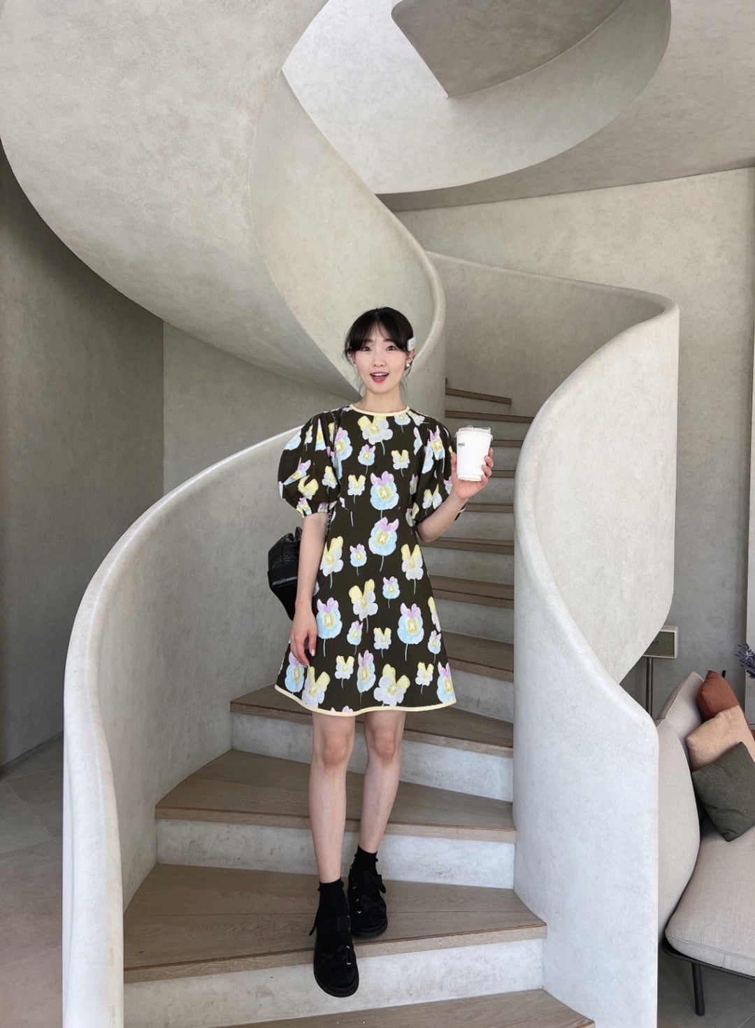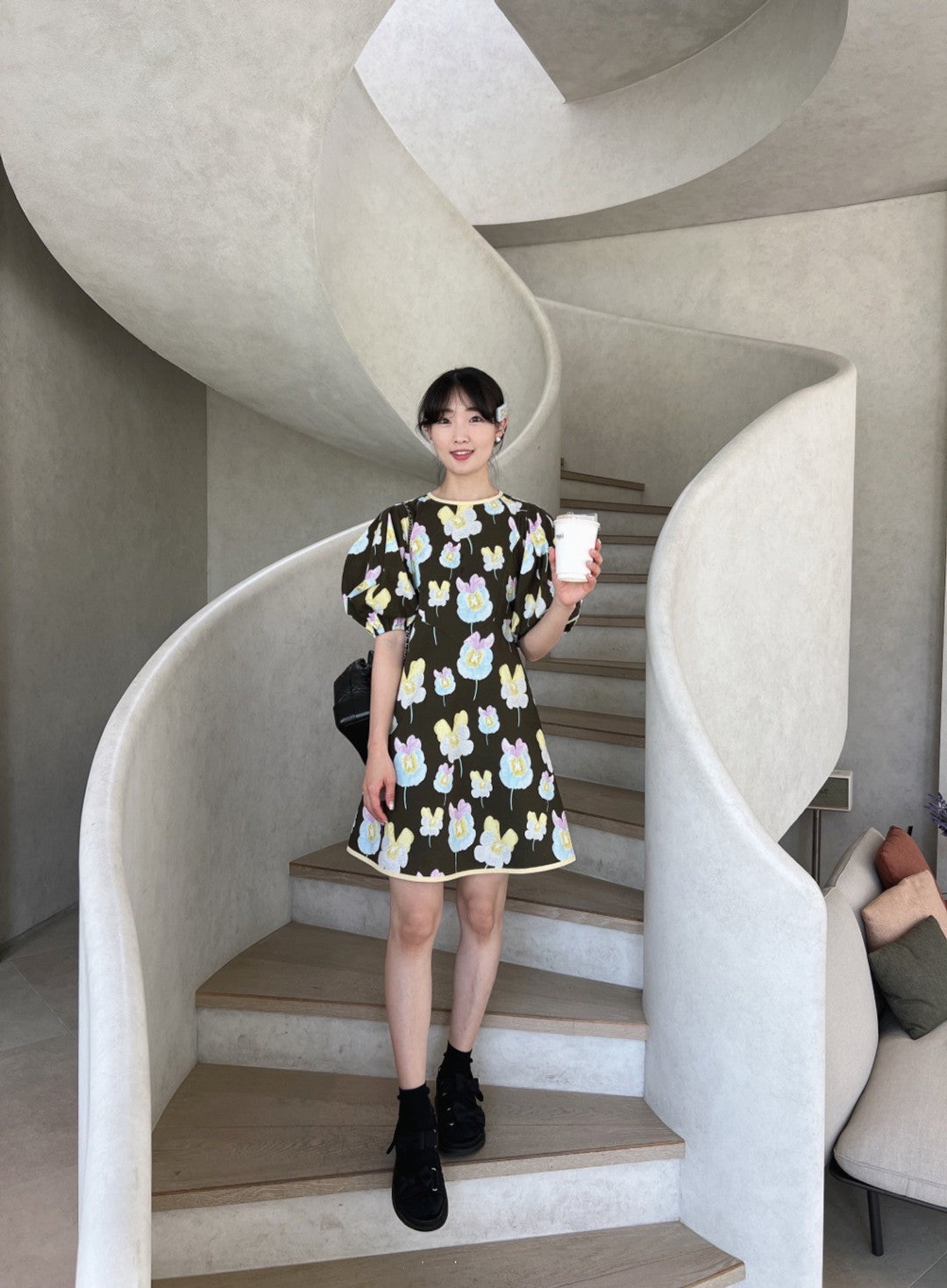 【F60307】夏天韓國東大門大花朵圓領泡泡袖a字洋裝250401