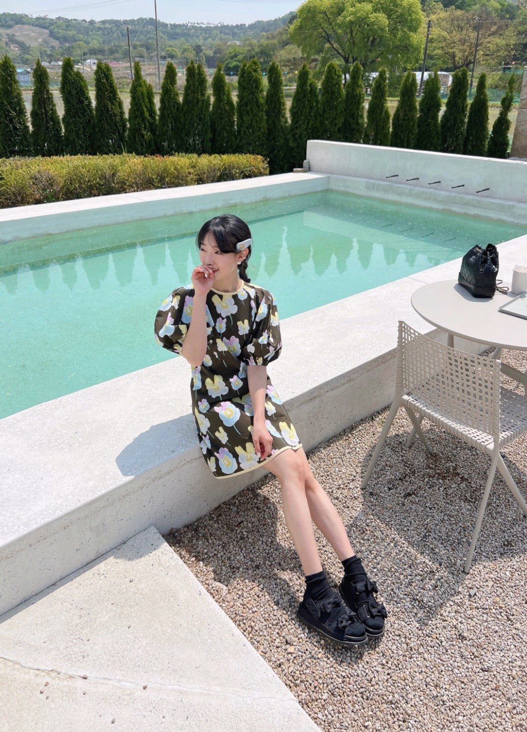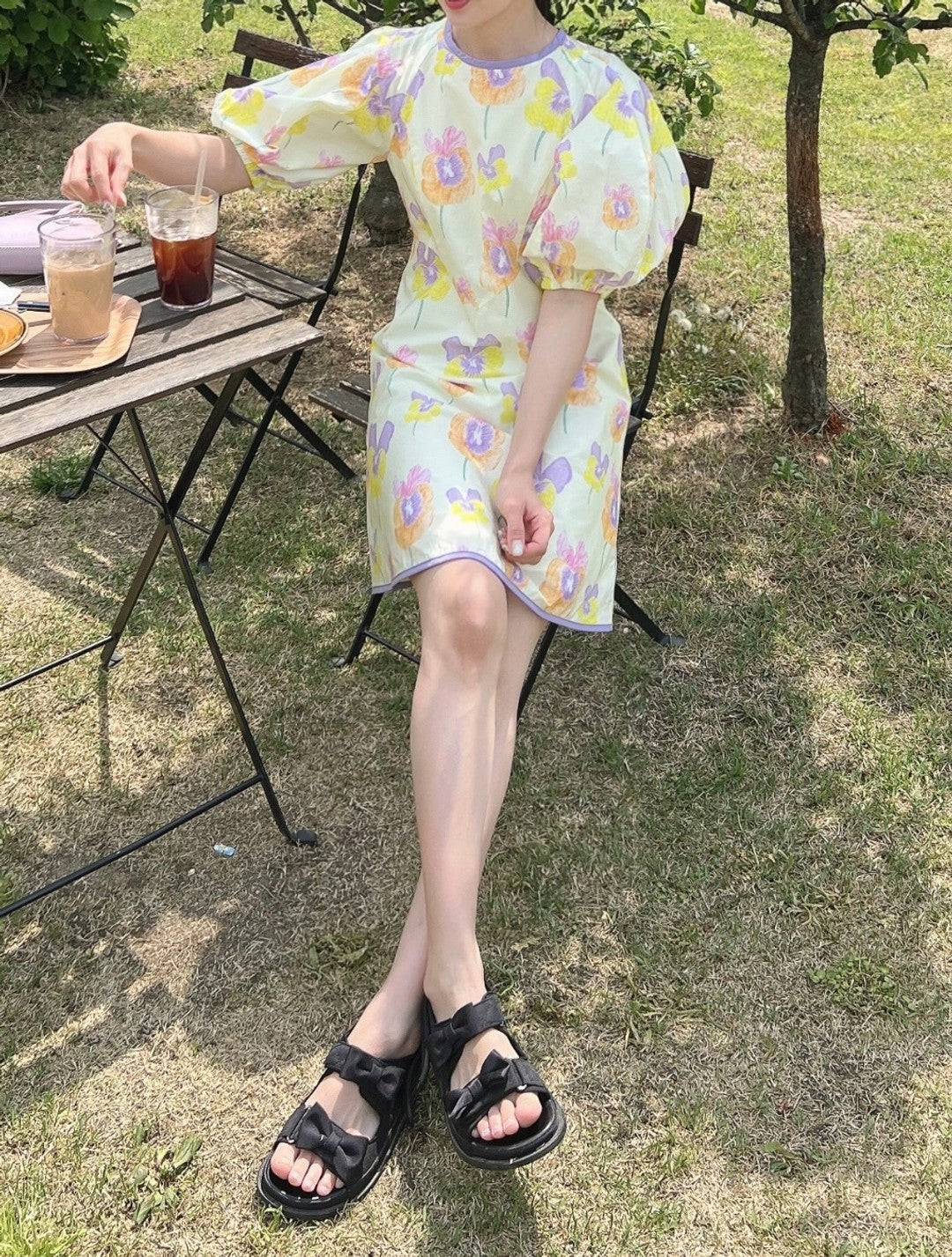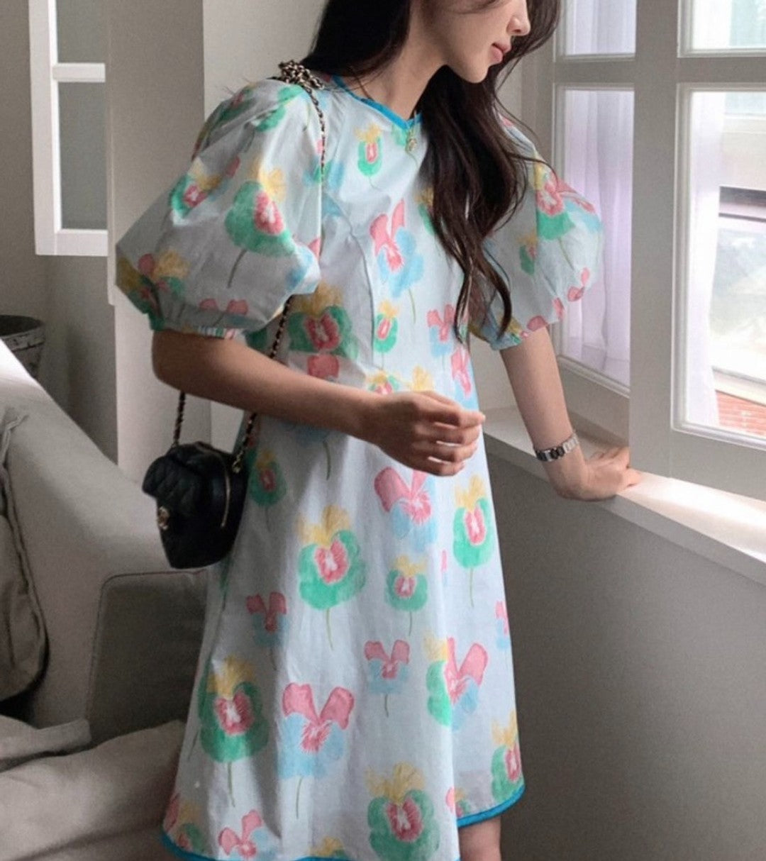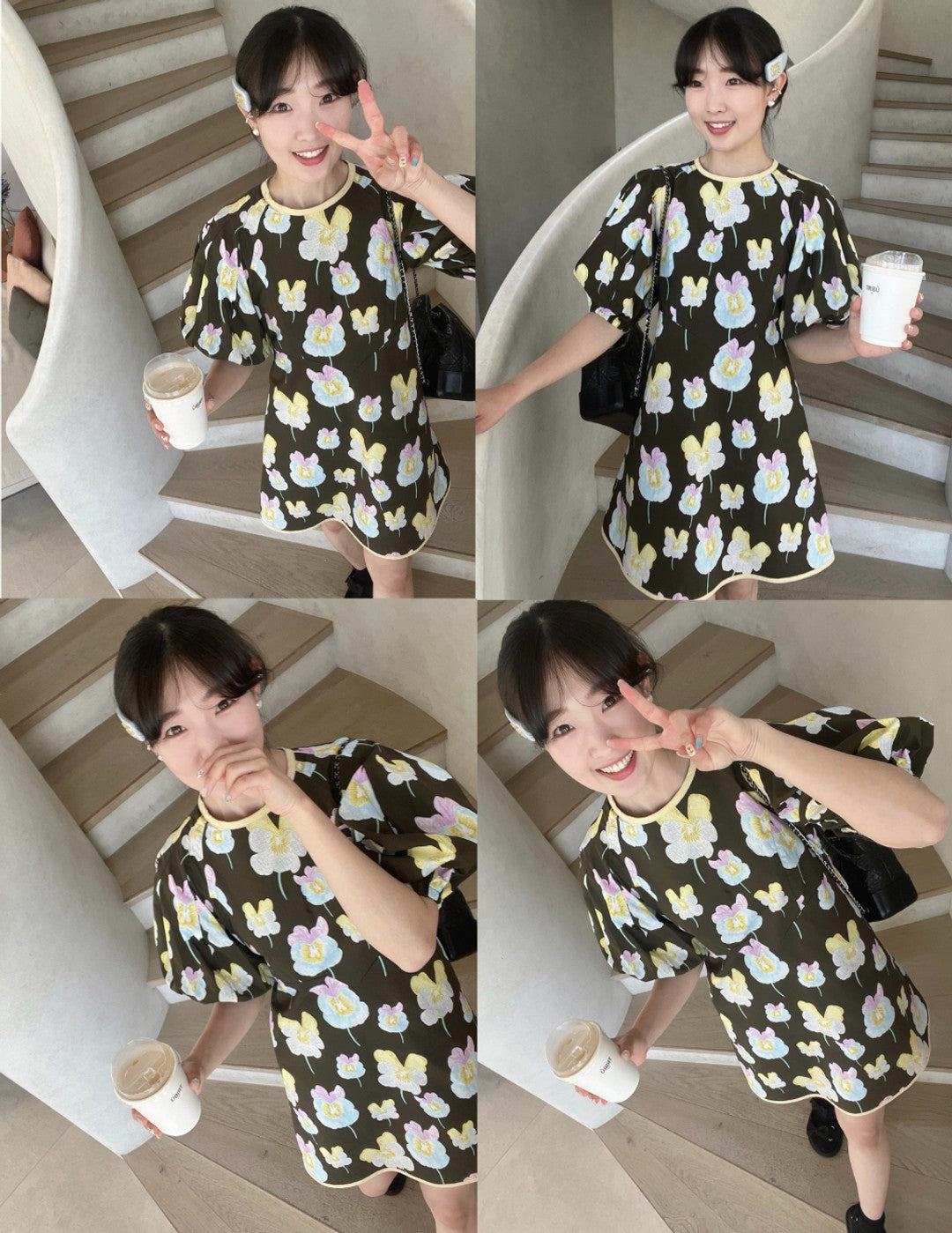【F60307】夏天韓國東大門大花朵圓領泡泡袖a字洋裝250401
