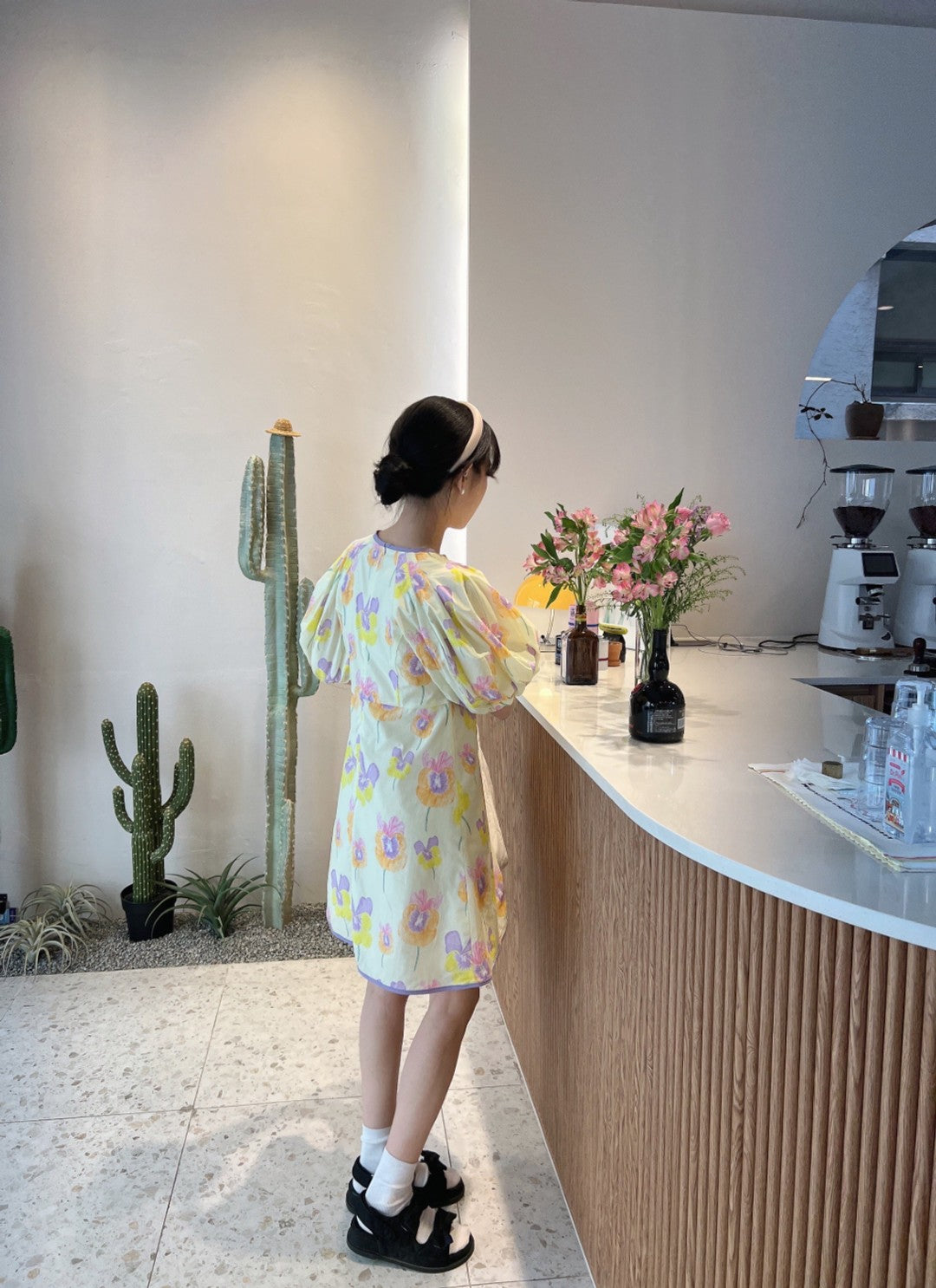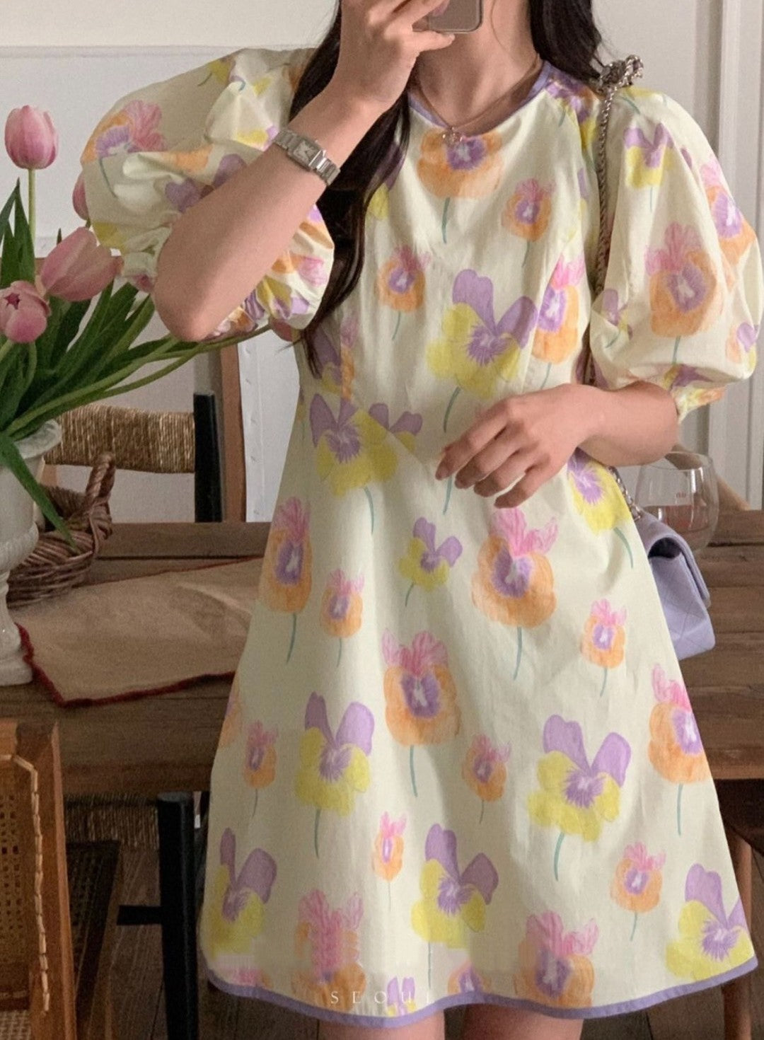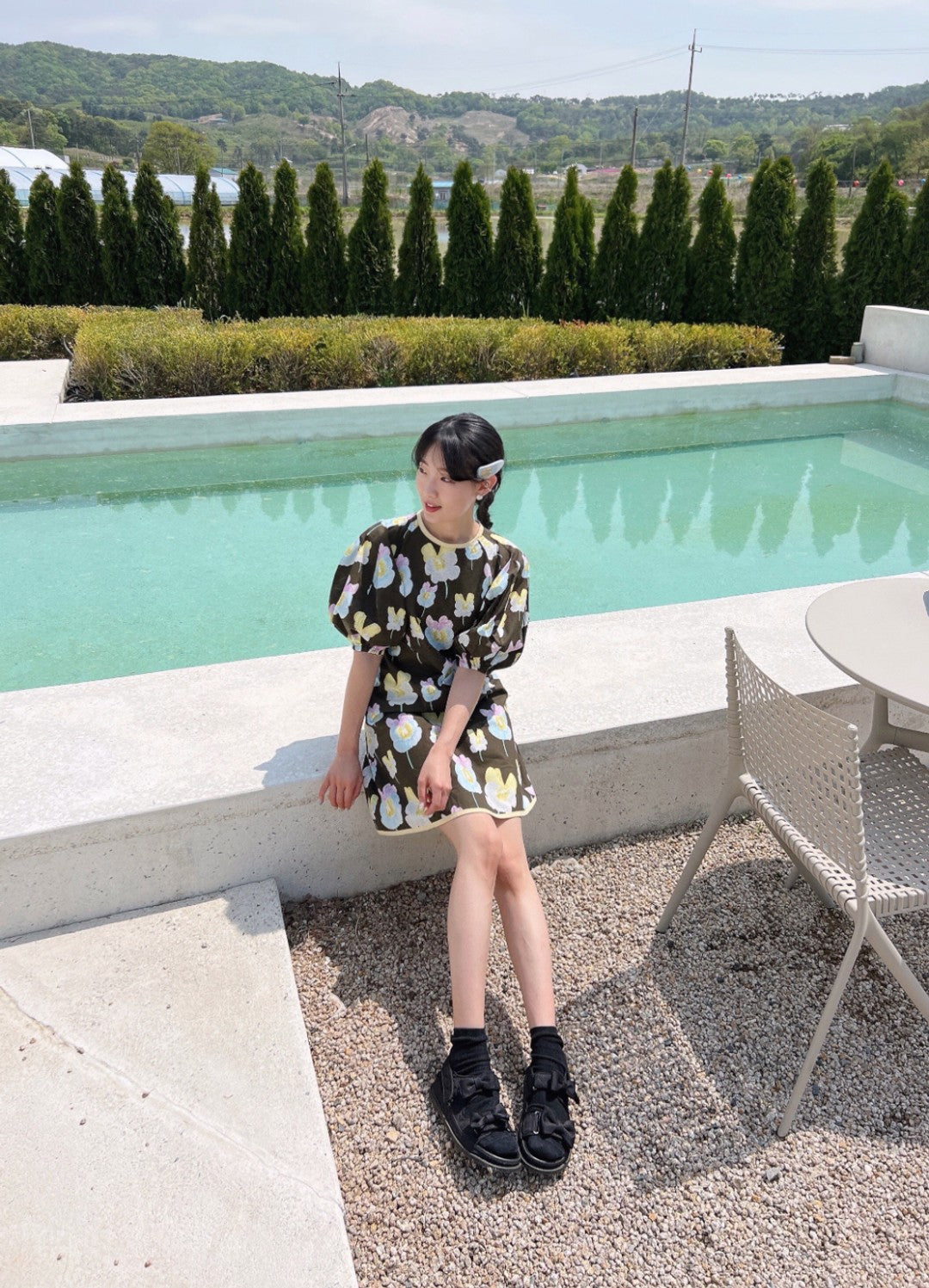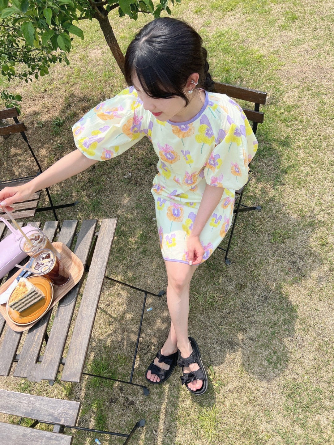 【F60307】夏天韓國東大門大花朵圓領泡泡袖a字洋裝250401