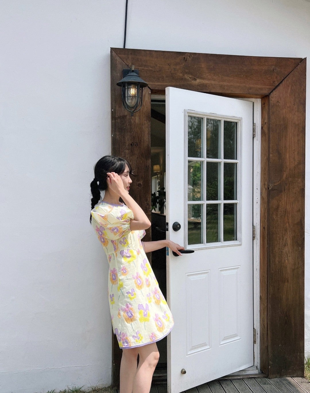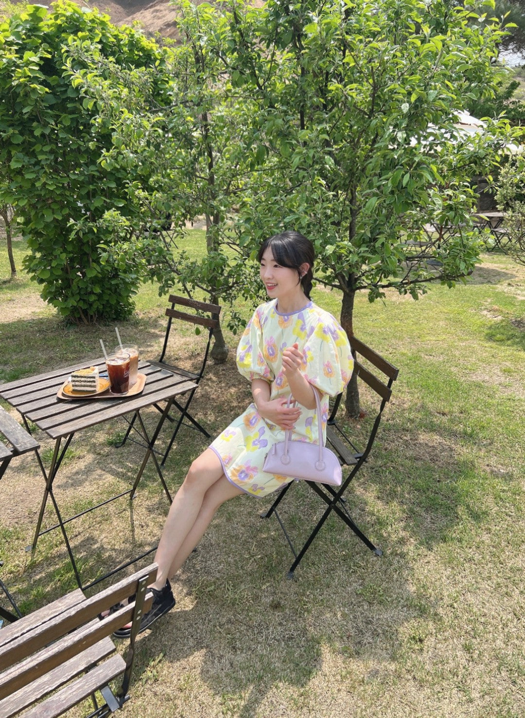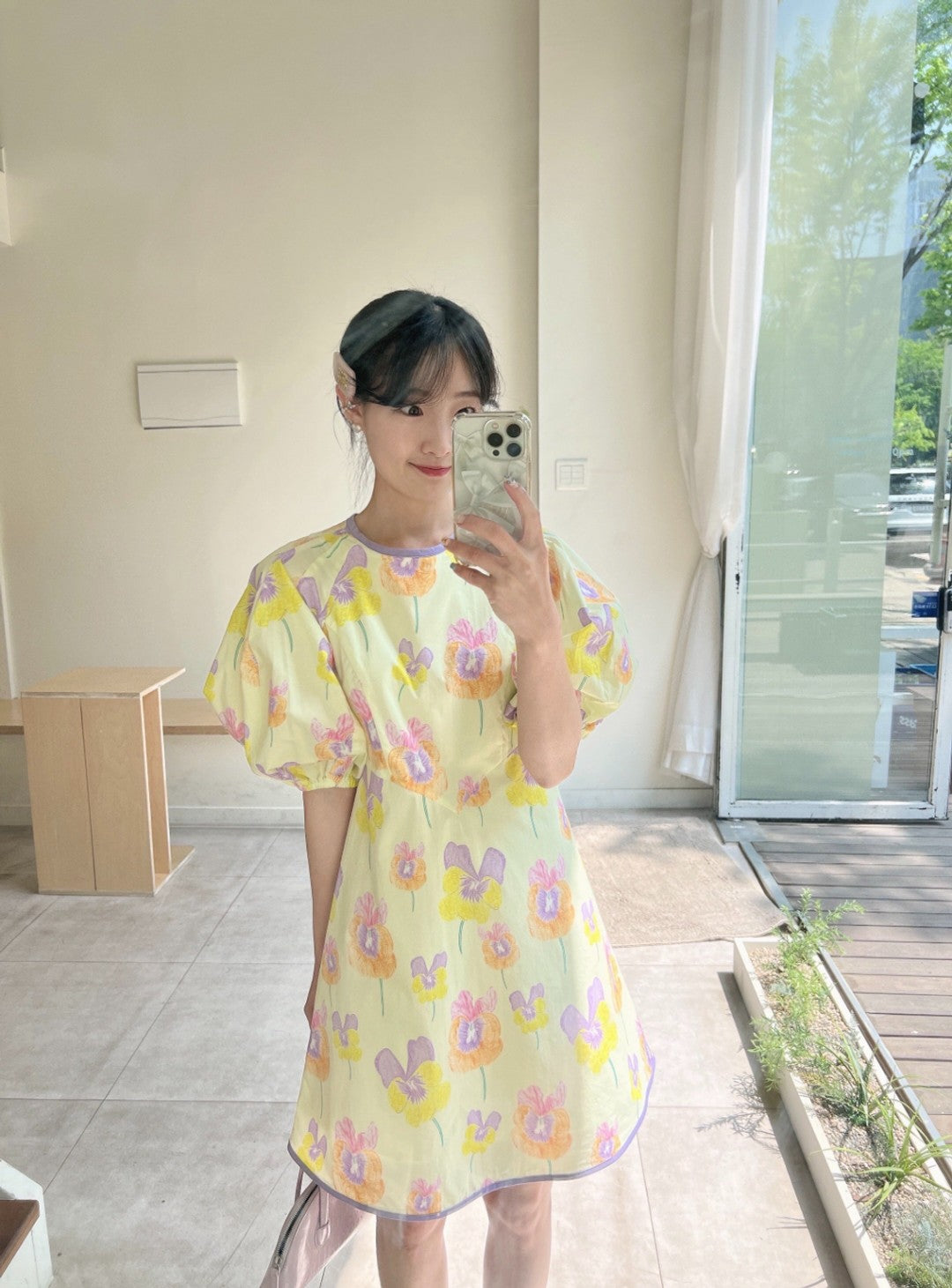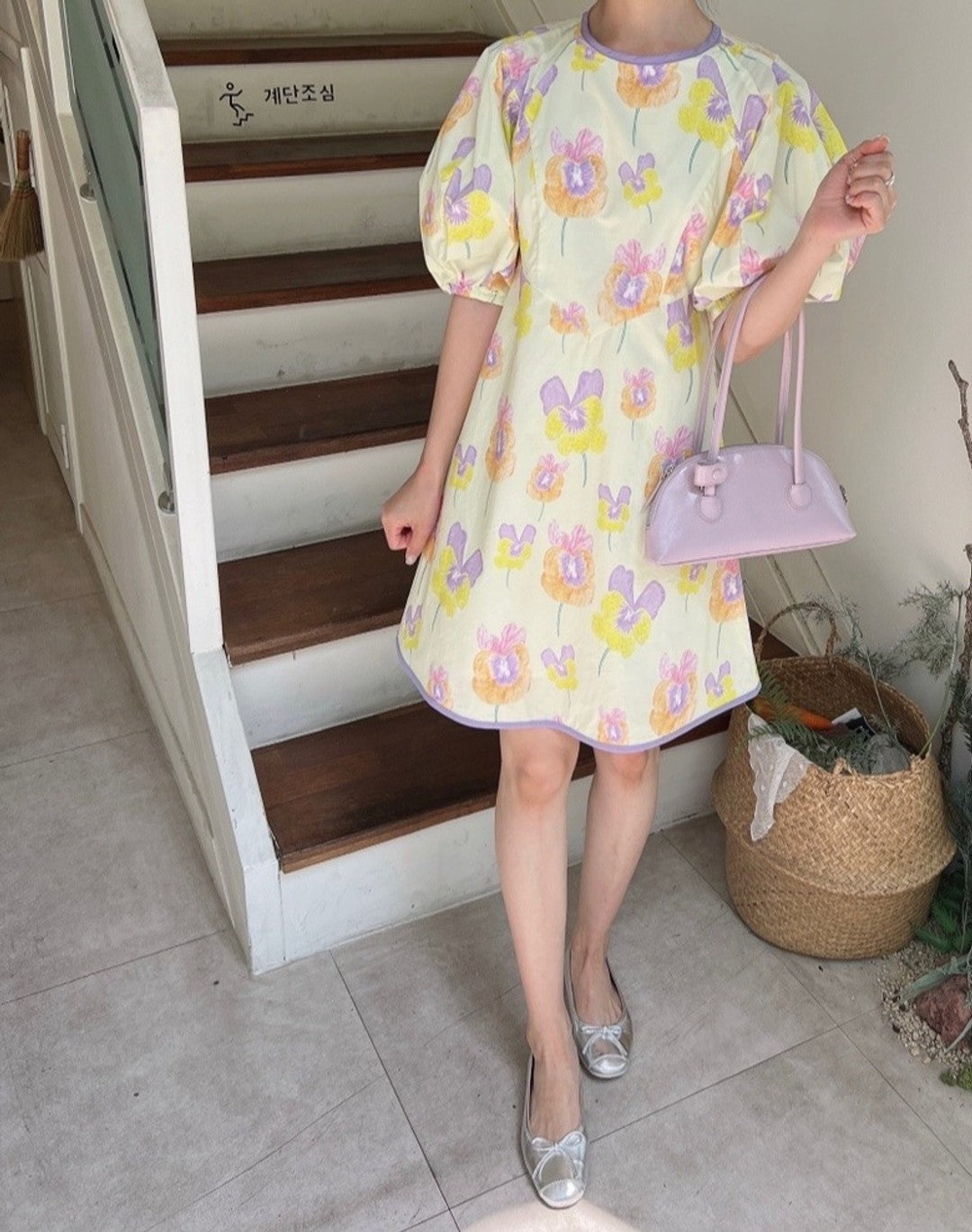 【F60307】夏天韓國東大門大花朵圓領泡泡袖a字洋裝250401