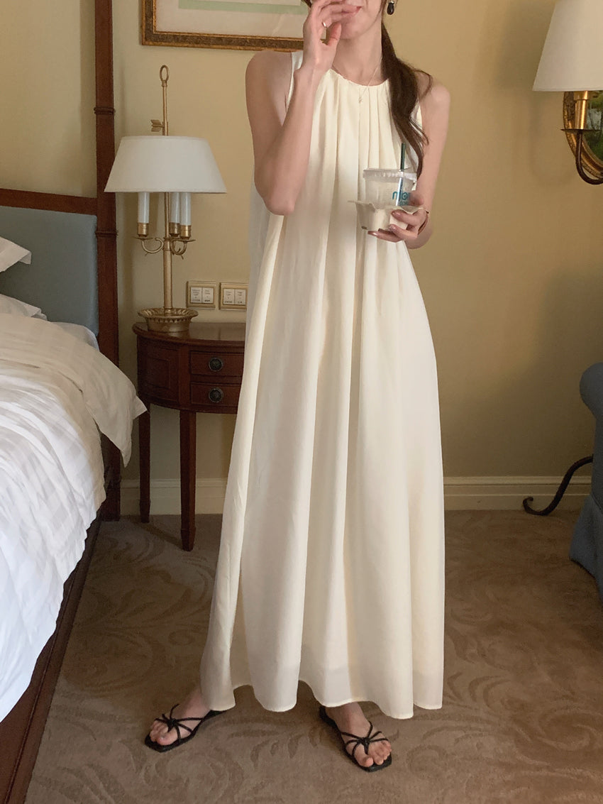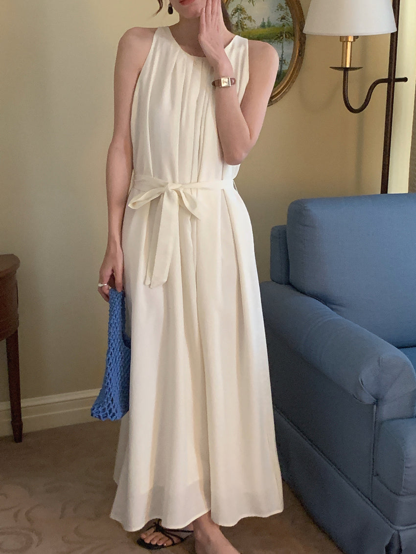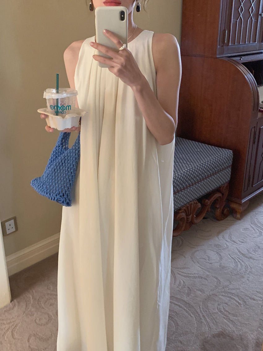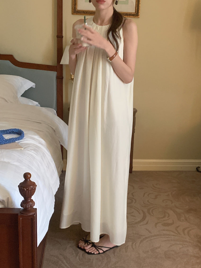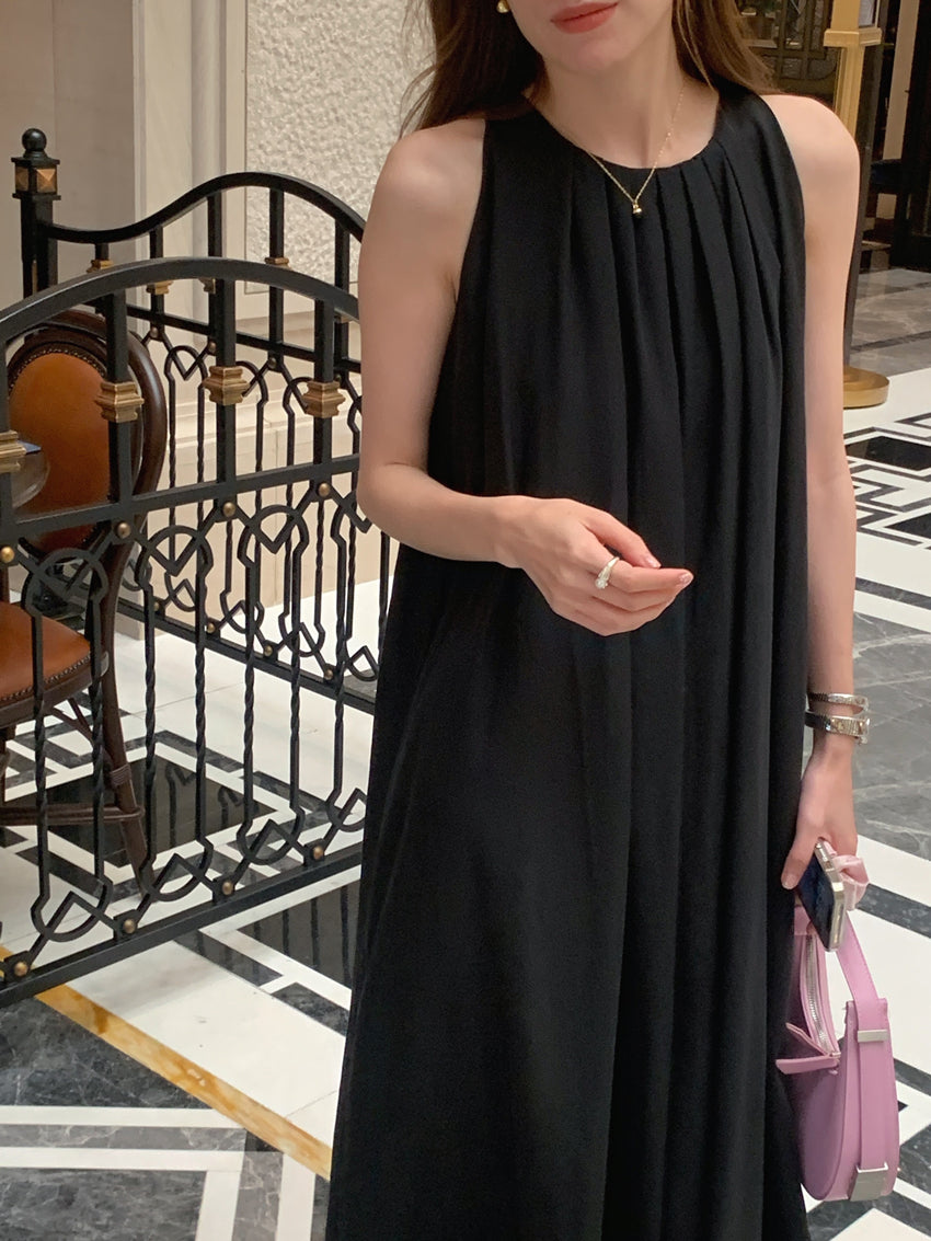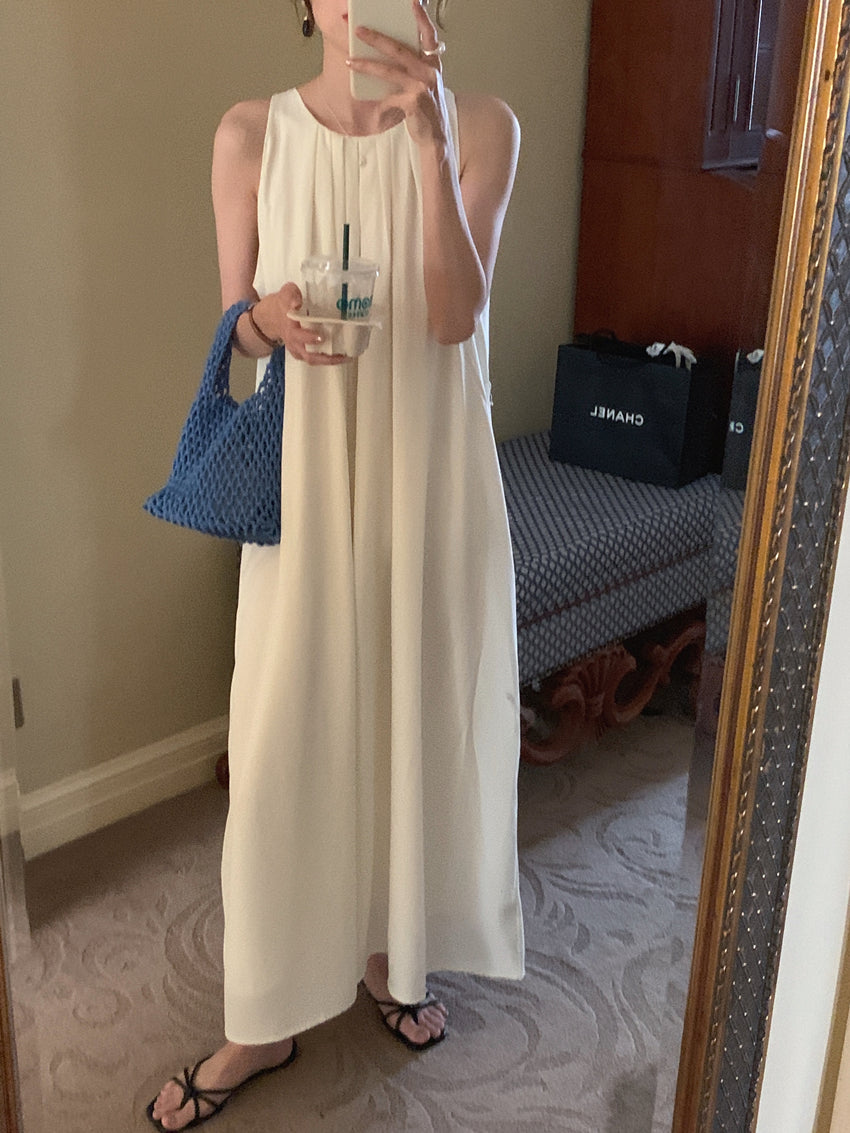 【F60310】實拍度假氣質慵懶 無袖收褶雪紡洋裝250401