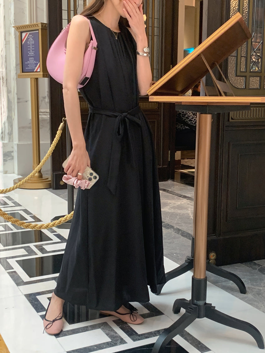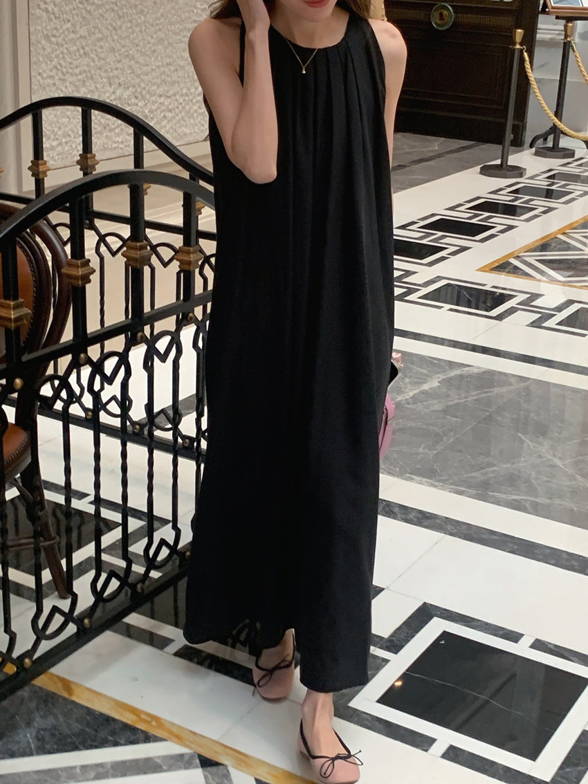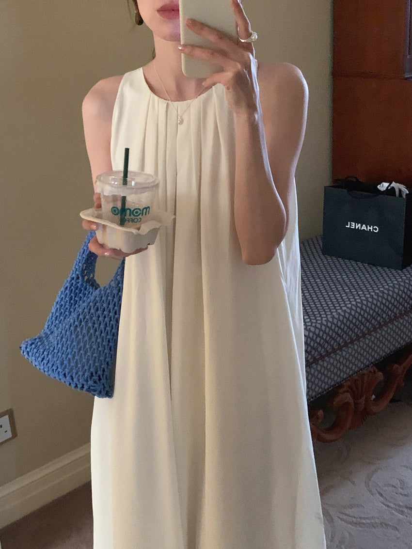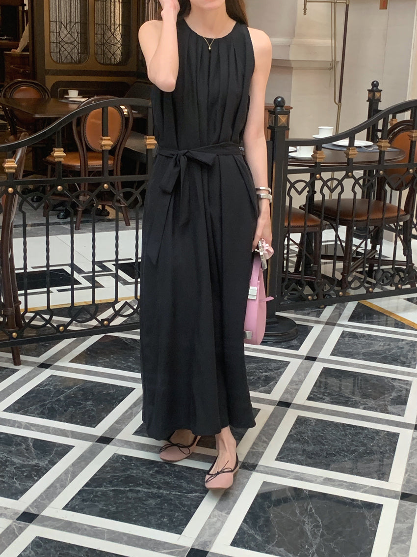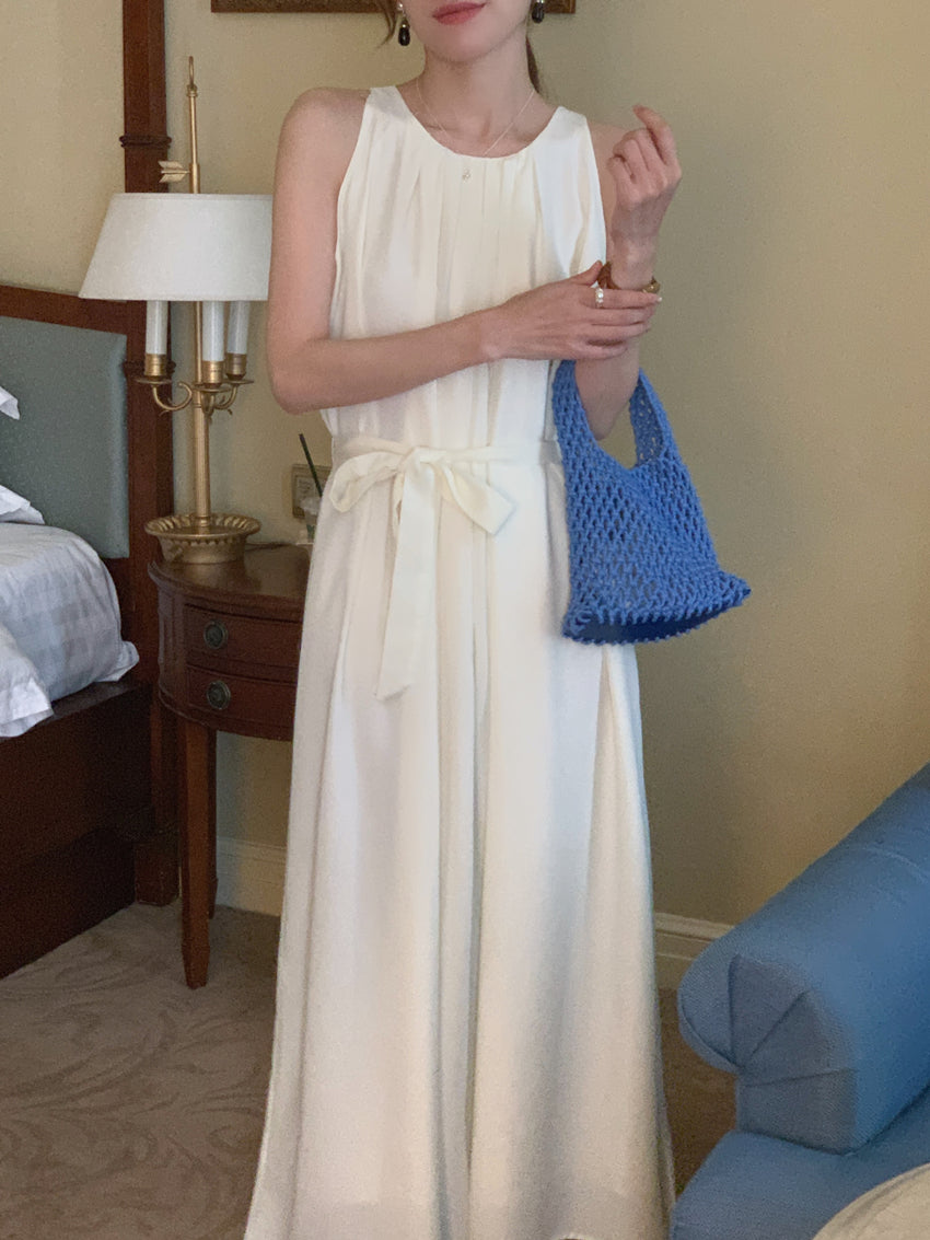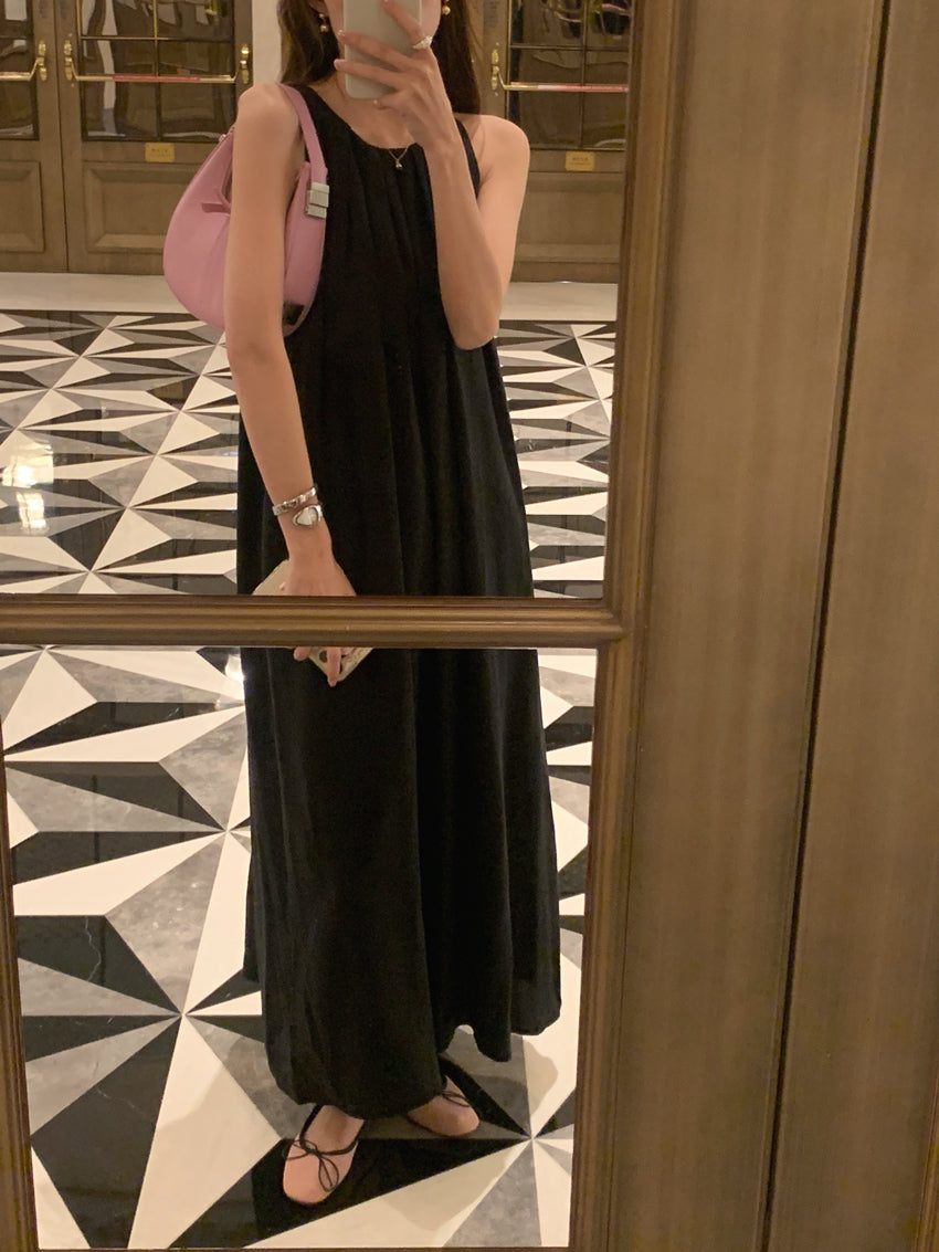 【F60310】實拍度假氣質慵懶 無袖收褶雪紡洋裝250401