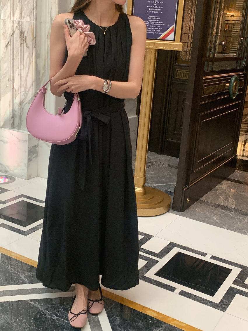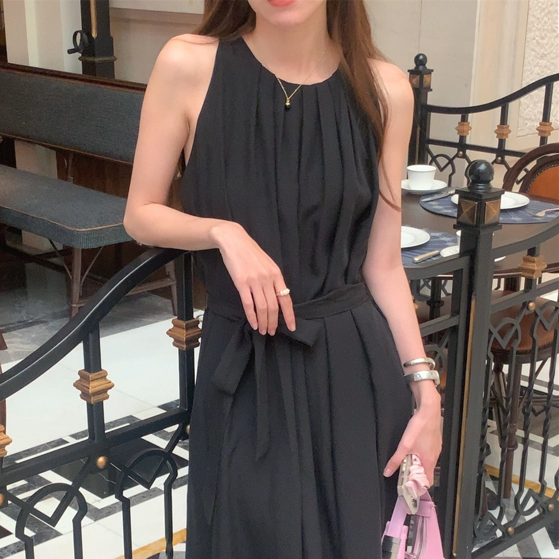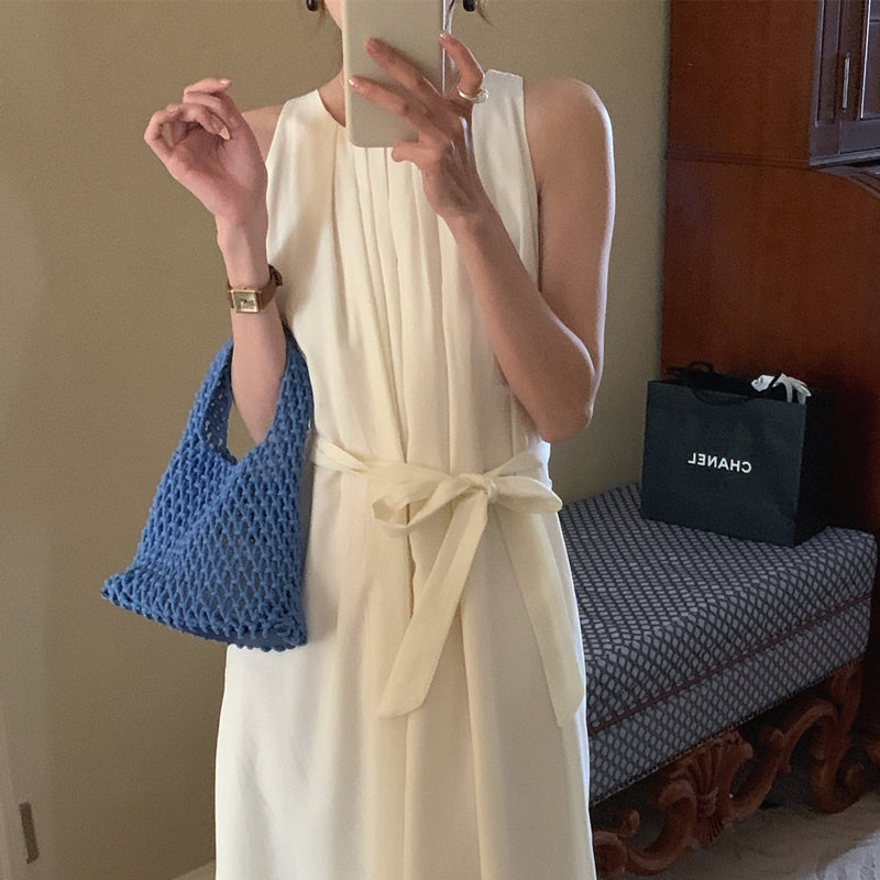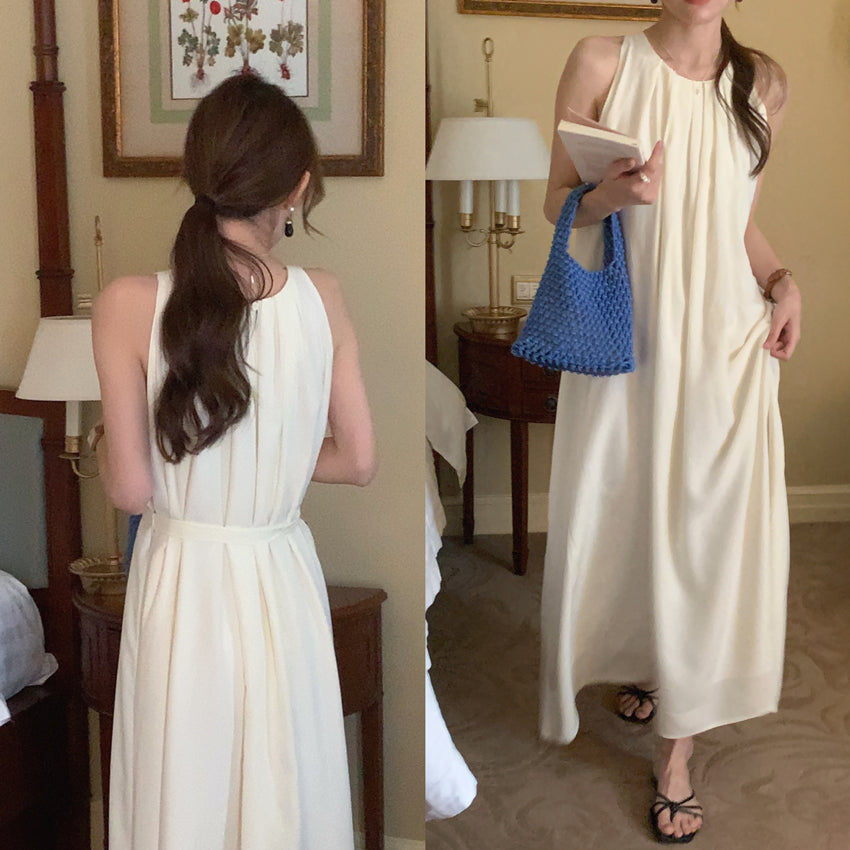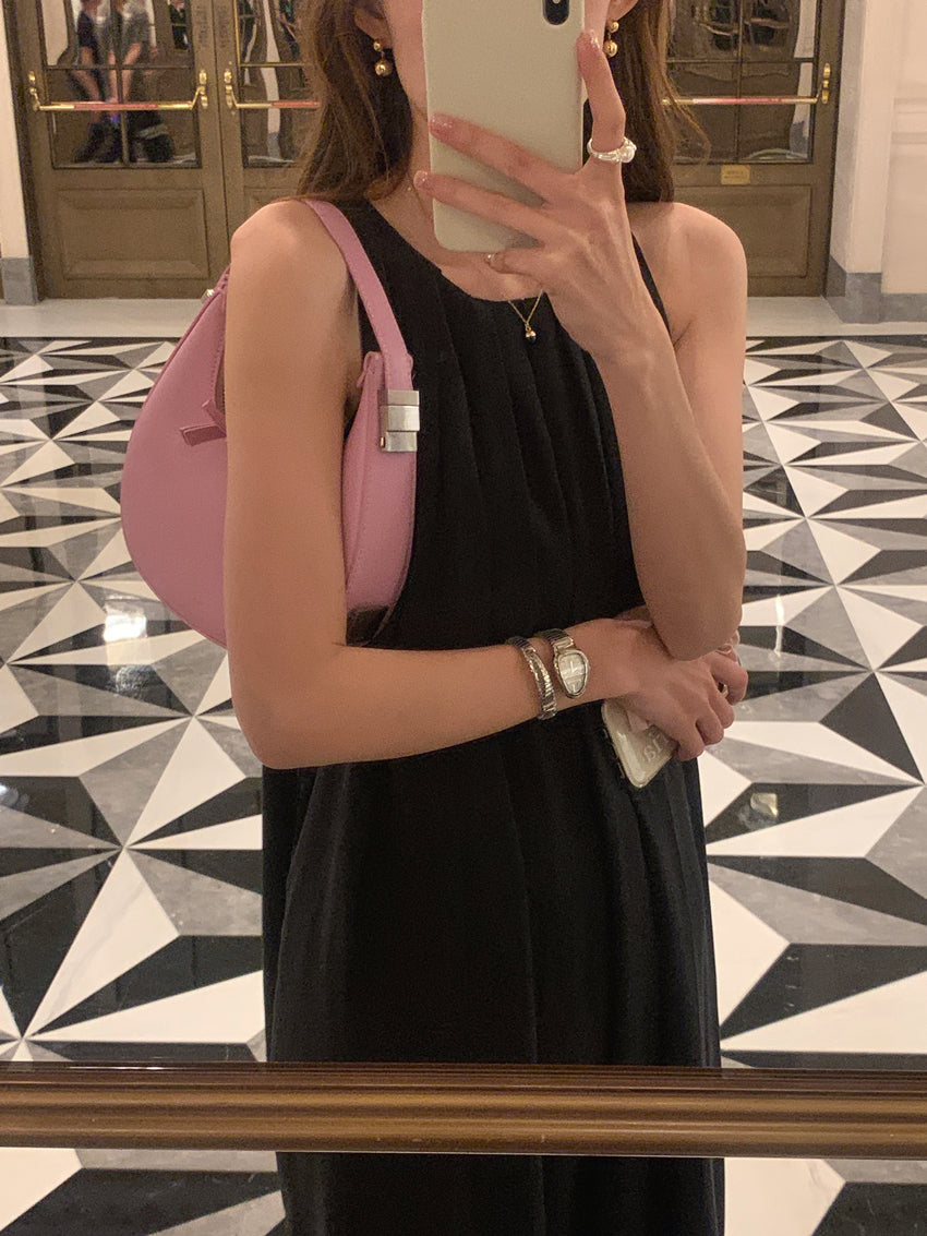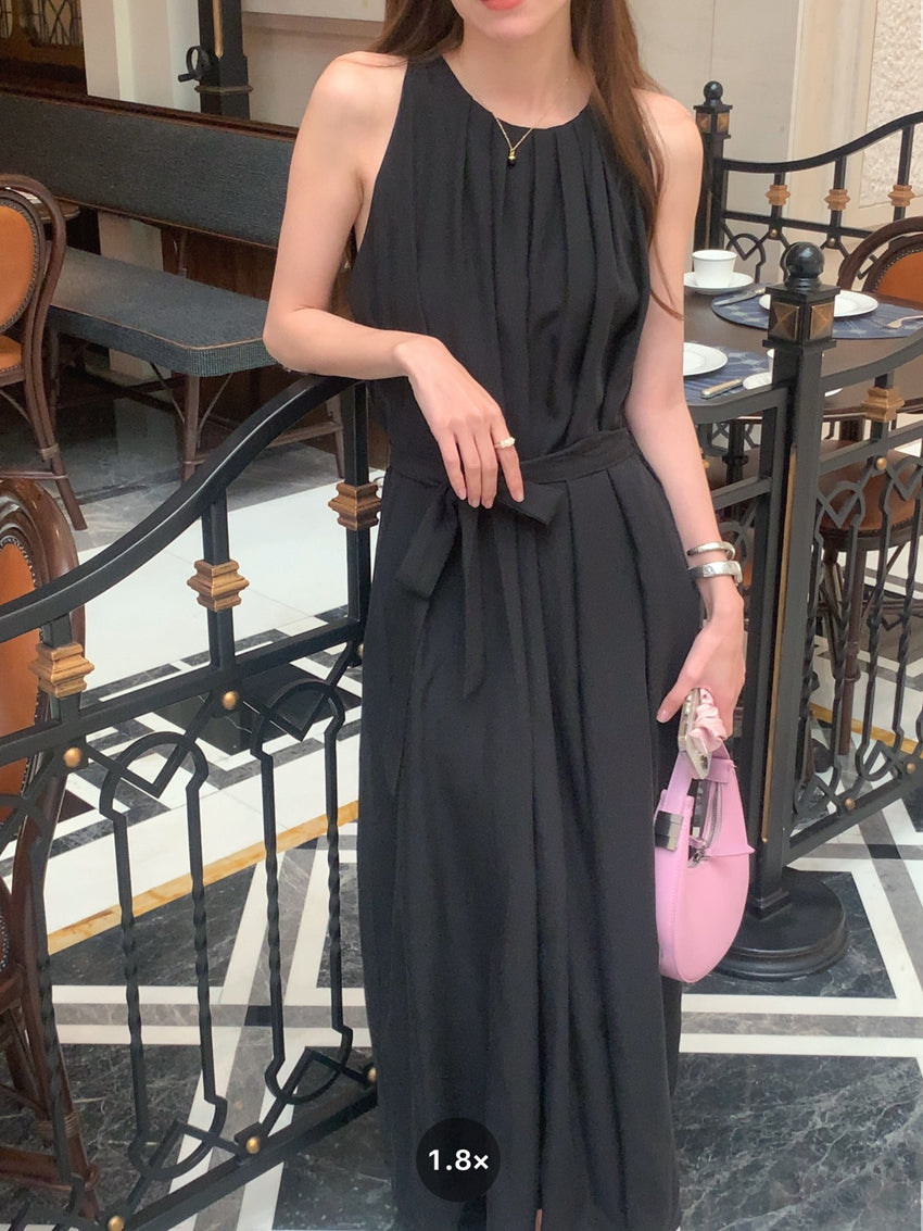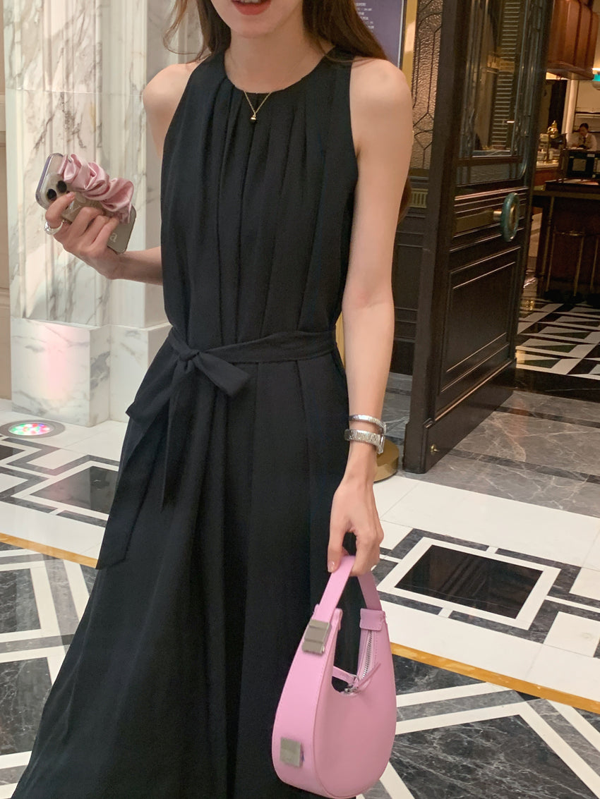 【F60310】實拍度假氣質慵懶 無袖收褶雪紡洋裝250401