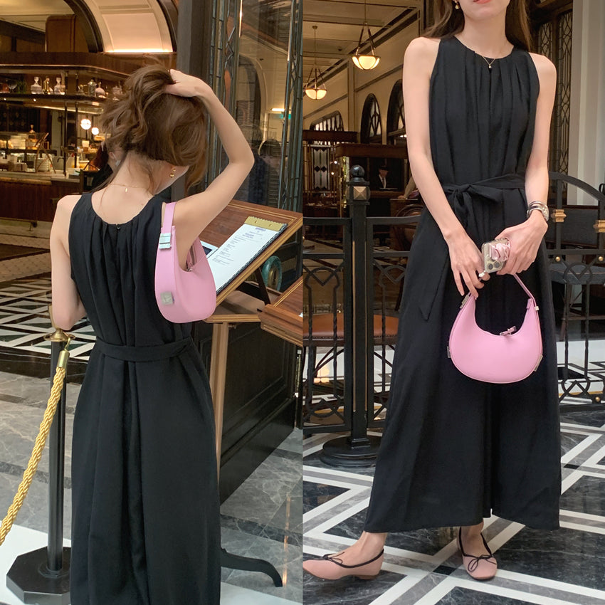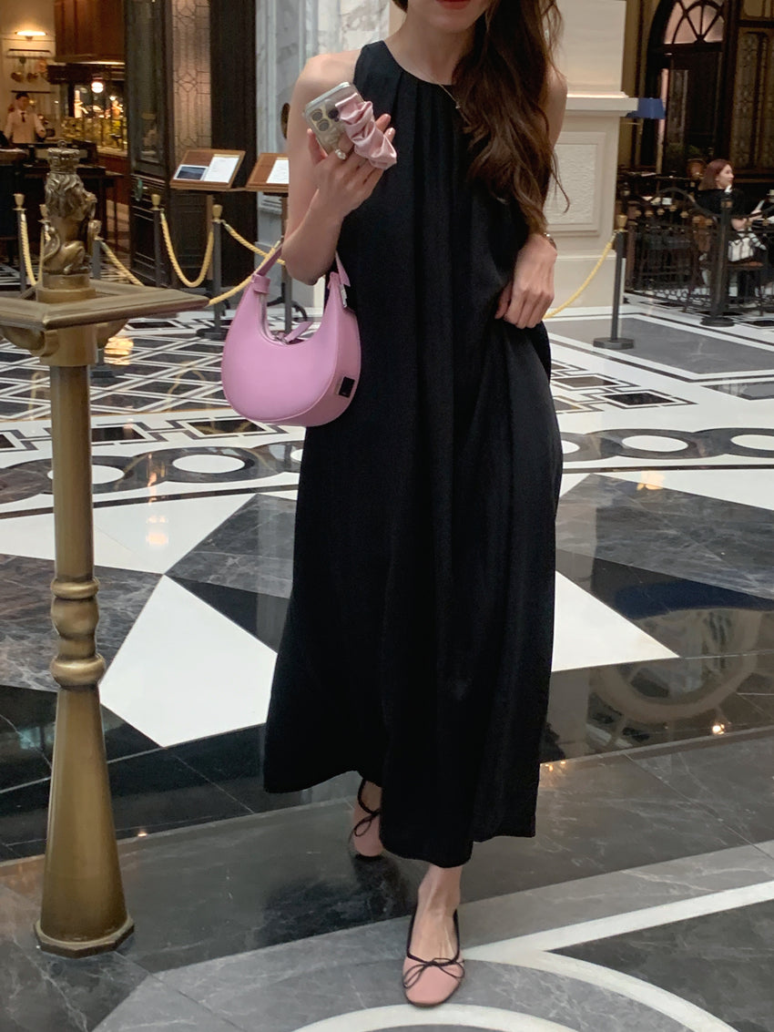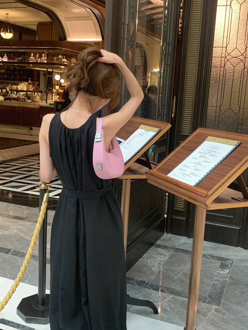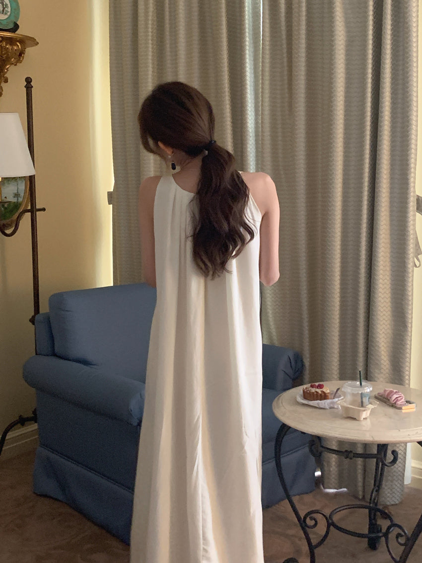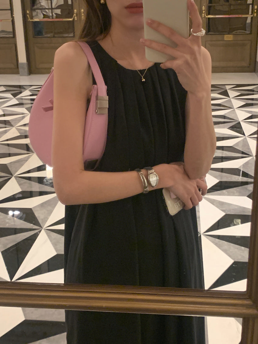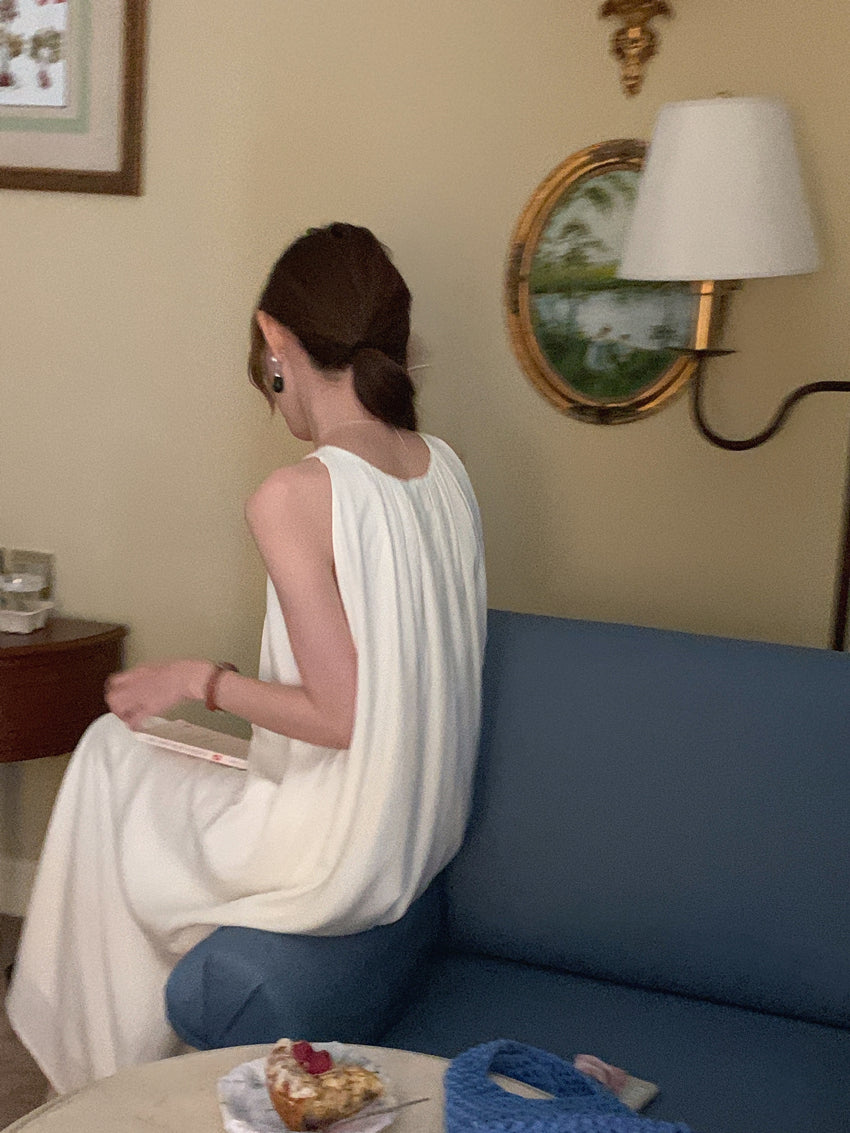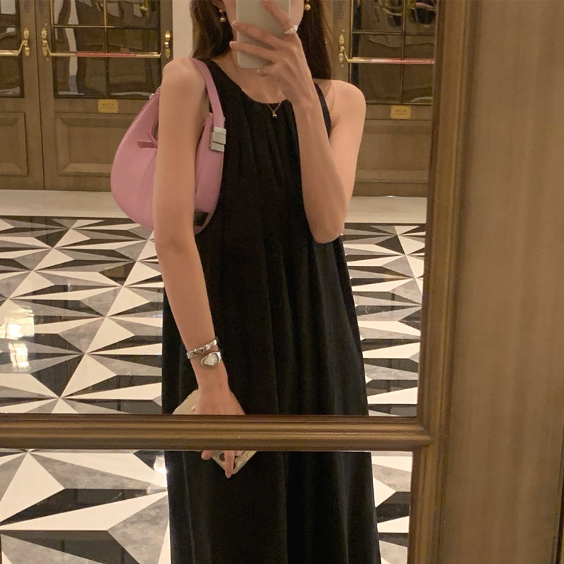 【F60310】實拍度假氣質慵懶 無袖收褶雪紡洋裝250401