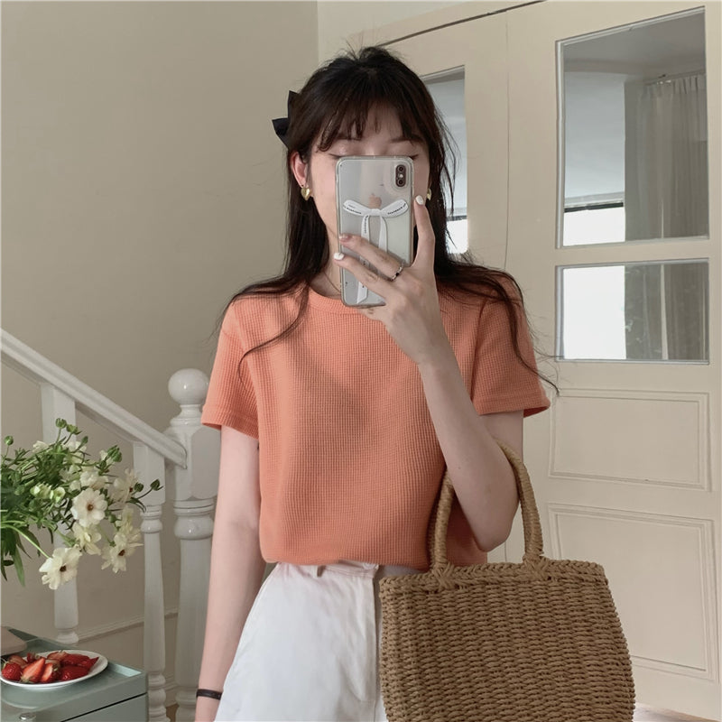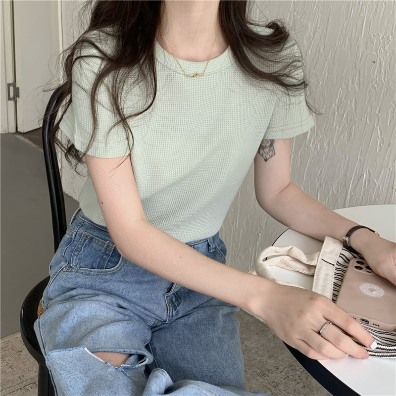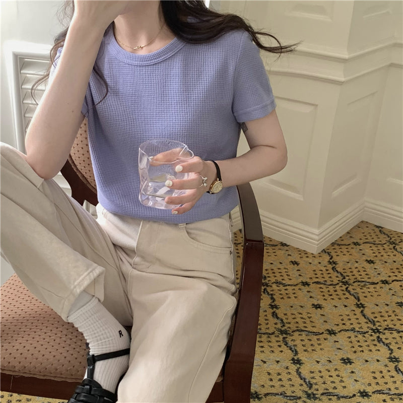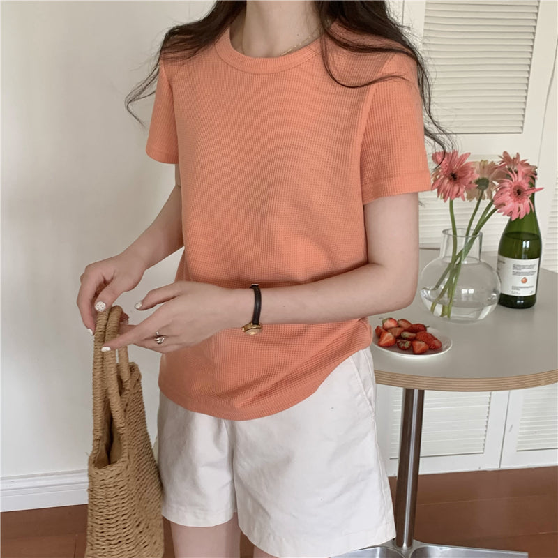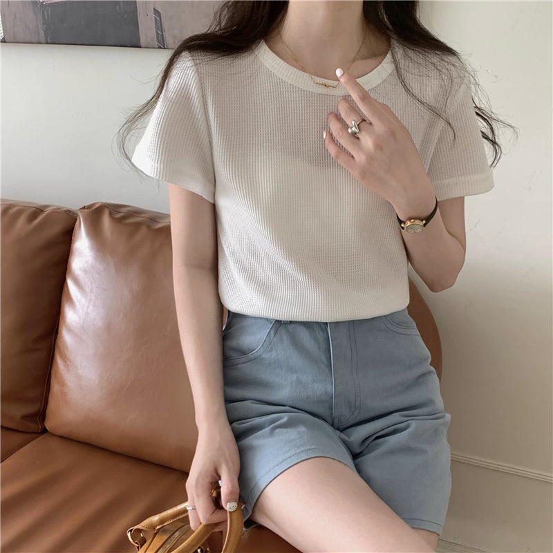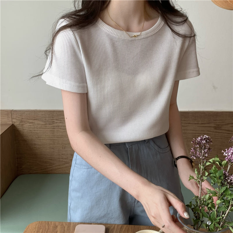【F60338】實拍簡約圓領華夫格寬鬆T恤250408