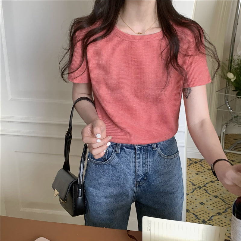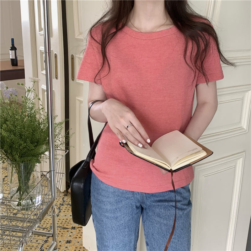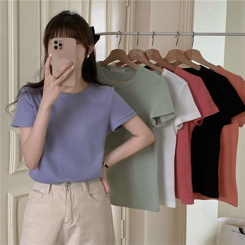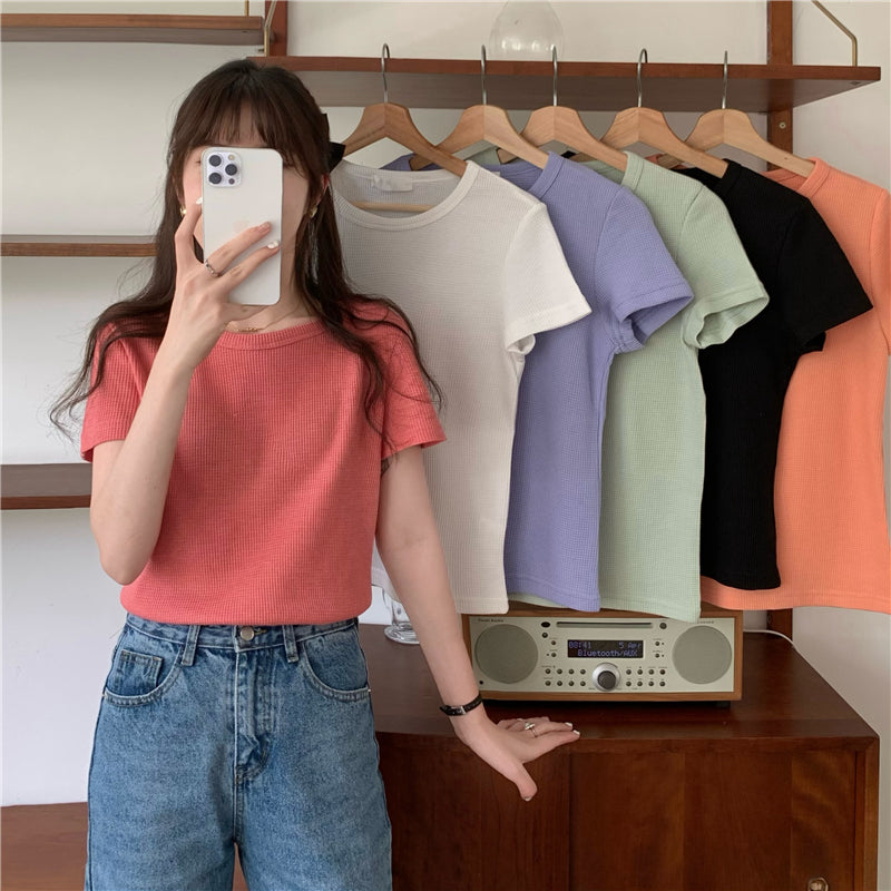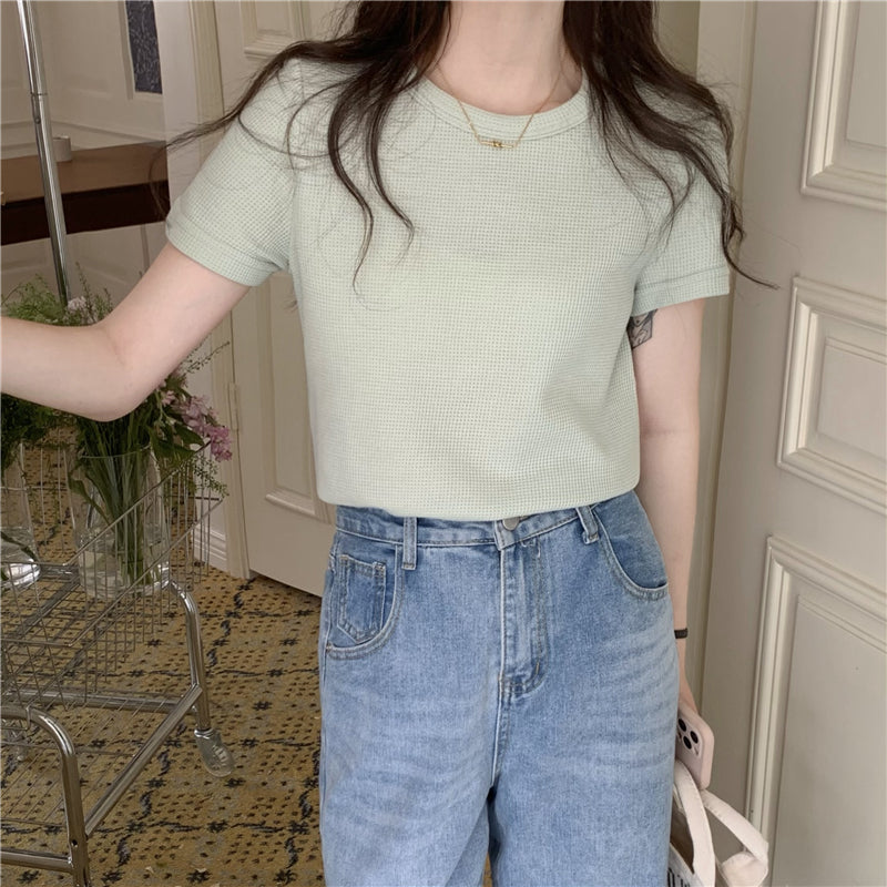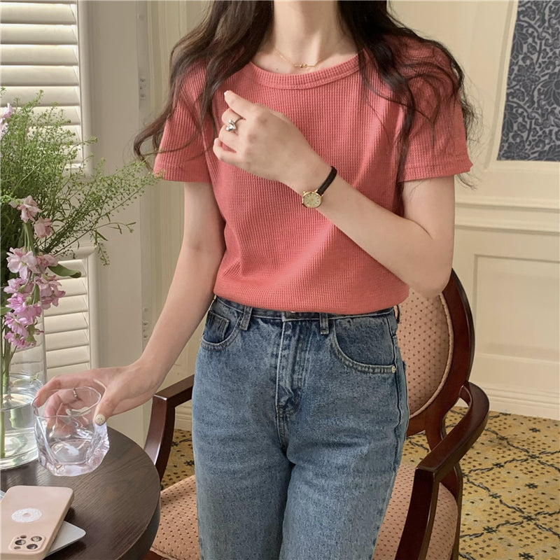 【F60338】實拍簡約圓領華夫格寬鬆T恤250408