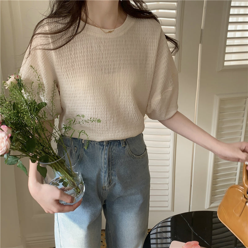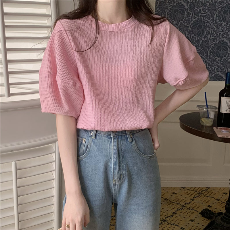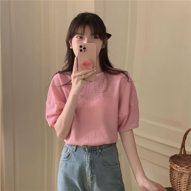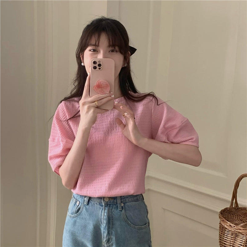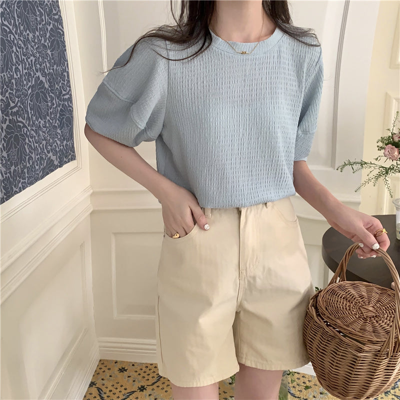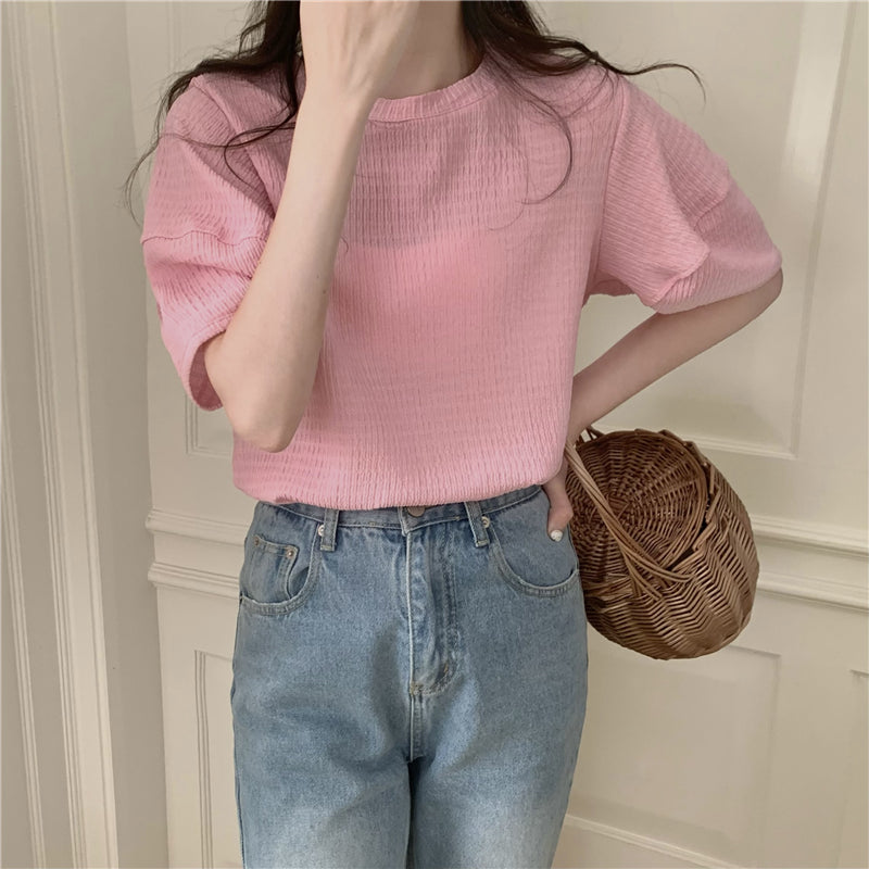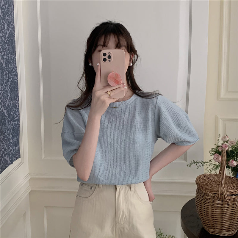 【F60340】實拍韓系簡約泡泡袖肌理短袖T250408