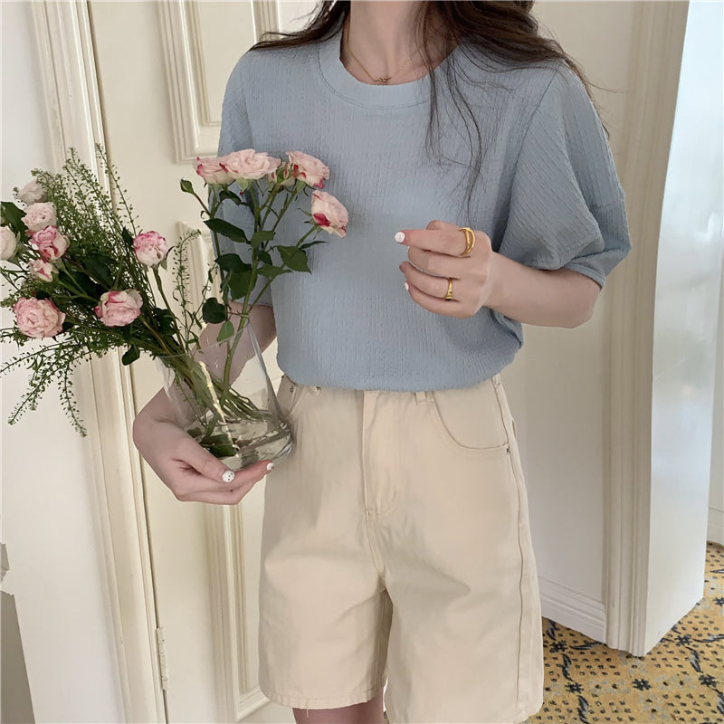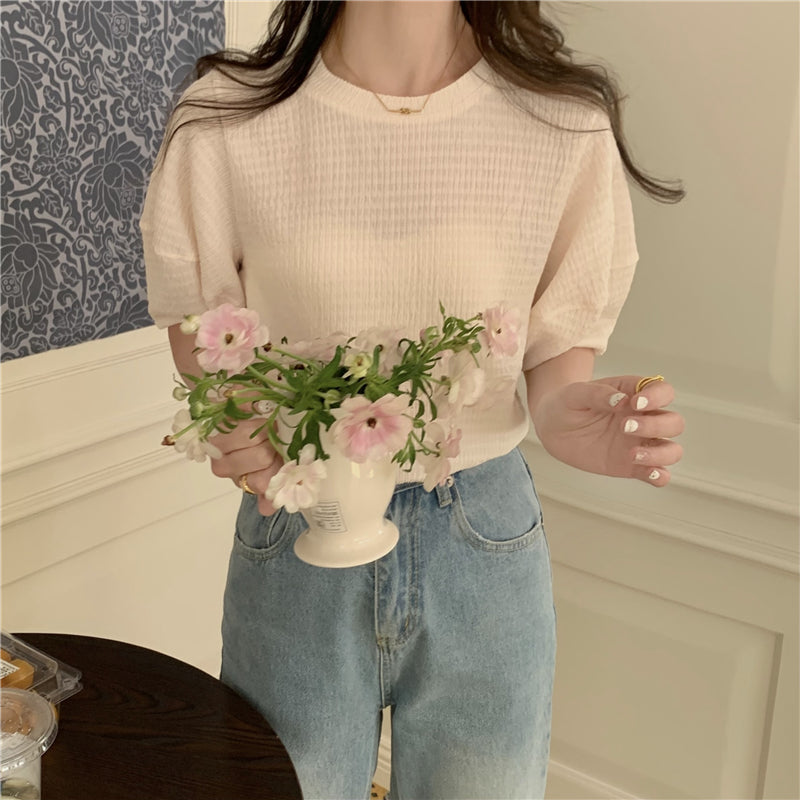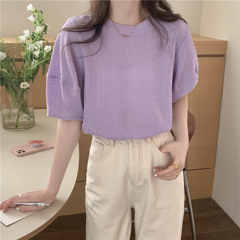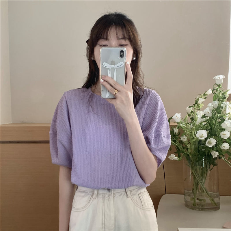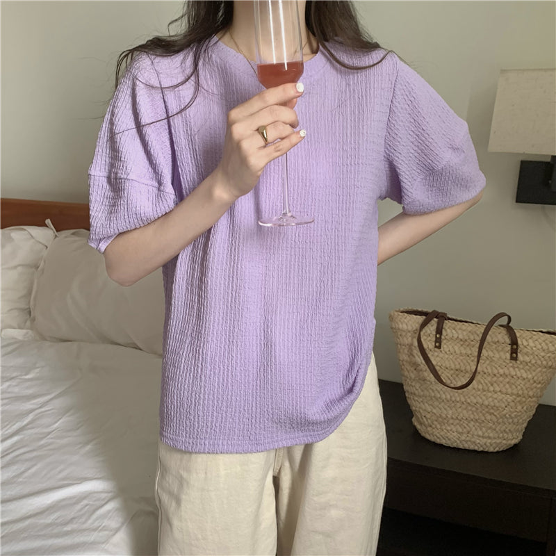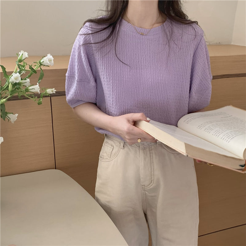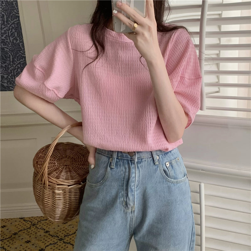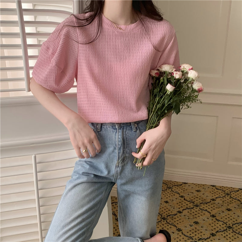 【F60340】實拍韓系簡約泡泡袖肌理短袖T250408