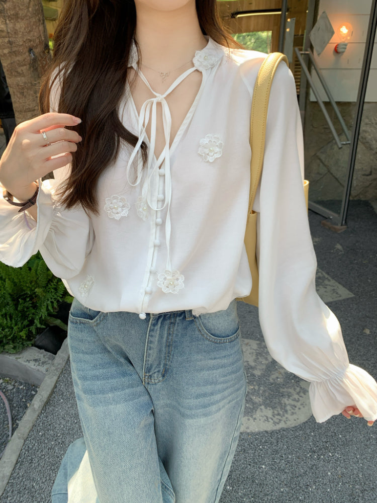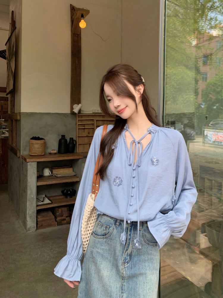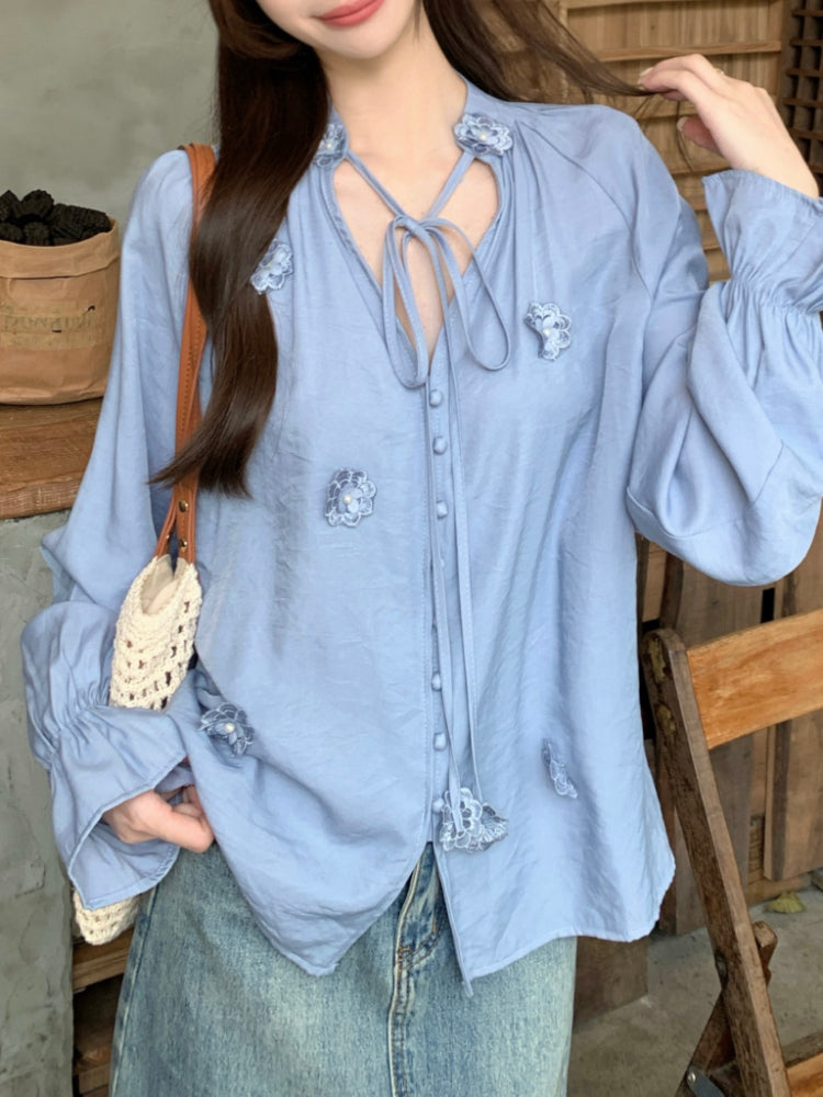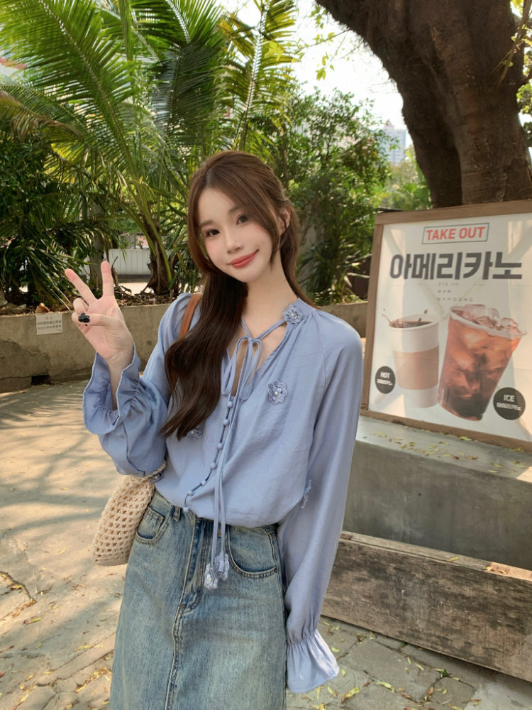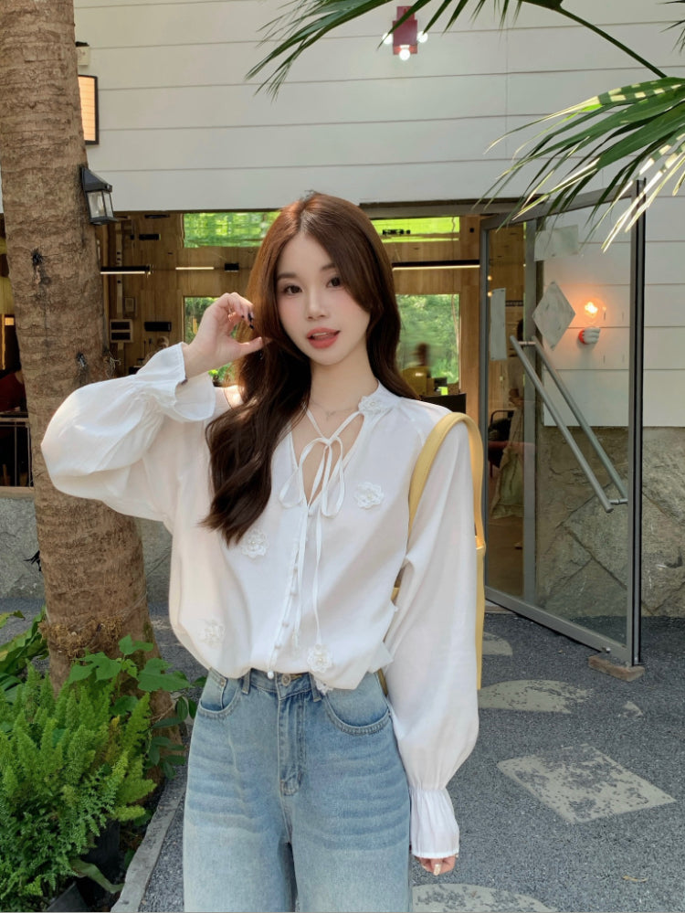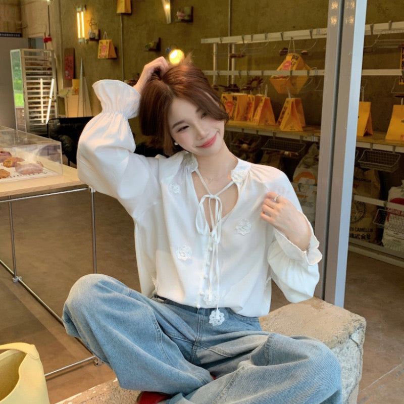 【F60342】實拍韓版春夏寬鬆繫帶立體花朵罩衫250408