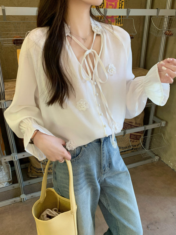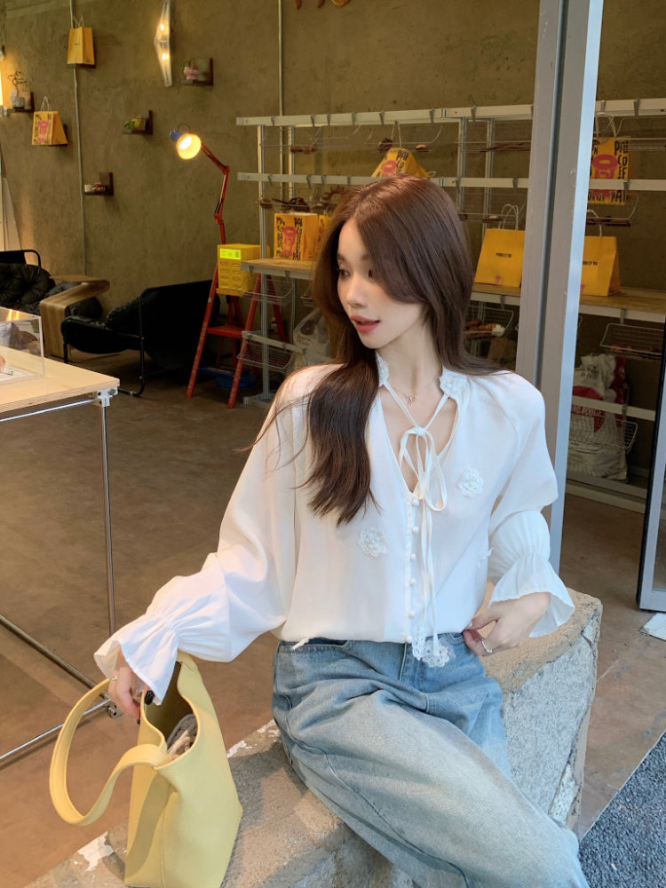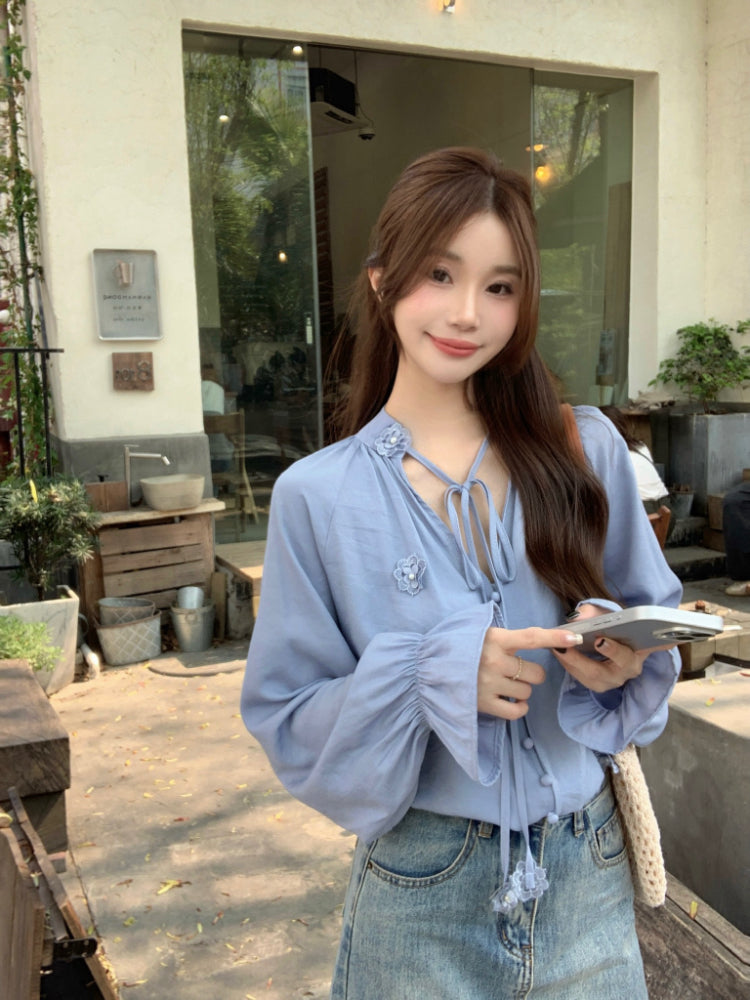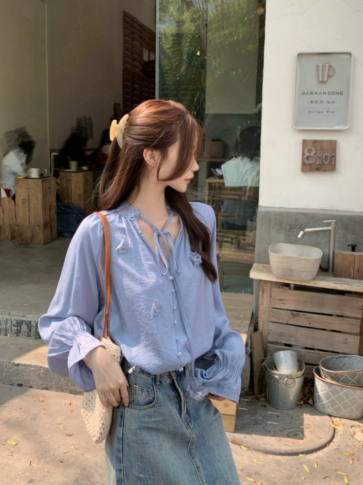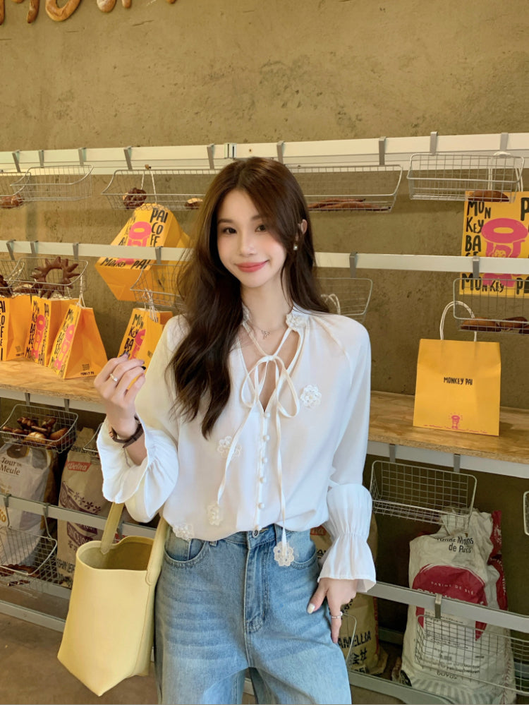 【F60342】實拍韓版春夏寬鬆繫帶立體花朵罩衫250408
