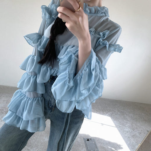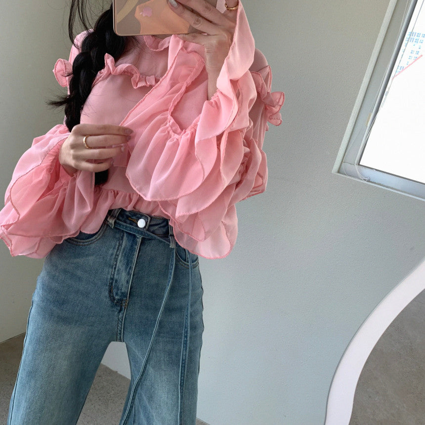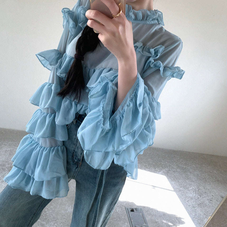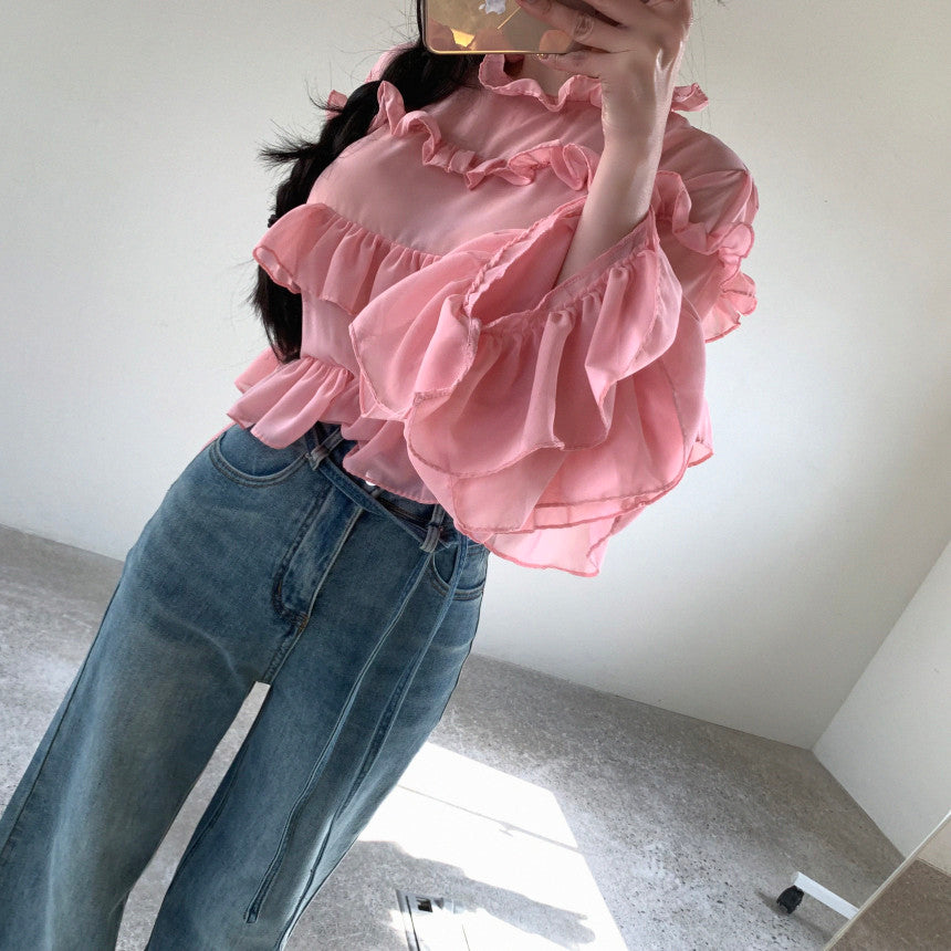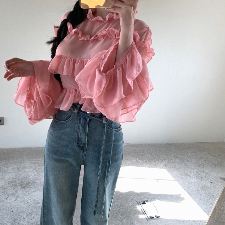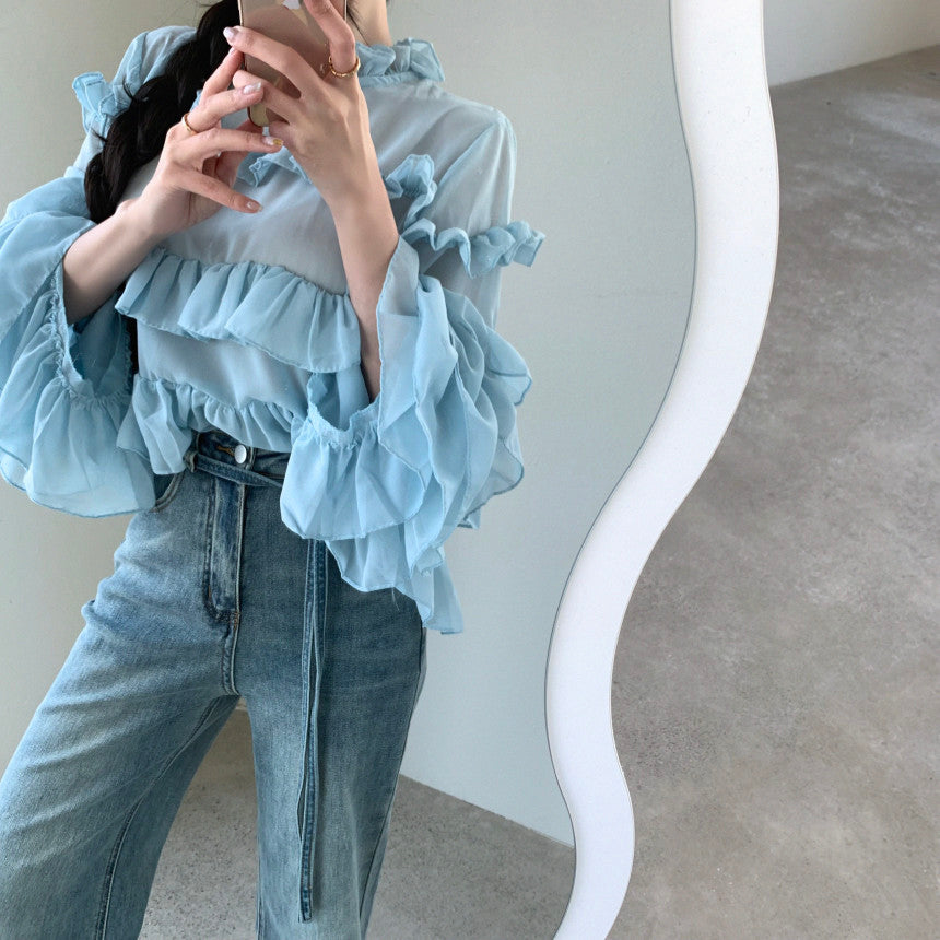 【F60350】韓國春夏輕熟浪漫大荷葉設計款立領襯衫250408
