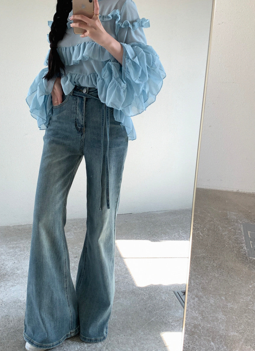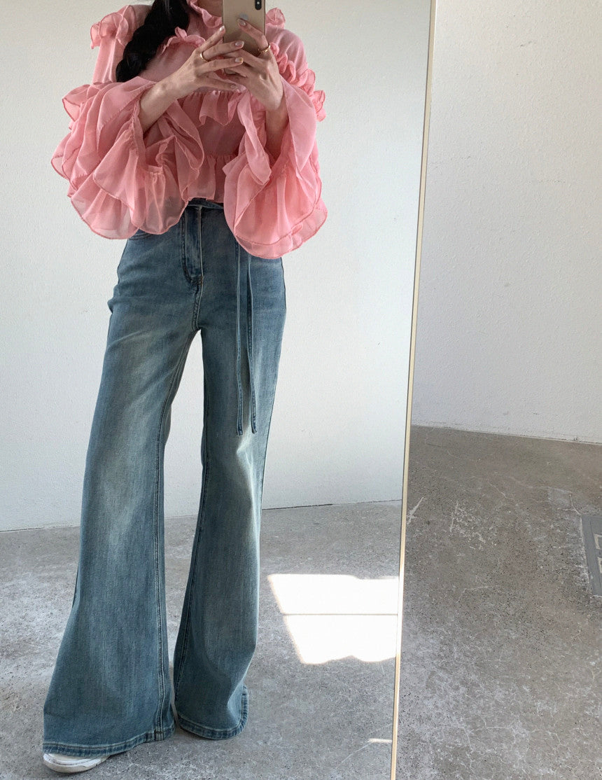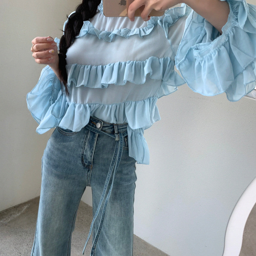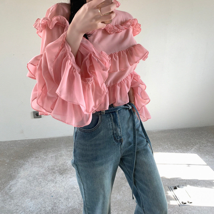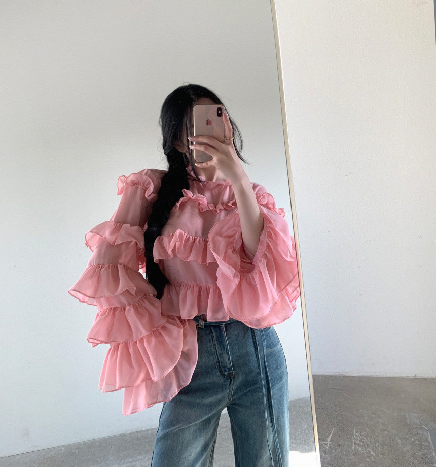 【F60350】韓國春夏輕熟浪漫大荷葉設計款立領襯衫250408