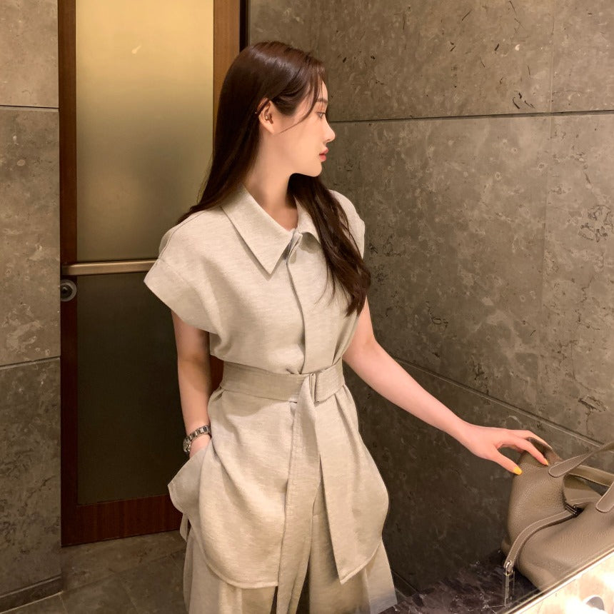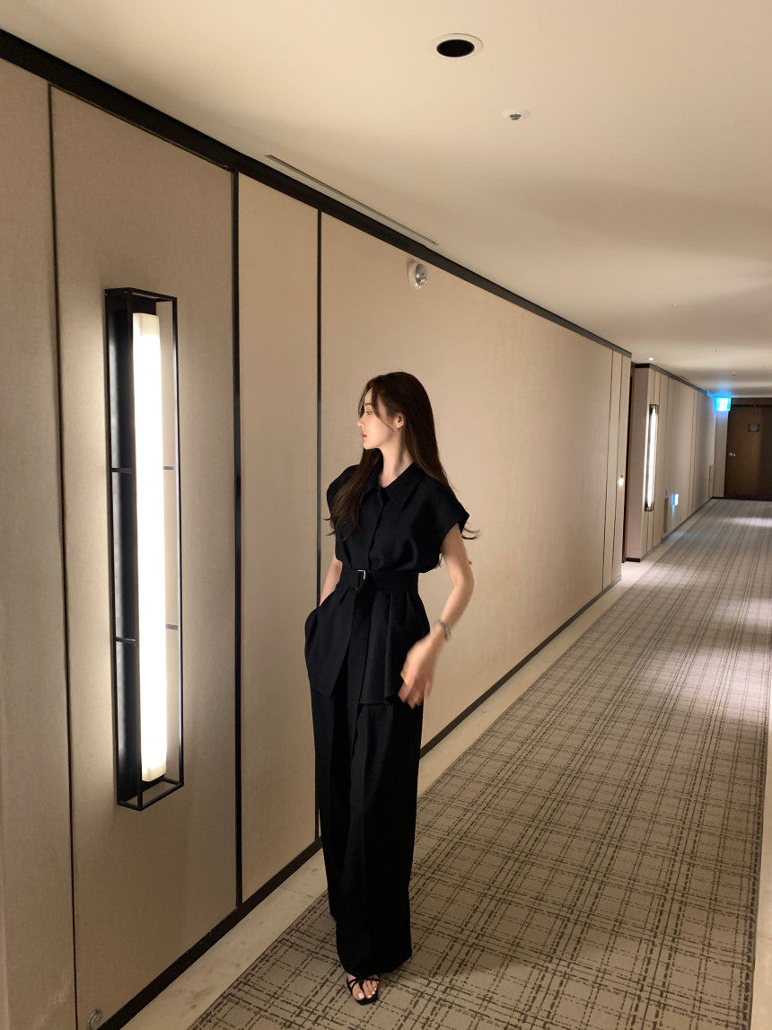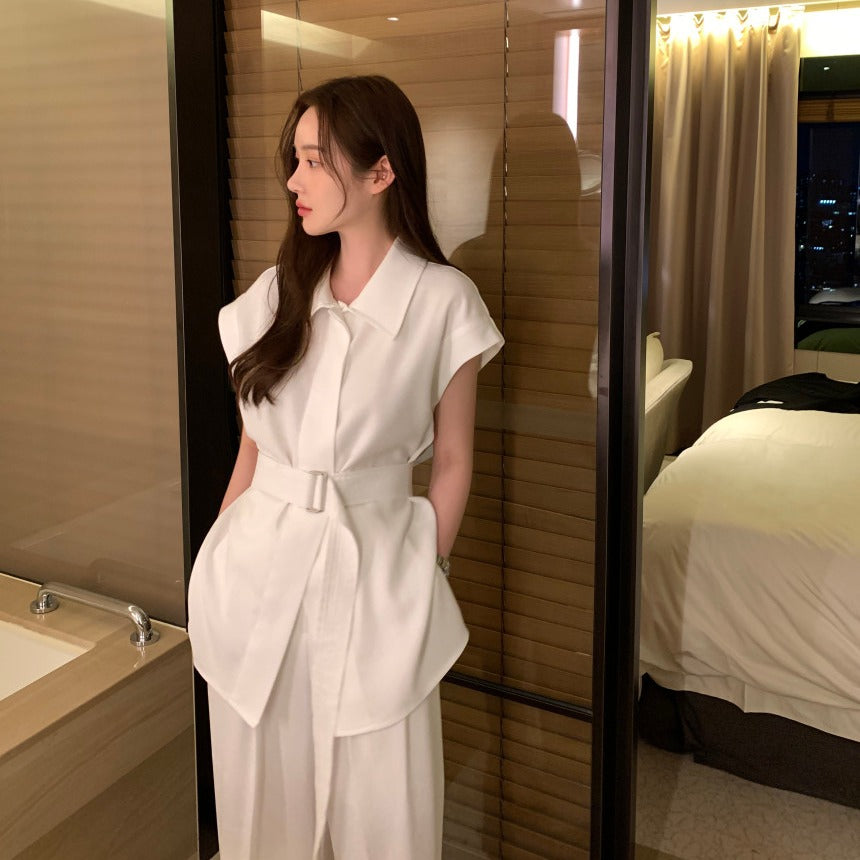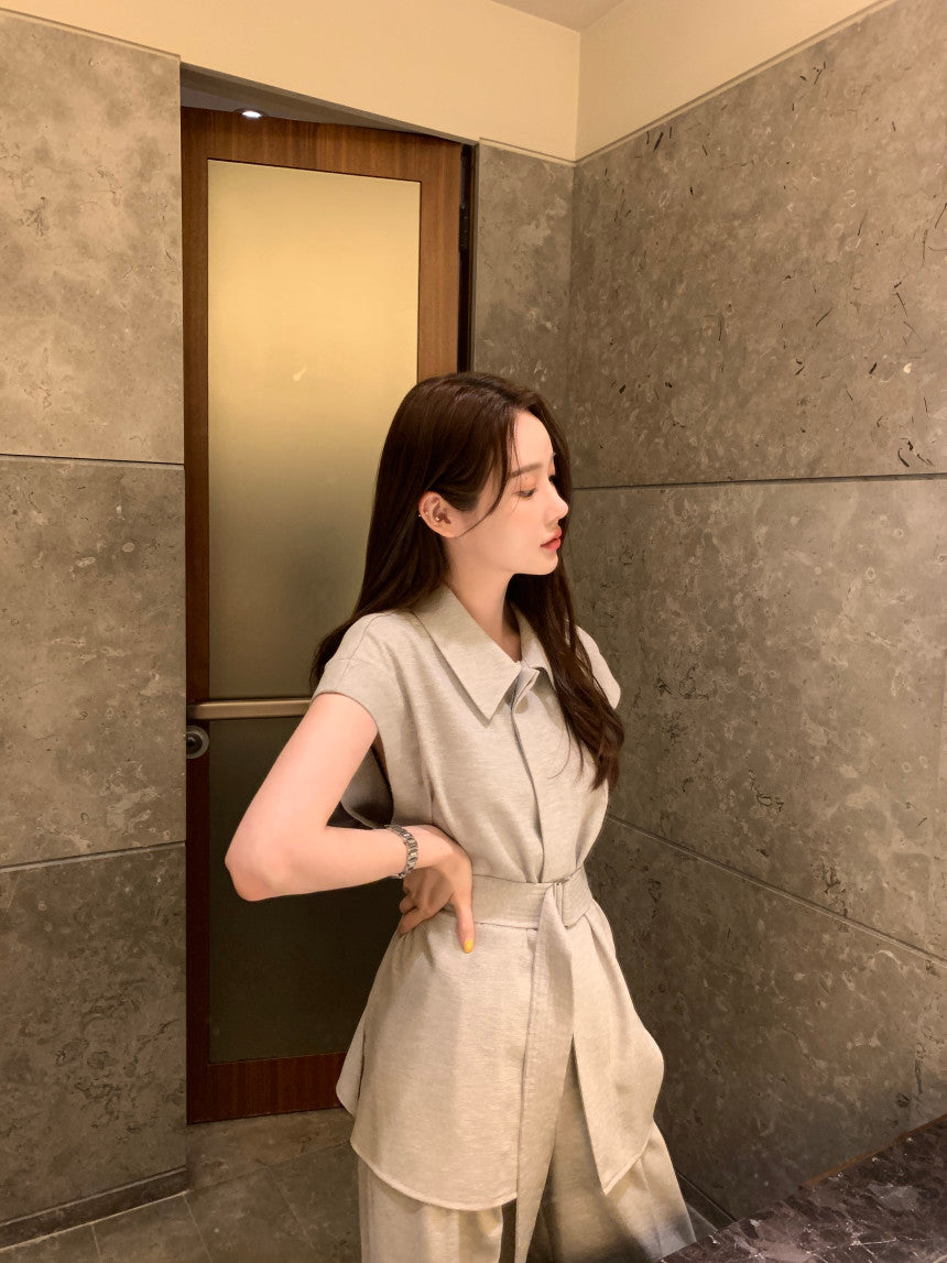 【F60356】夏季法式簡約繫帶襯衫+高腰闊腿褲 套裝250408