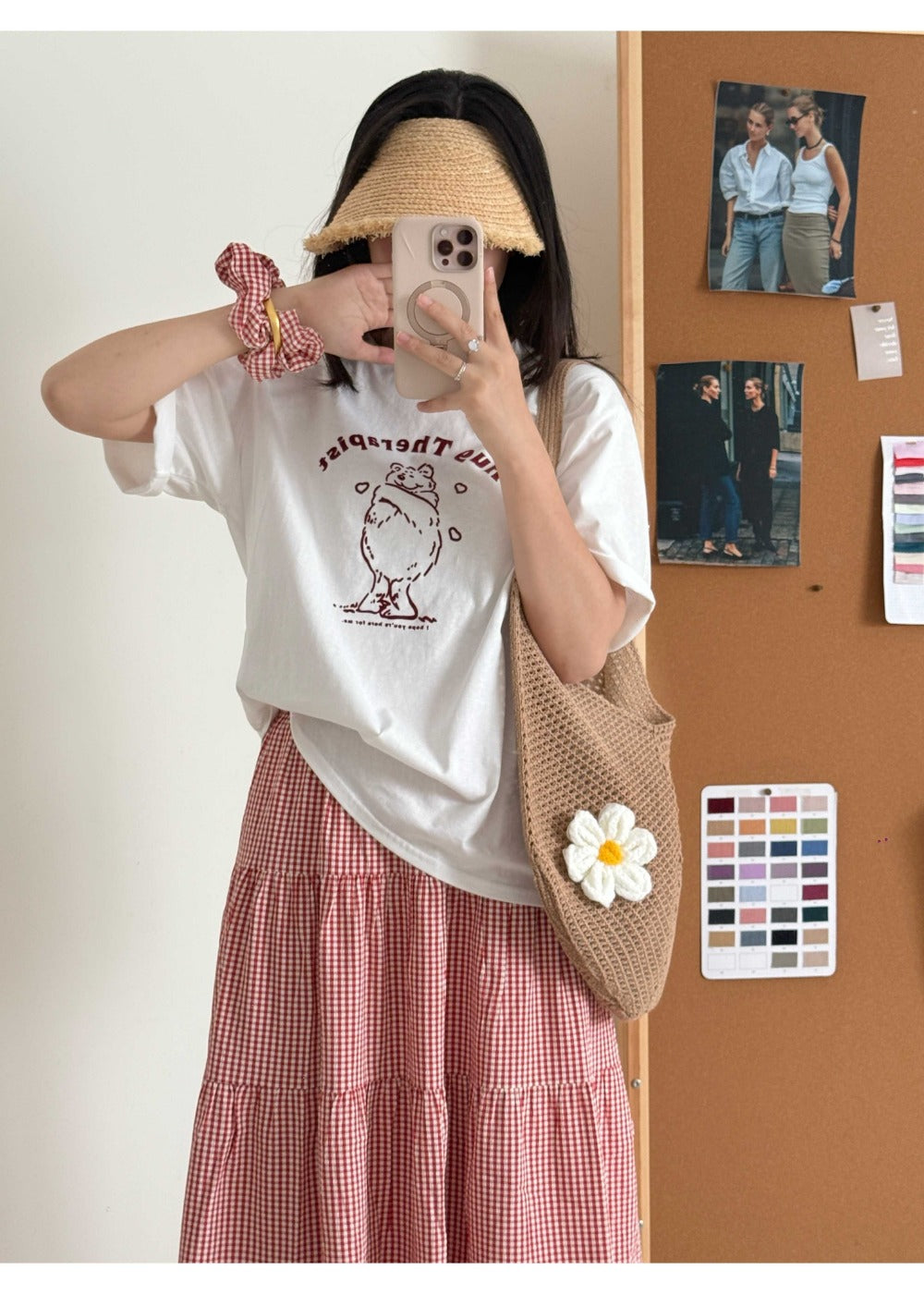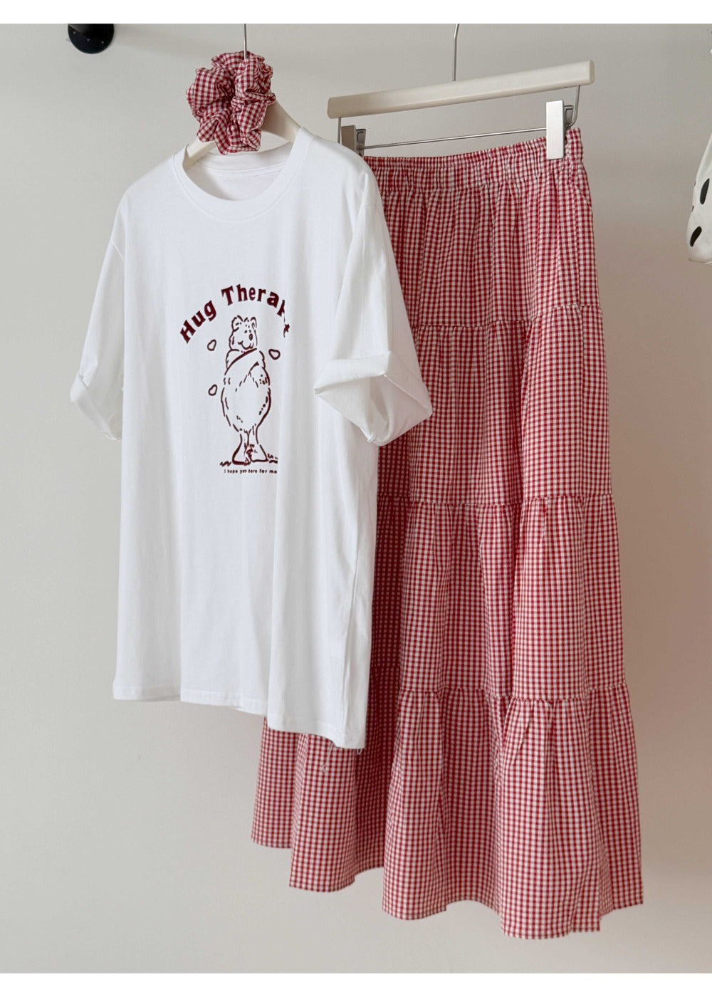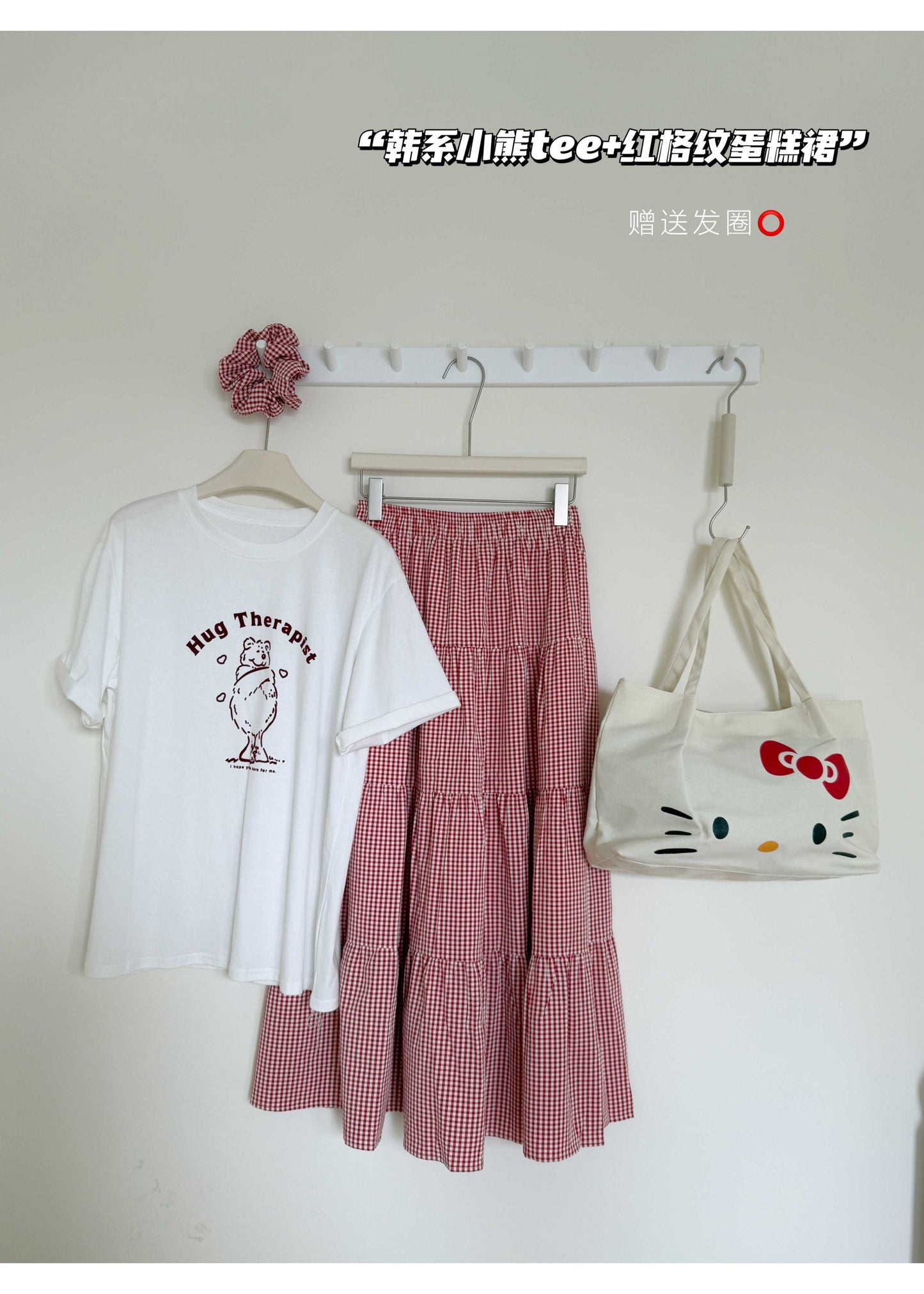 【F60359】實拍夏季寬鬆印花t恤+野餐紅格a字裙+髮圈250512