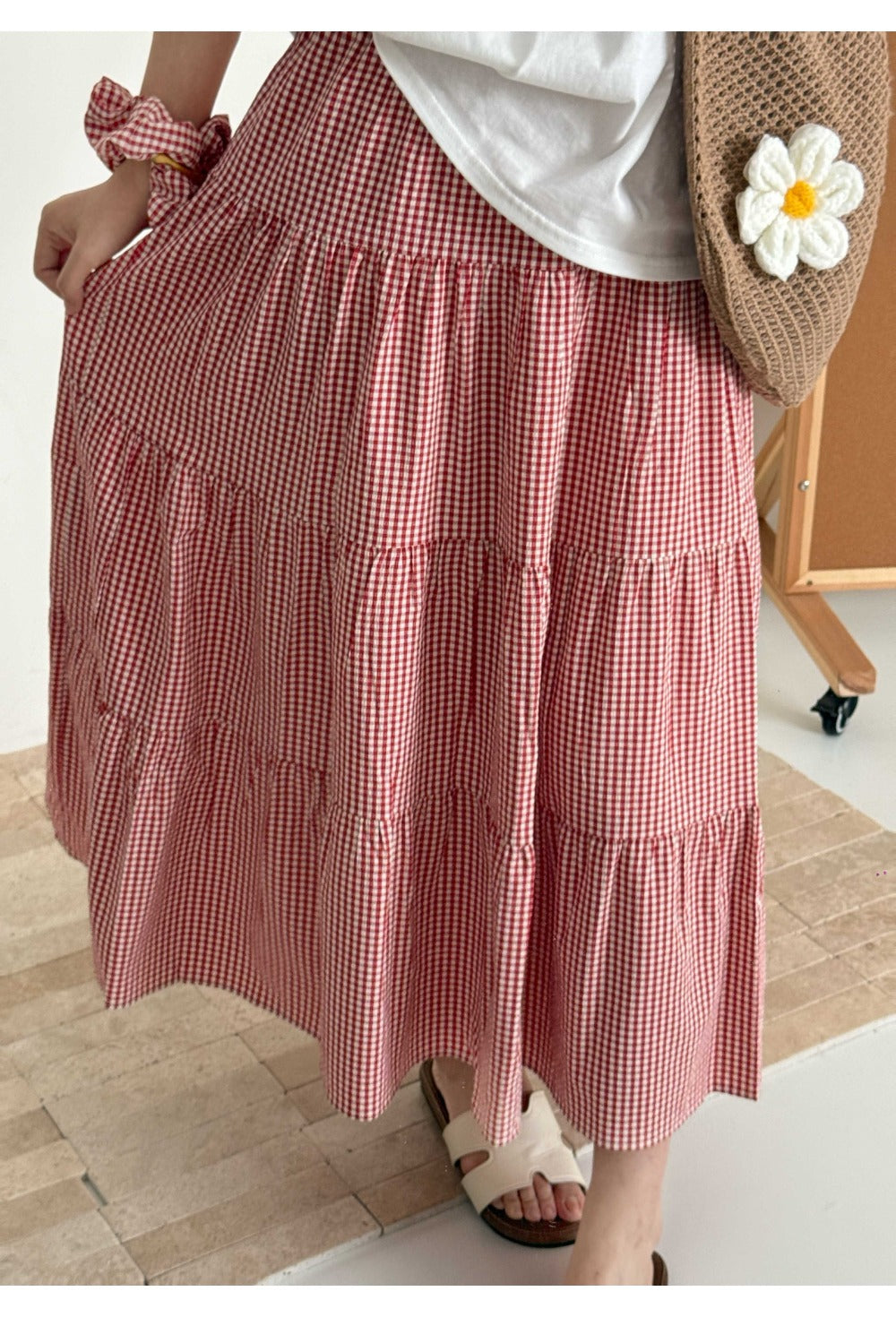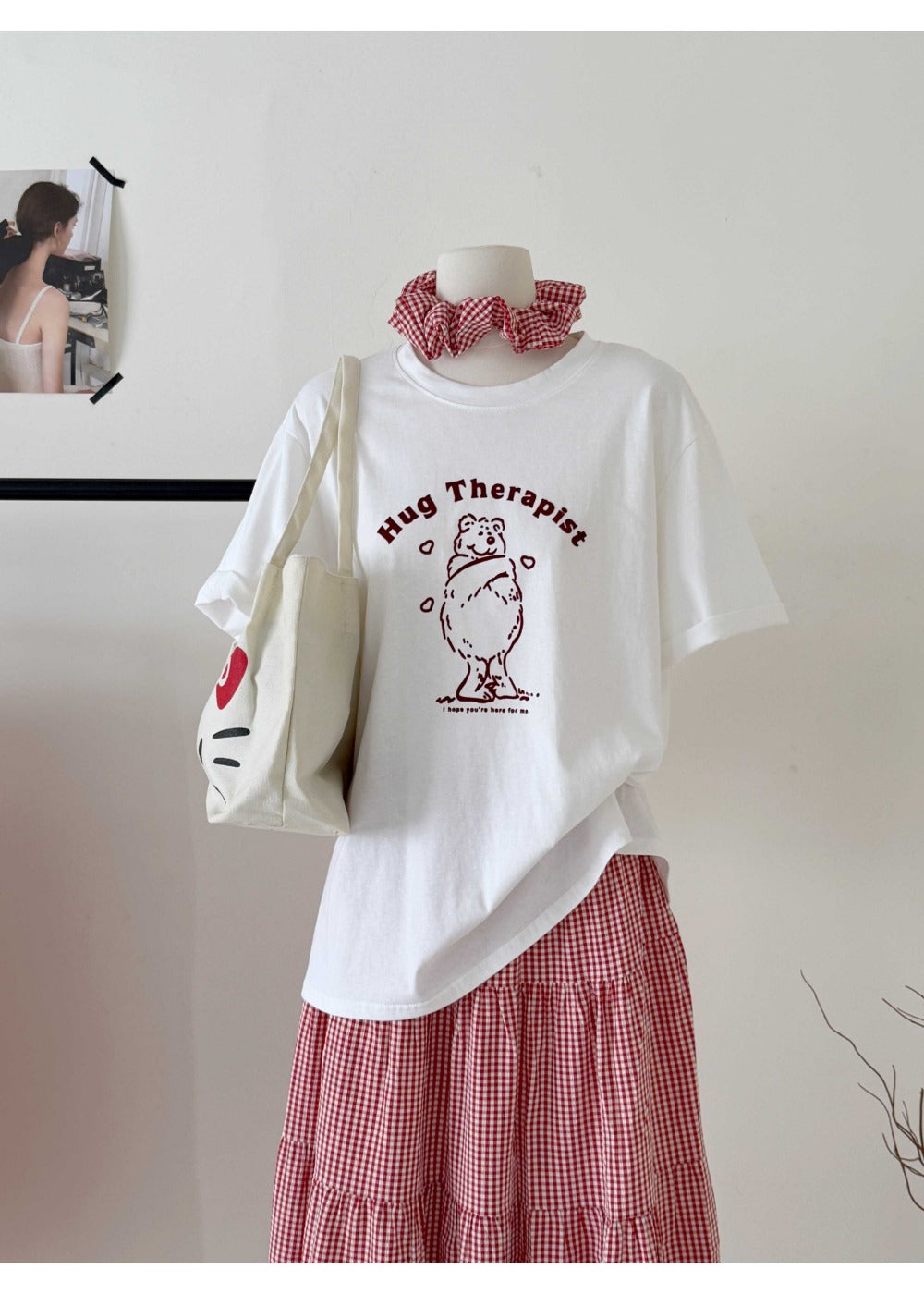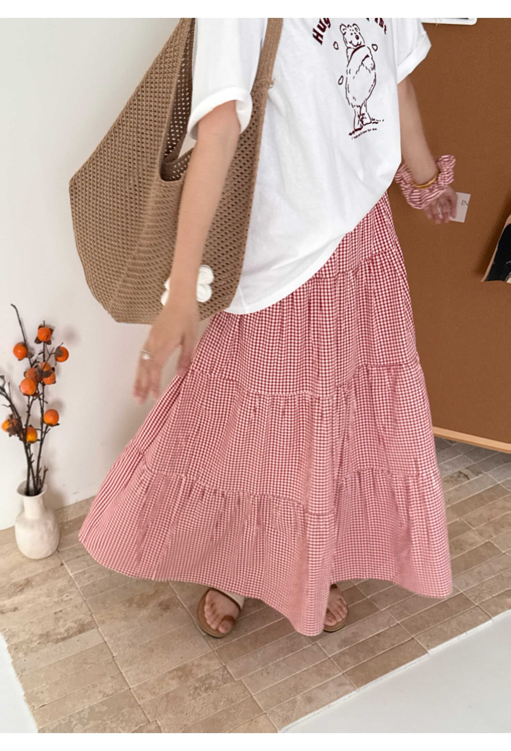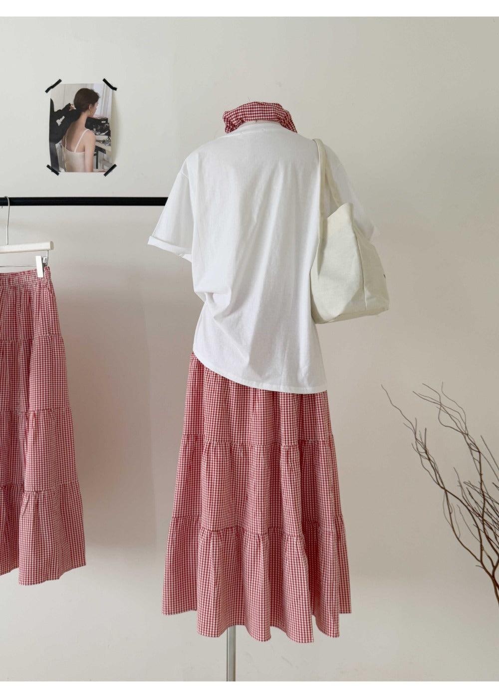 【F60359】實拍夏季寬鬆印花t恤+野餐紅格a字裙+髮圈250512