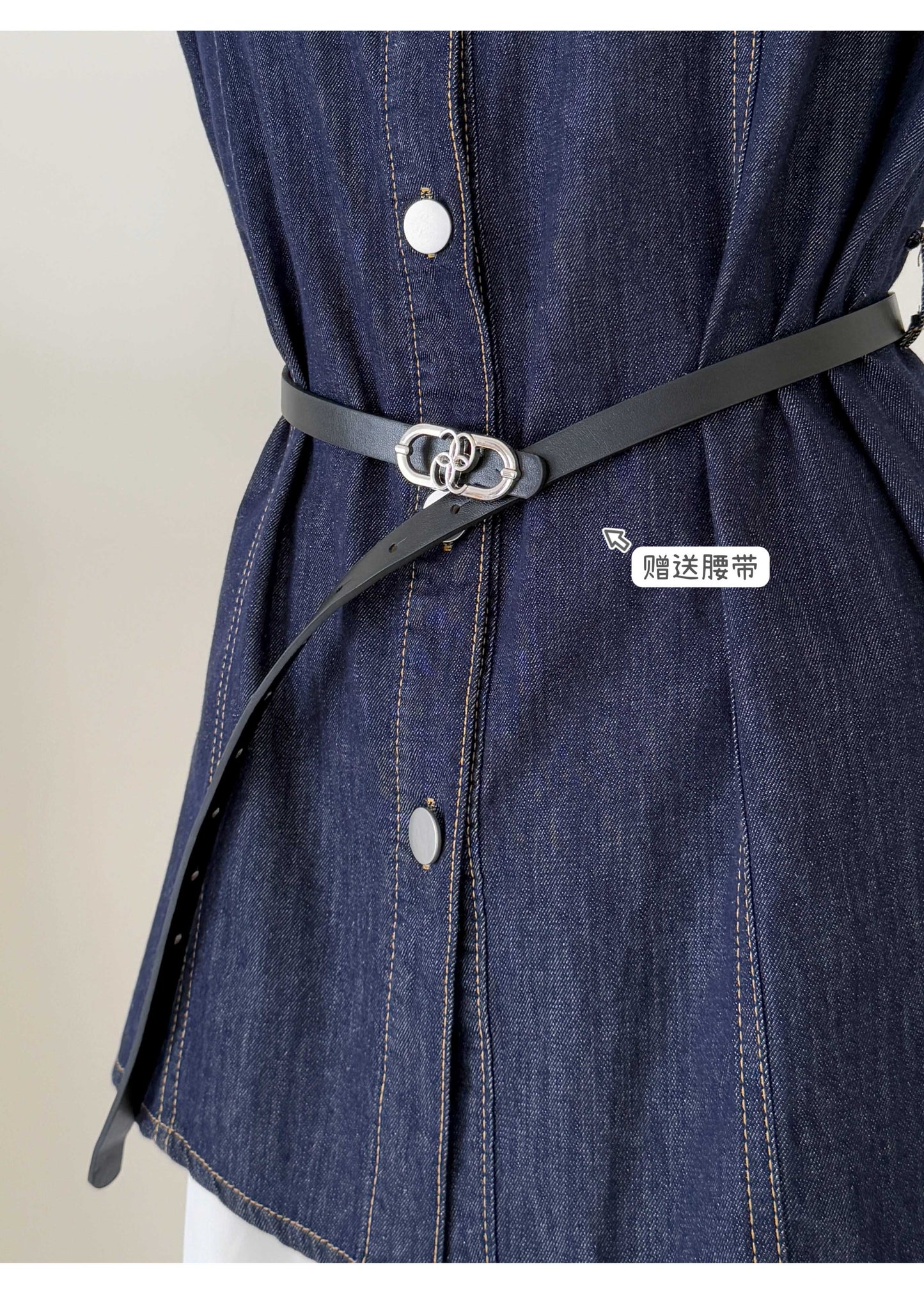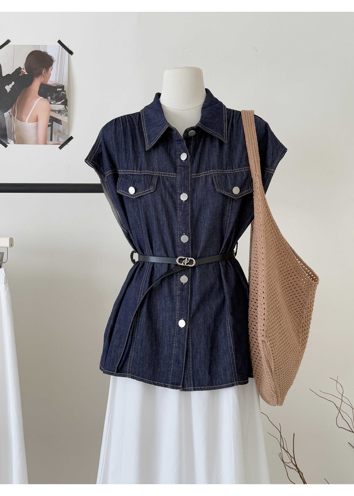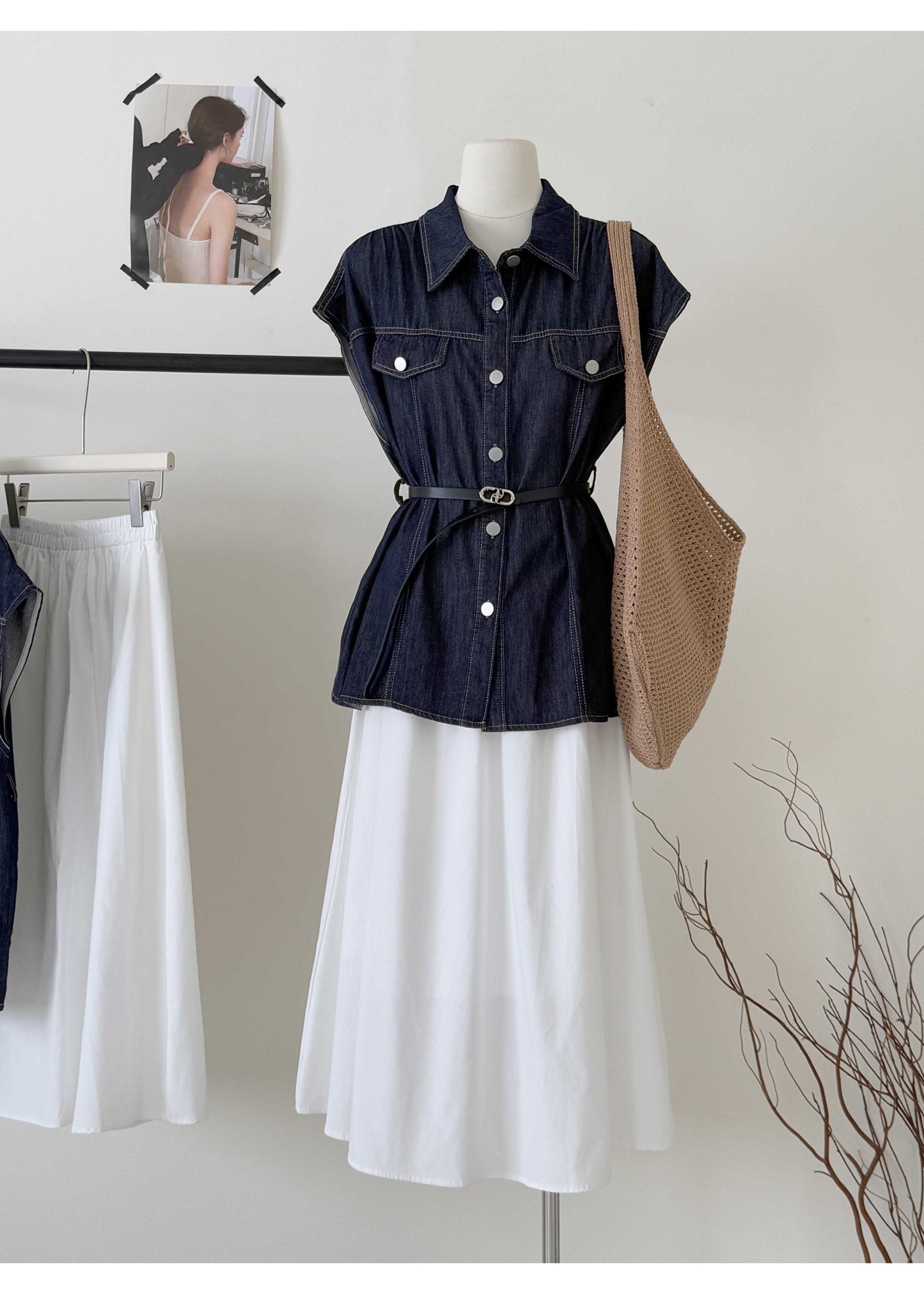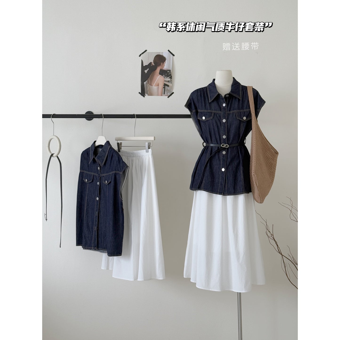 【F60364】夏季小眾設計感套裝|牛仔襯衫+高腰a字裙含腰帶250512