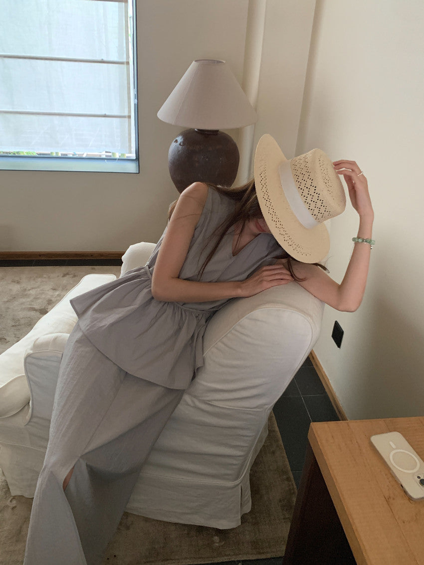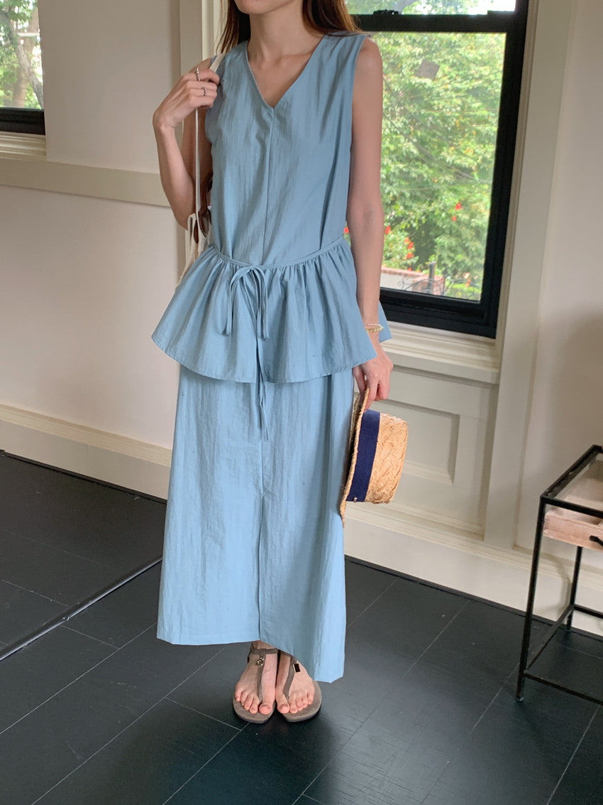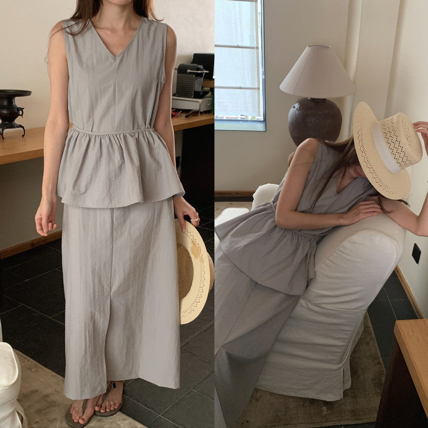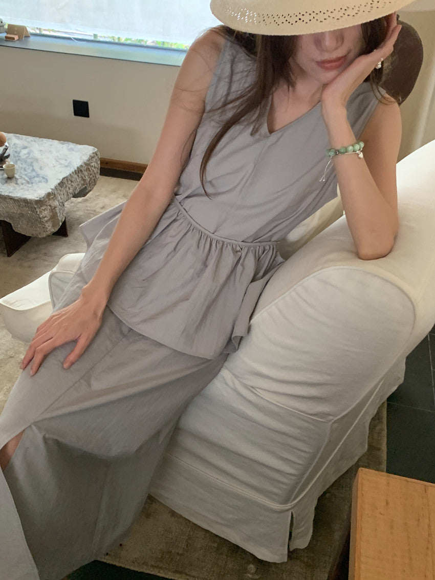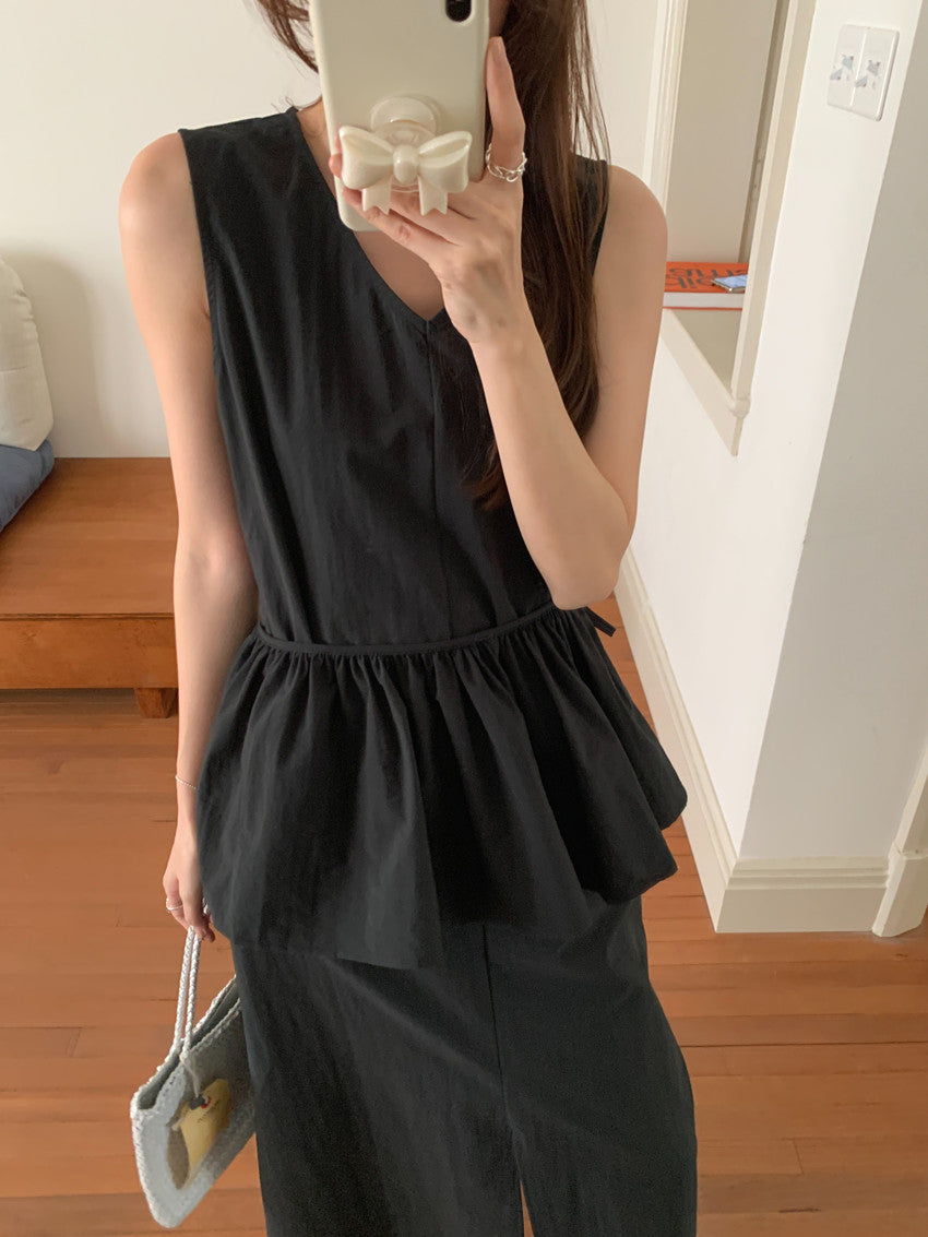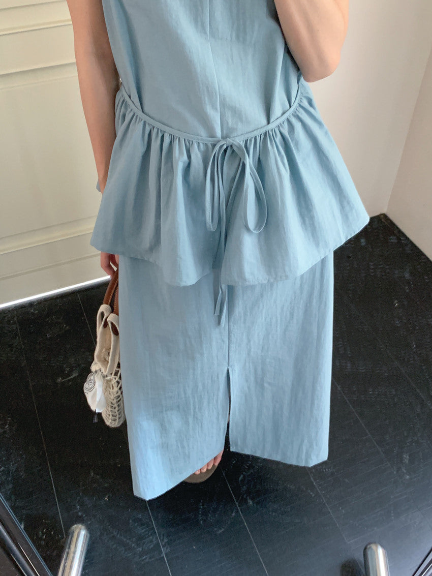 【F60380】實拍夏季簡約長版開叉洋裝+甜美荷葉可拆裙擺250512