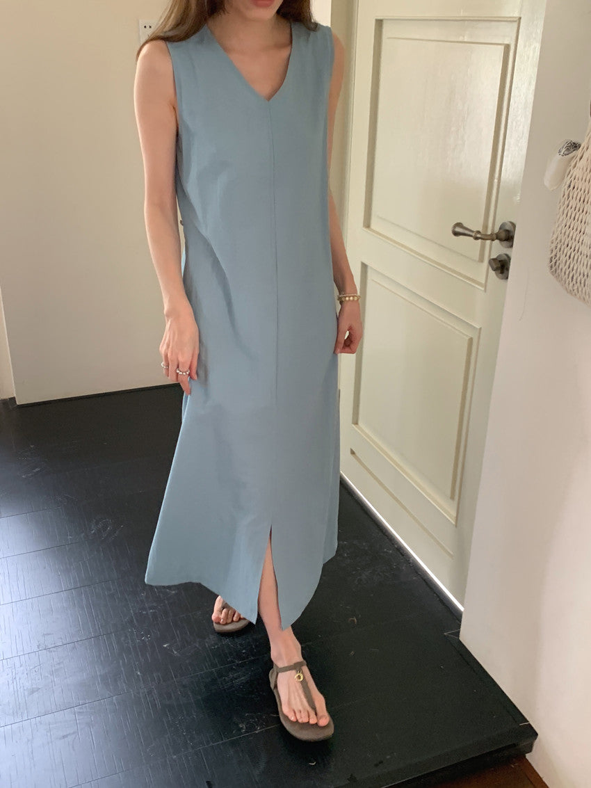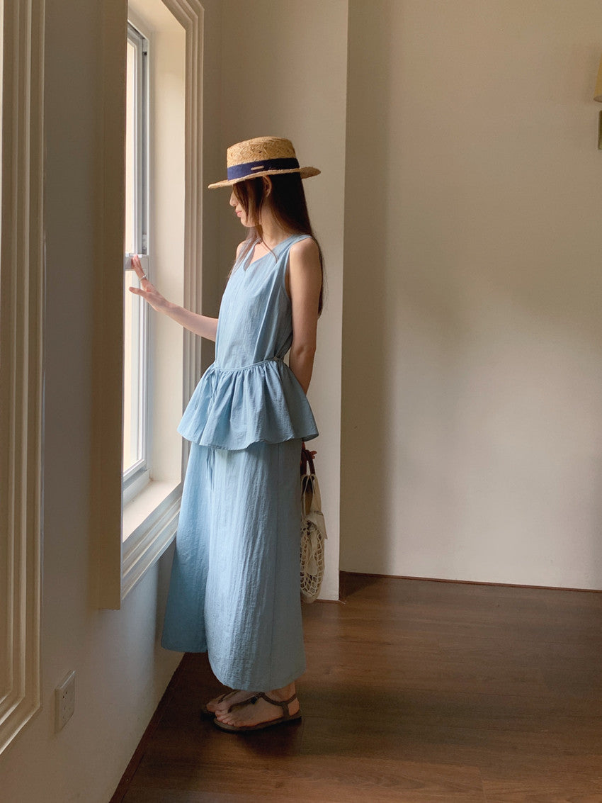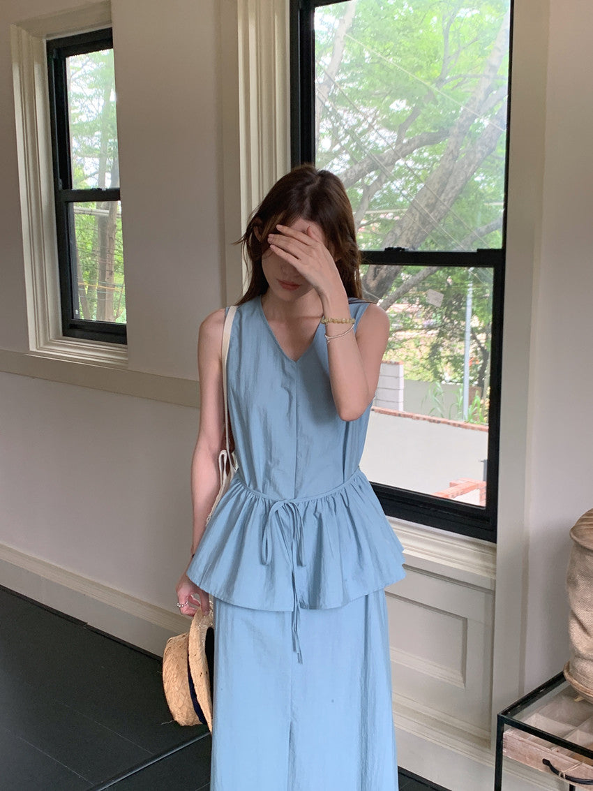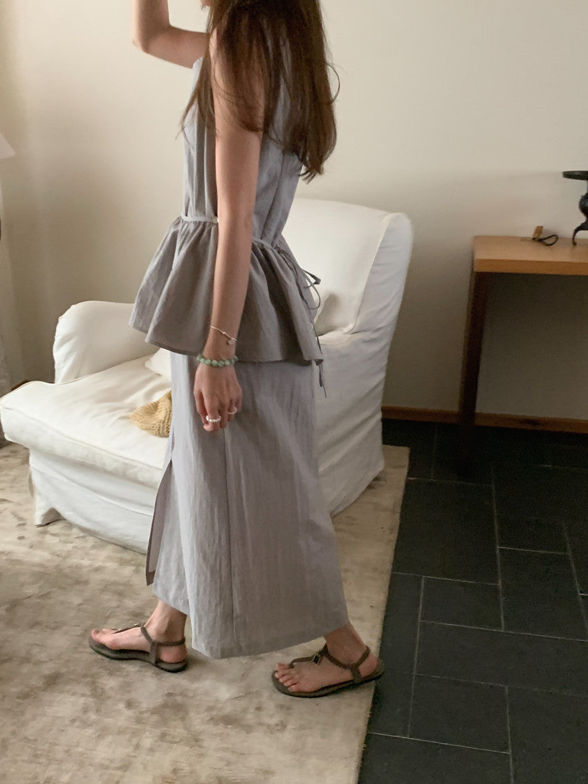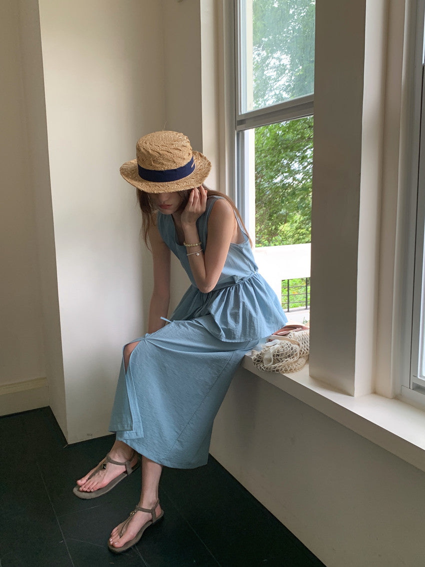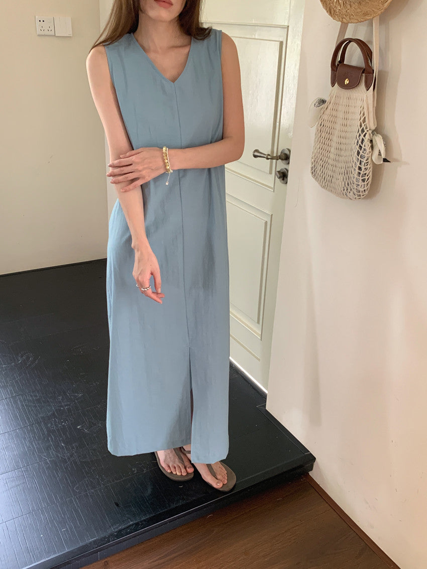 【F60380】實拍夏季簡約長版開叉洋裝+甜美荷葉可拆裙擺250512