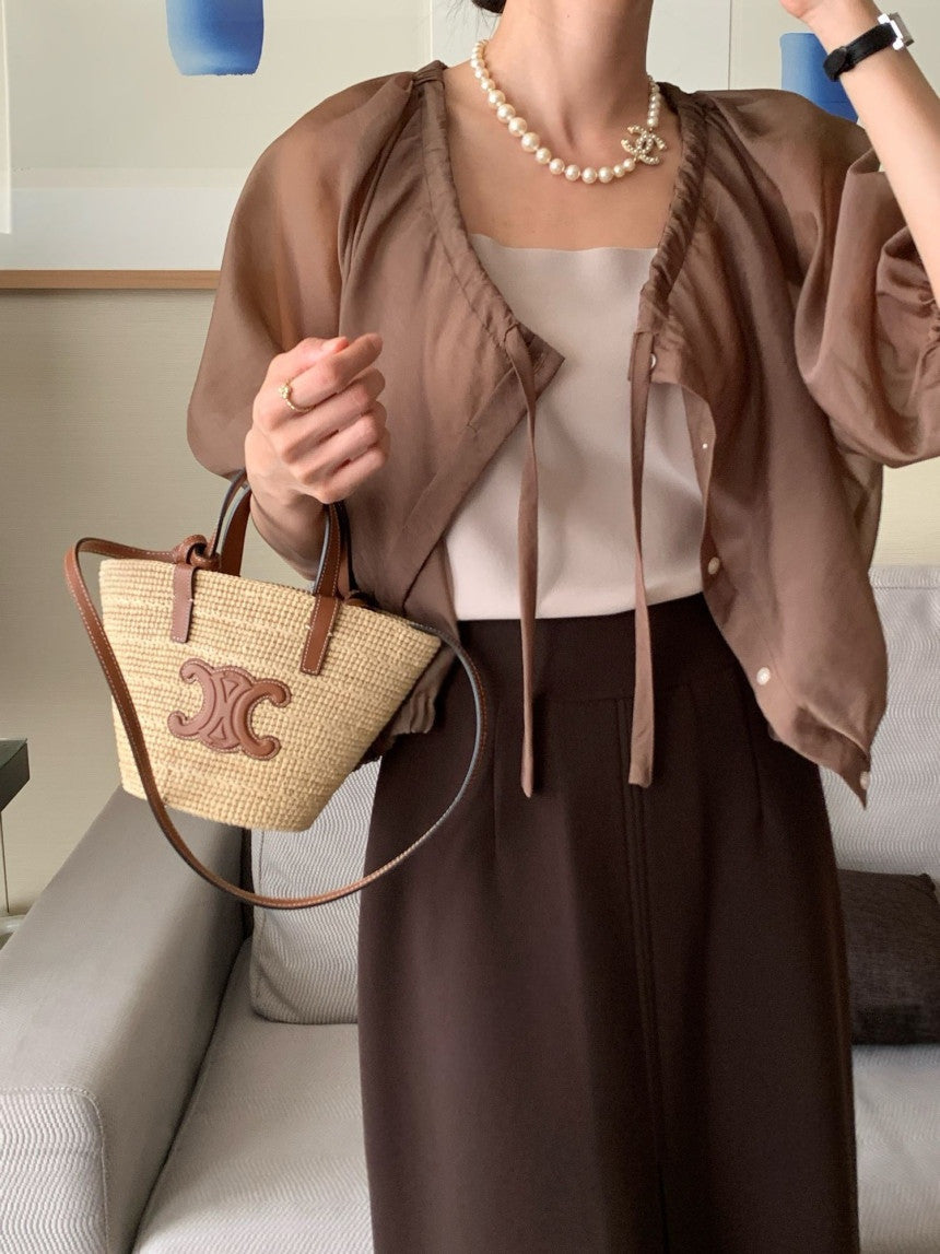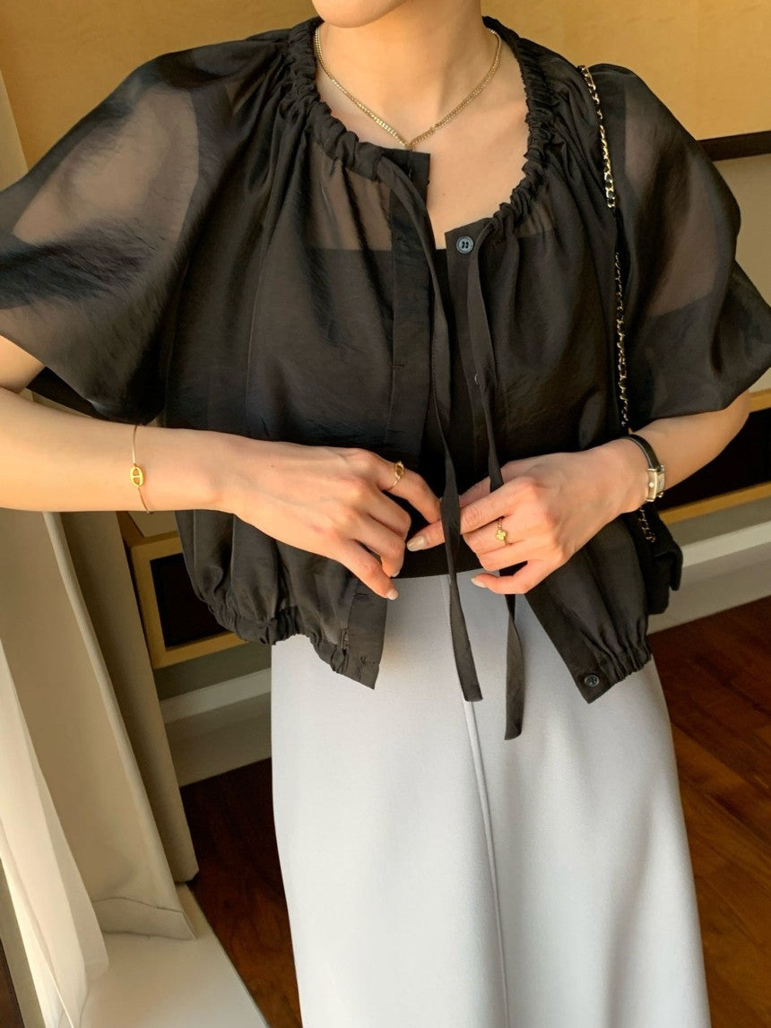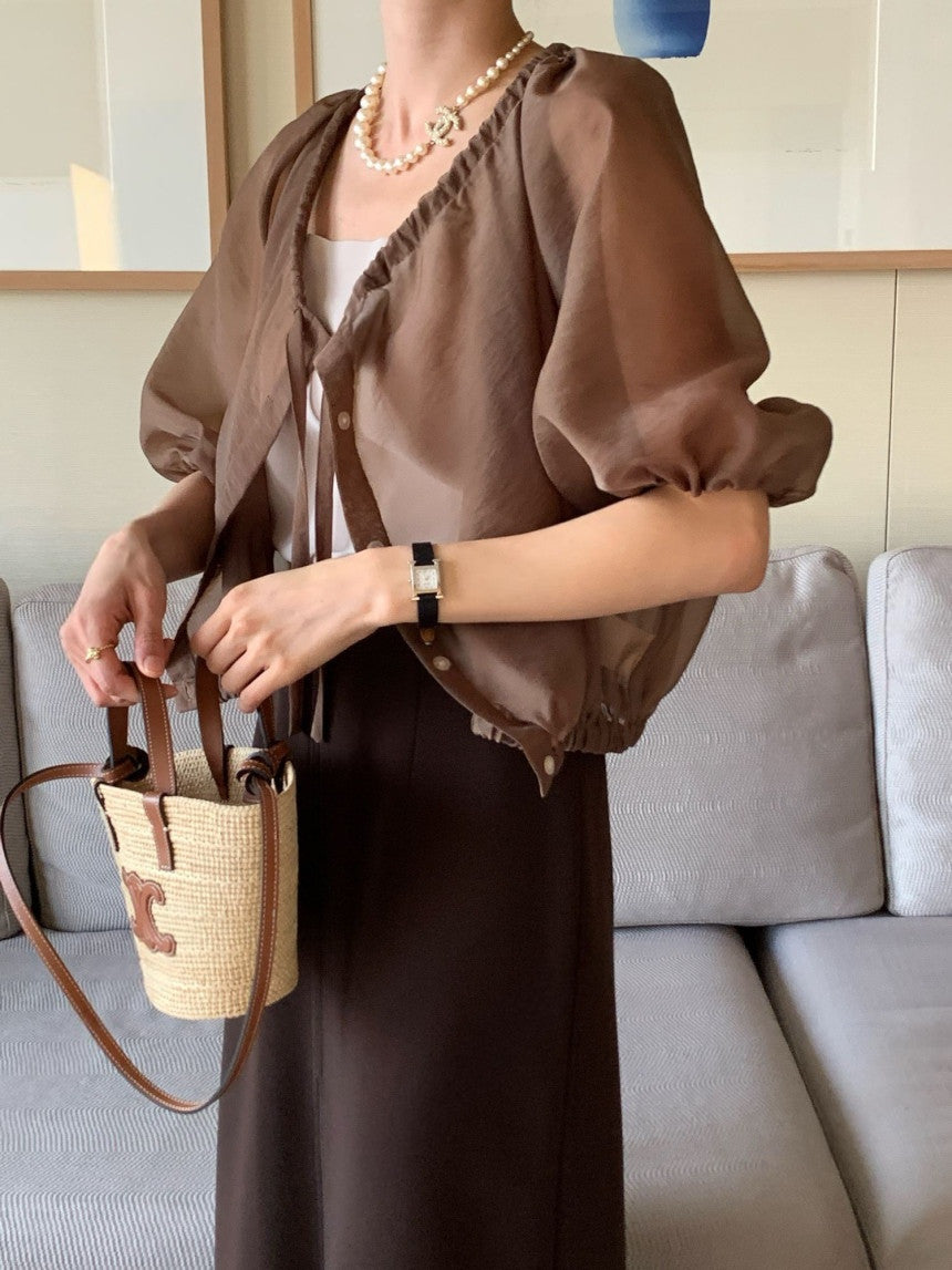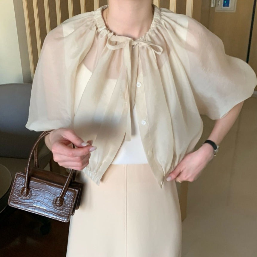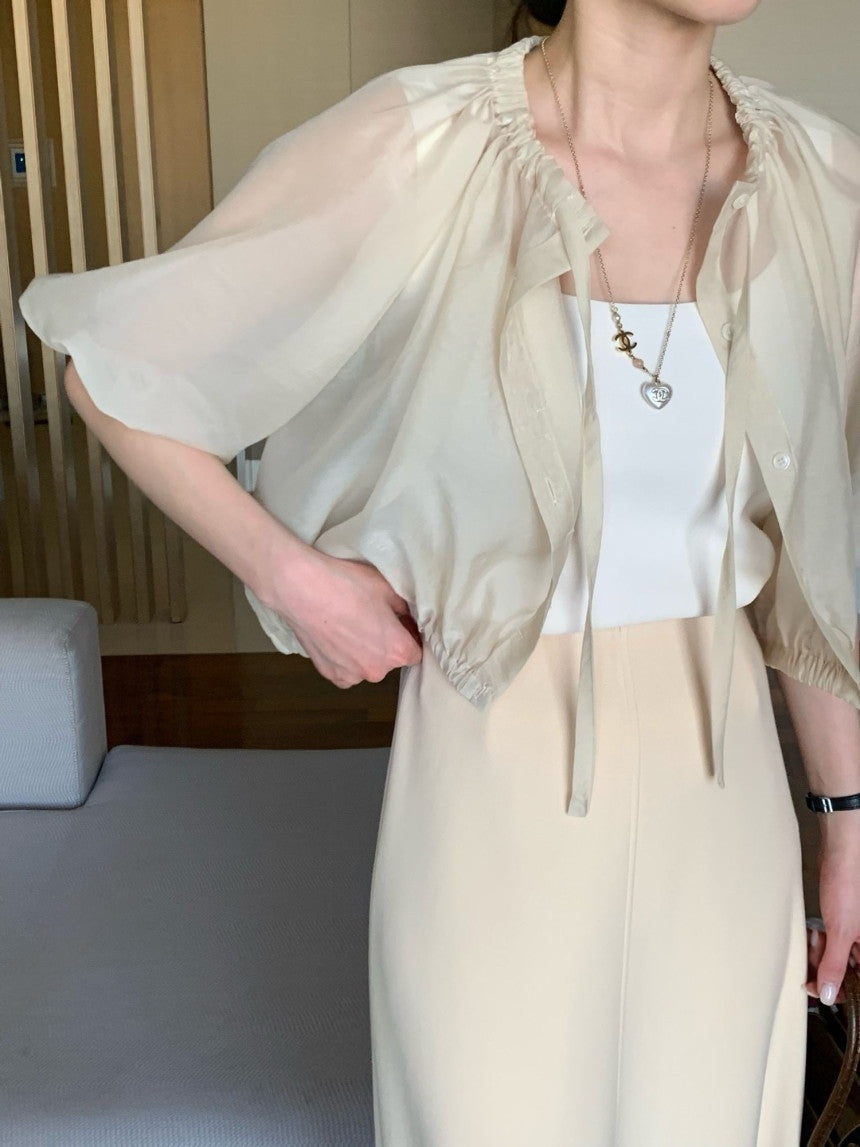 【F60381】實拍夏季氣質防曬外套|法式抽繩設計+微透雪紡罩衫250512